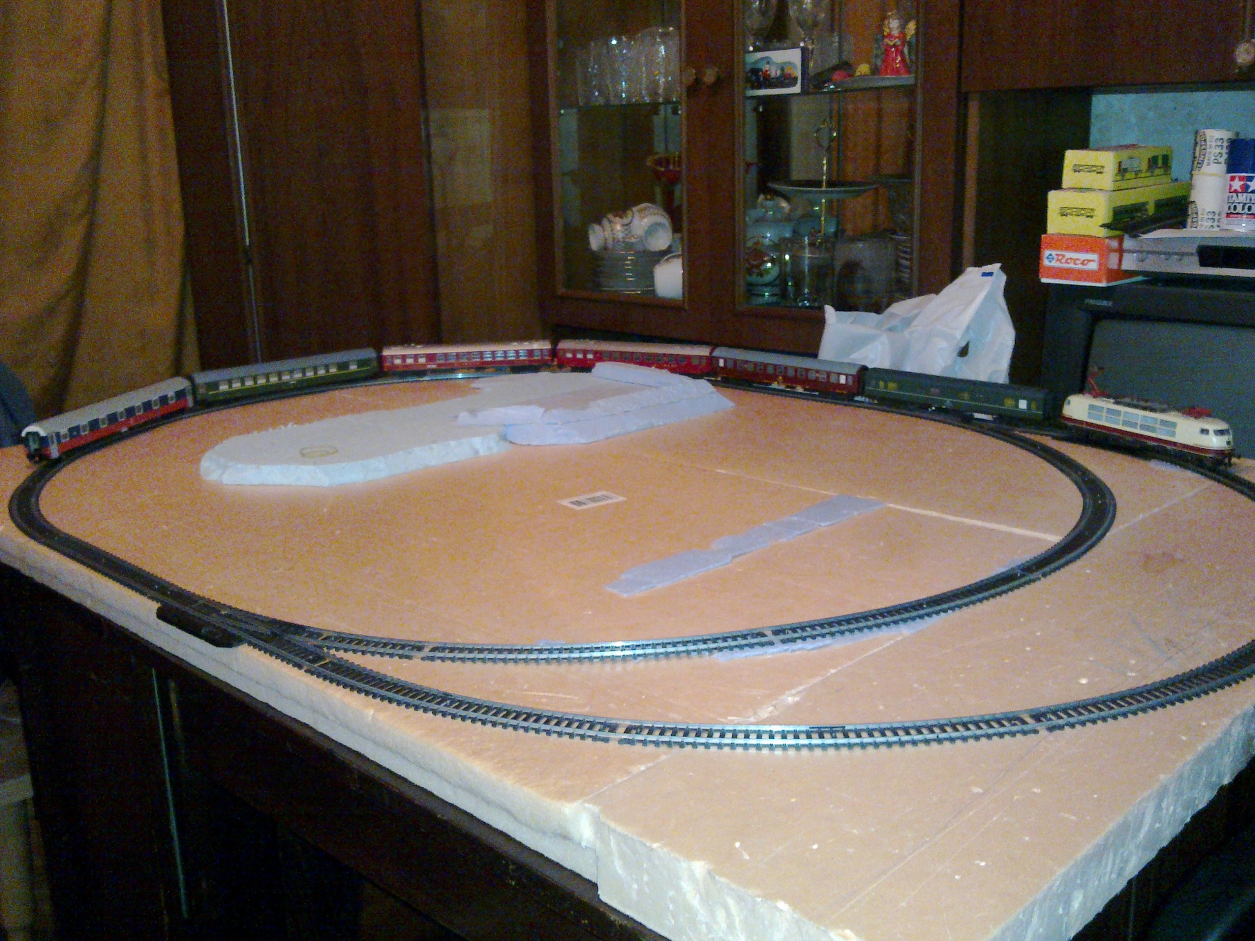 В какой-то момент надоело на полу раскладывать рельсы. В качестве "подмакетника" взял плиту утепления, из пенополистирола. Дешевая, легко обрабатывается и вес маленький. Прячется за компьютерный стол, никому не мешает.