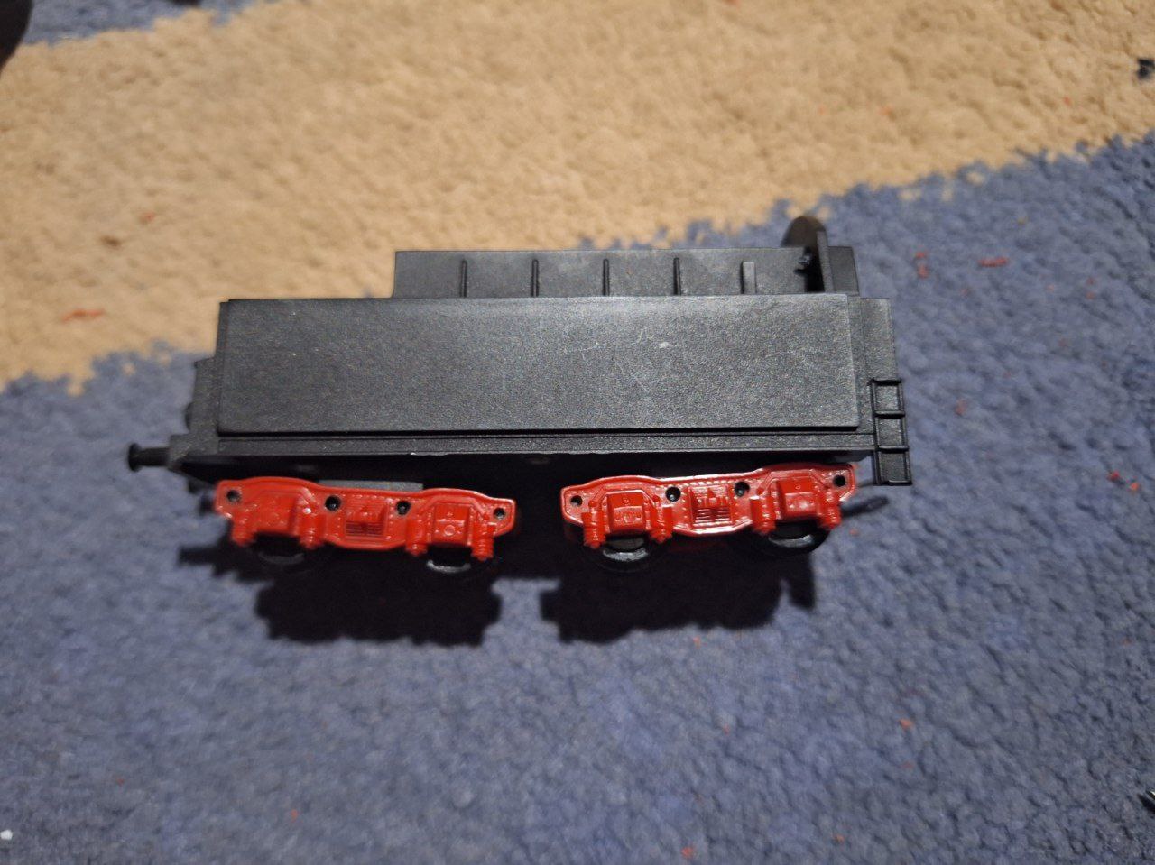 Купив ще один такий вагон. Пофарбував колеса акриловою фарбою в червоний. В принципі вони натужно стають в візки, але не обертаються вільно, думаю "розробляться". Капнув олії, крутяться помітно краще.