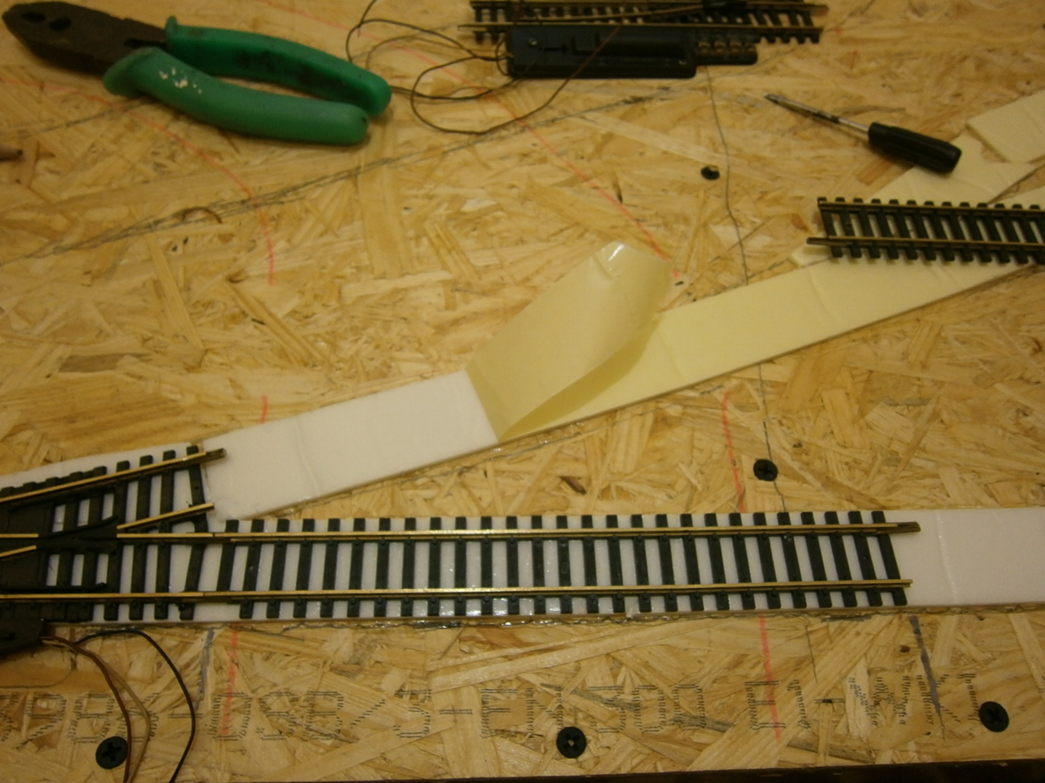 В какой-то момент надоело на полу раскладывать рельсы. В качестве "подмакетника" взял плиту утепления, из пенополистирола. Дешевая, легко обрабатывается и вес маленький. Прячется за компьютерный стол, никому не мешает.