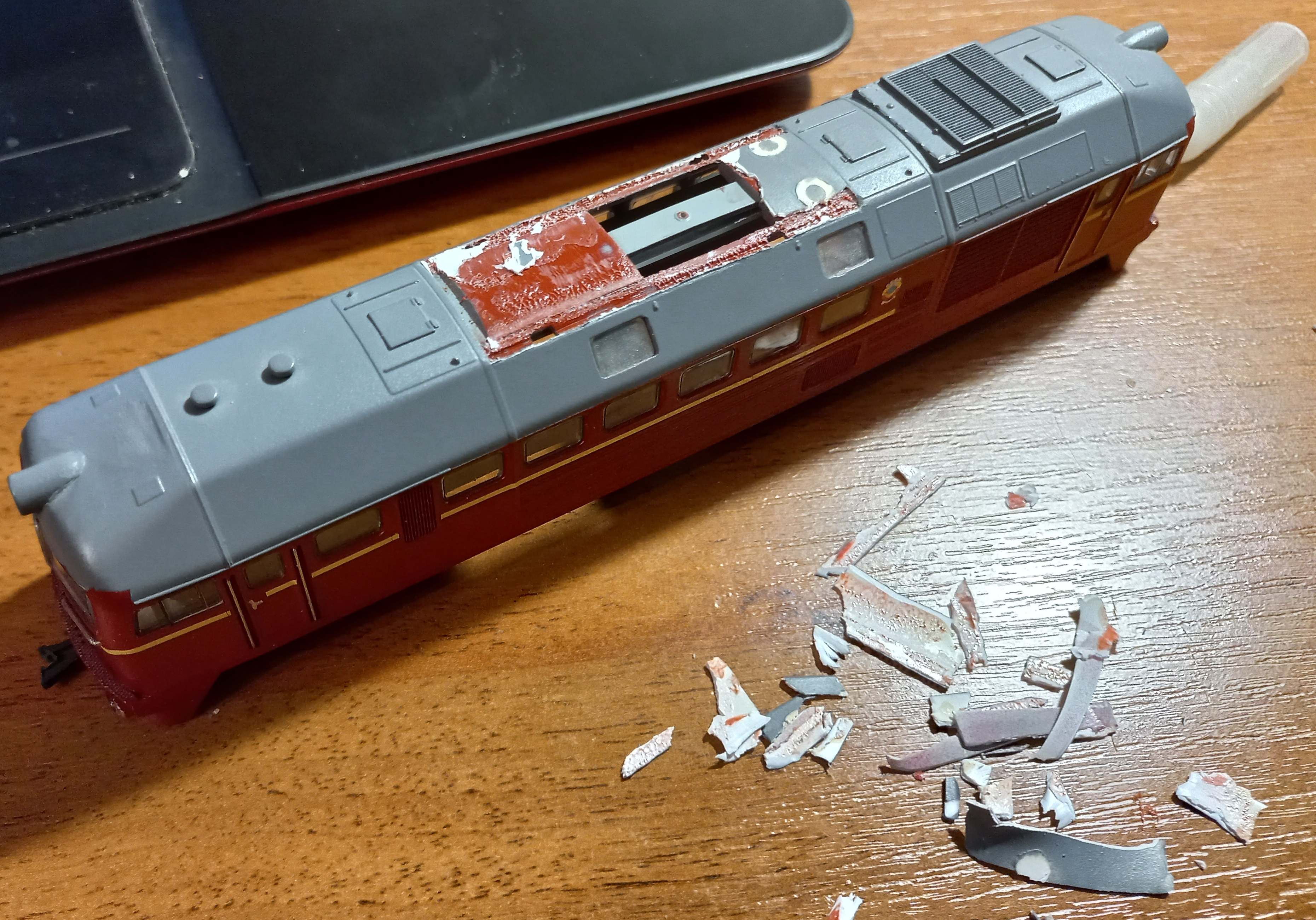 Думаю, видно, где была приклеена самодельная панель. :roll: Сношу под корень это страшко. Бодрости при работах добавляет то, что тепловоз под перекрас не планировался.