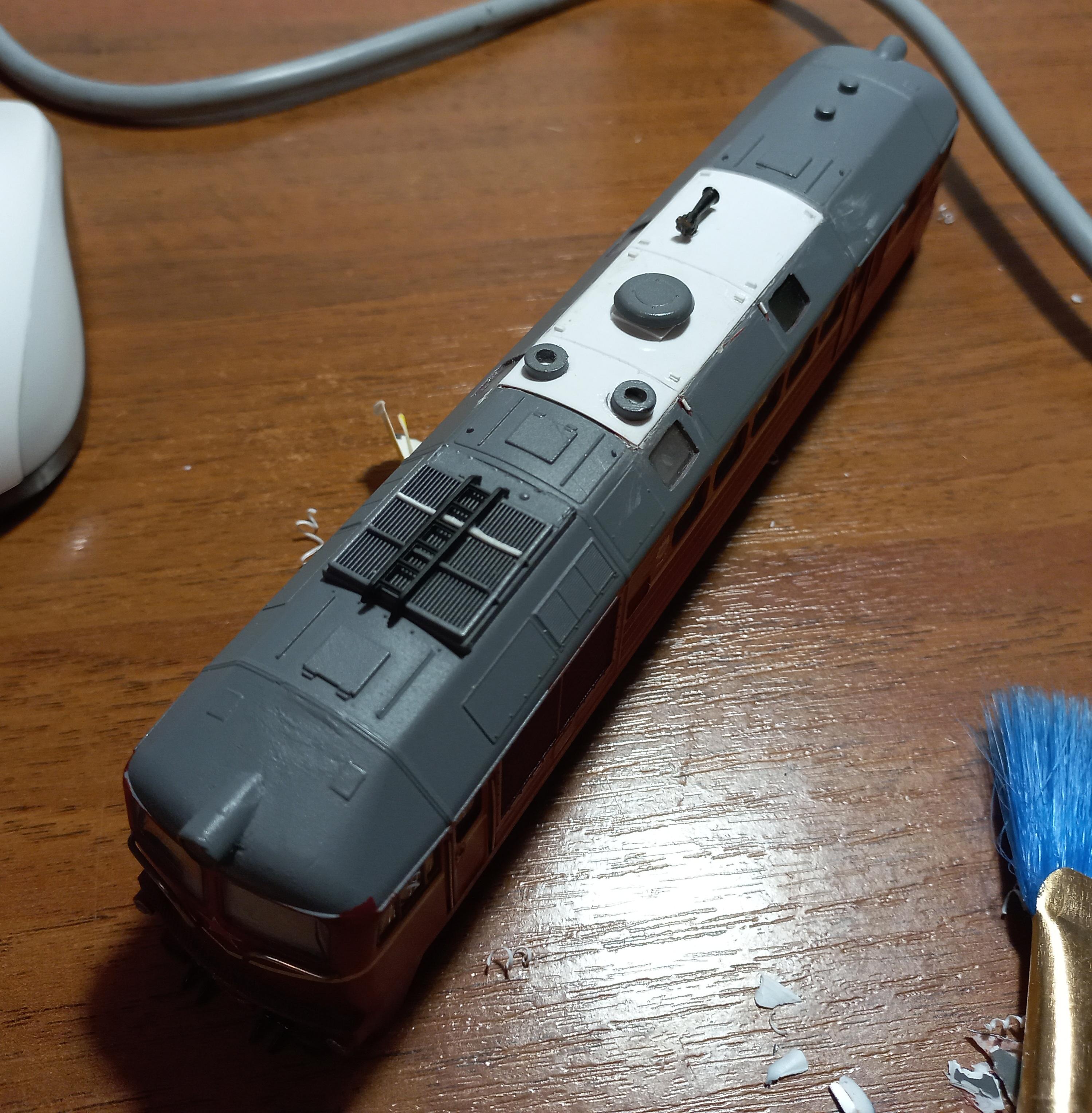 Итак, нужно было вывести скругление самодельных полистирольных элементов под общий знаменатель. Кипяток в помощь. Изобразить расшивку и хотя бы контурно - рым-болты для снятия крышевых панелей над дизелем.