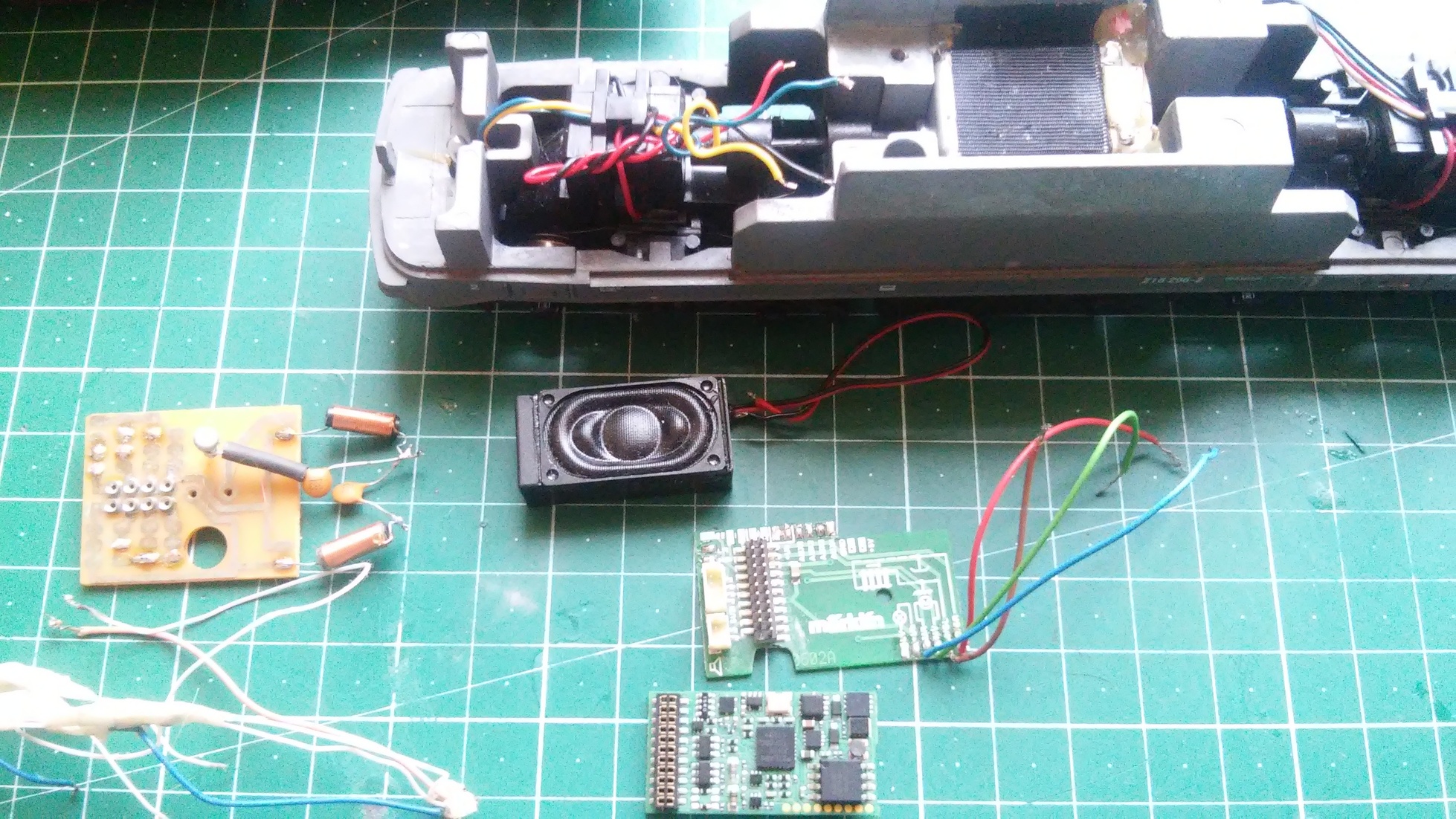 Це звуковий декодер від Марклін, плату для нього, динамік. Зрозуміло, що рідну плату демонтовуєм і на її місце ставимо нову. Зробив переднье/заднье світло, в кабіні. Але один нюанс який мені не подобаеться.Транзистори, які добавив до світодіодних лампочок чомусь дуже сильно нагріваються