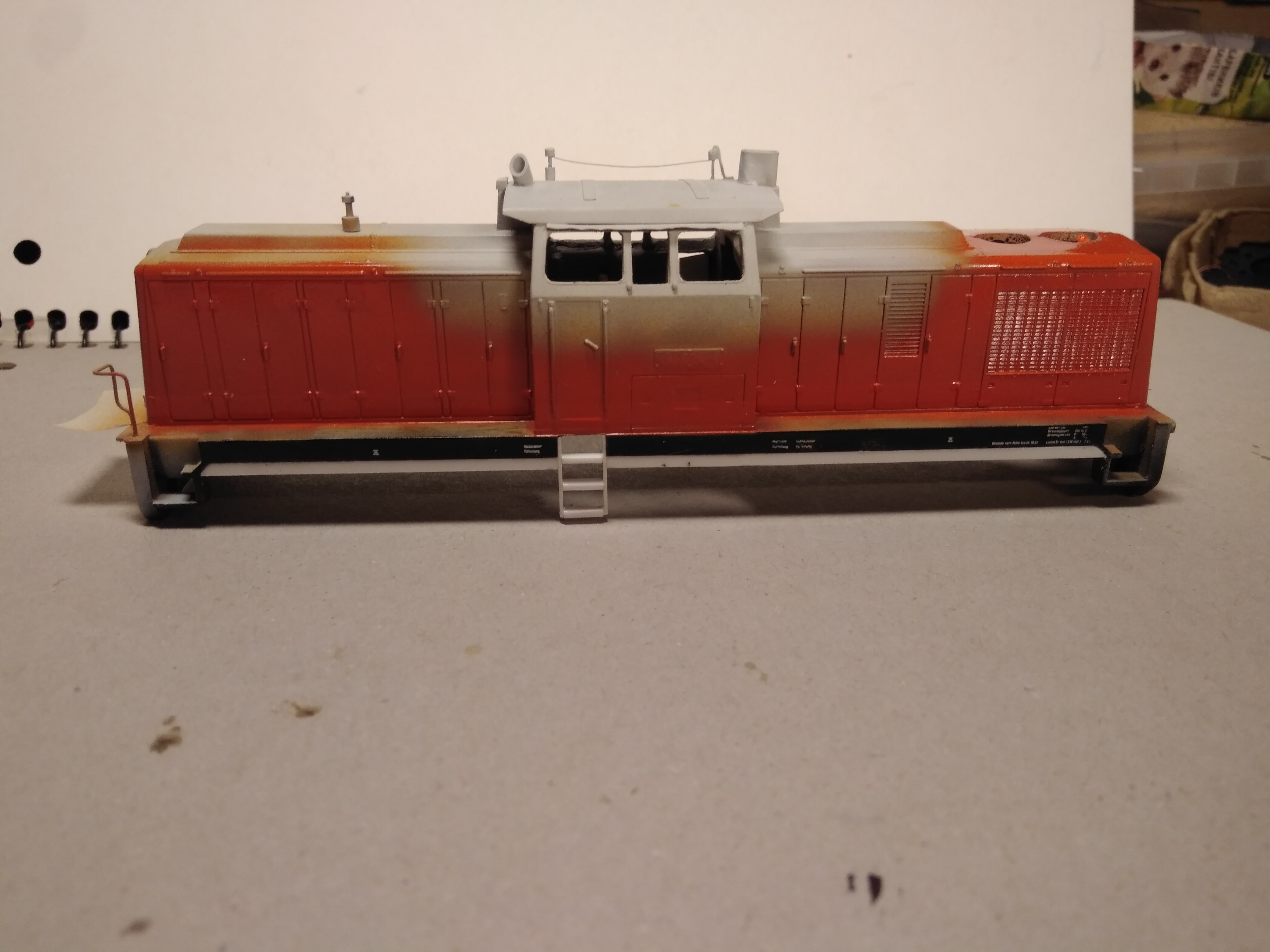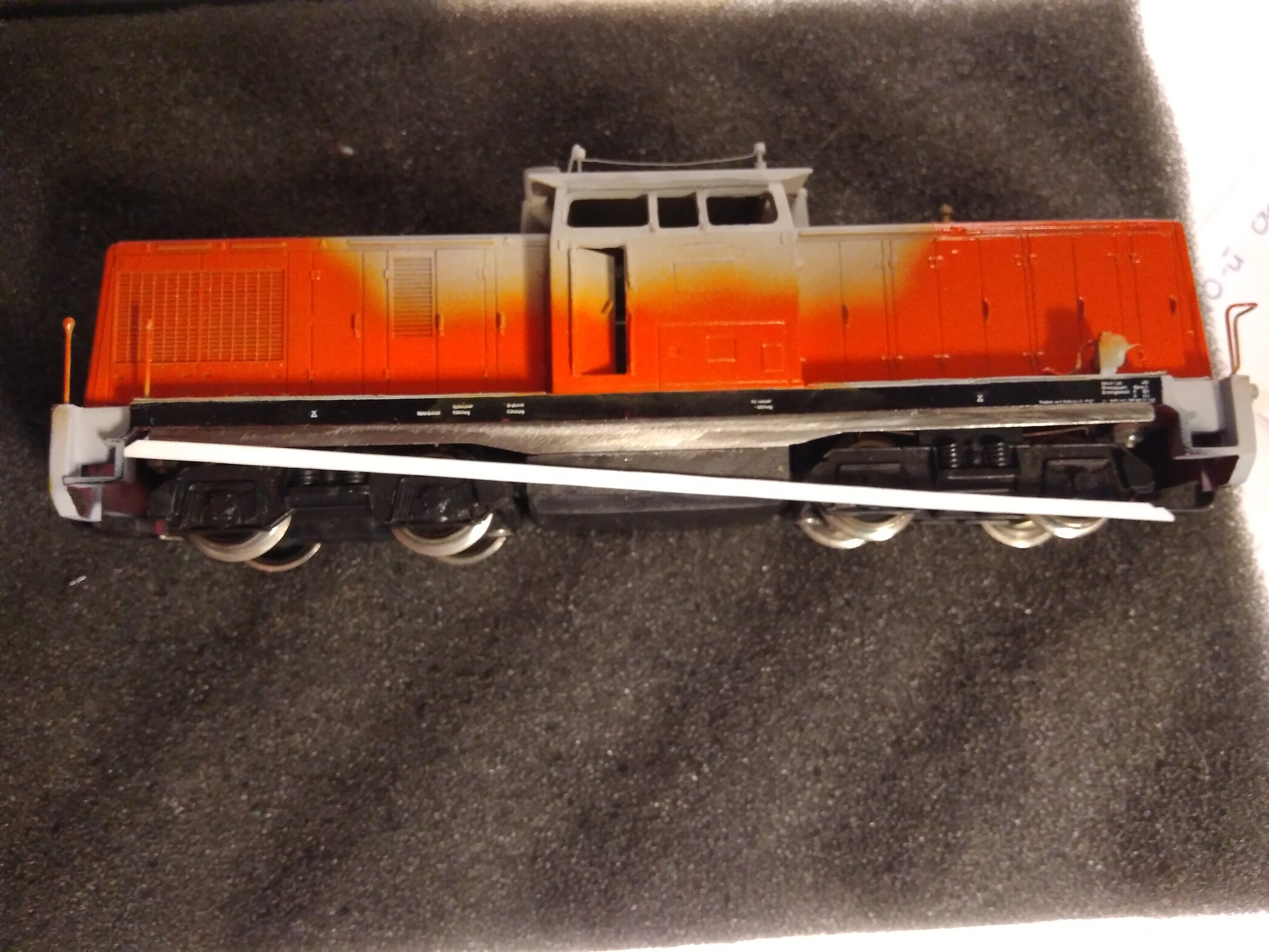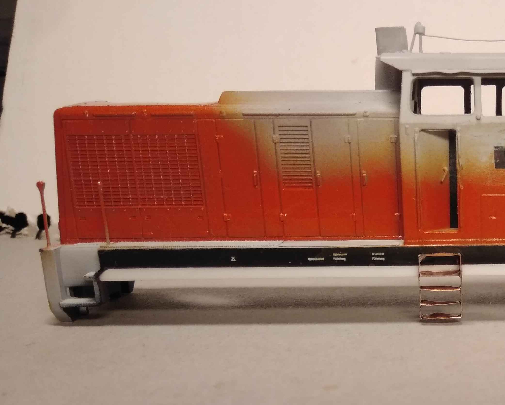 Начал красить. Рыжий. Красная + Желтая humbrol. Аэрограф. Одел в скотч малярный и покрыл палубу чёрным матом humbrol. Аэрограф.