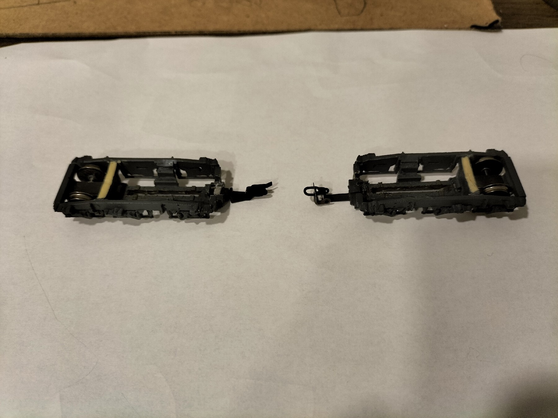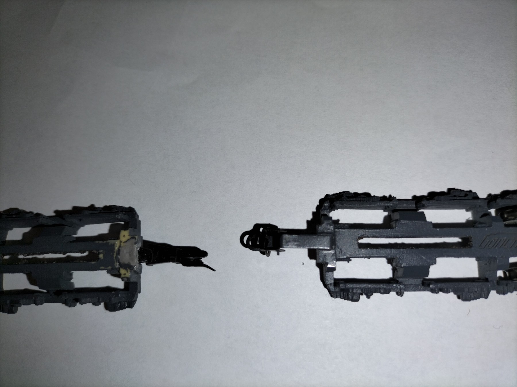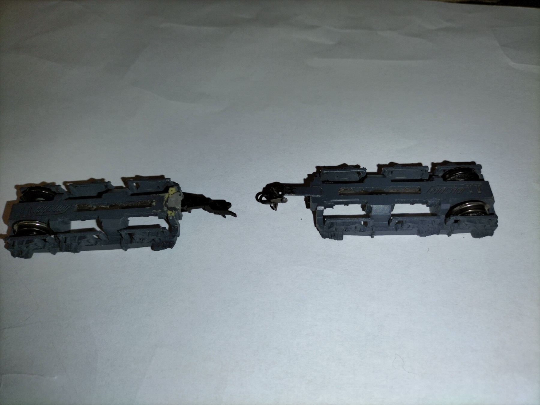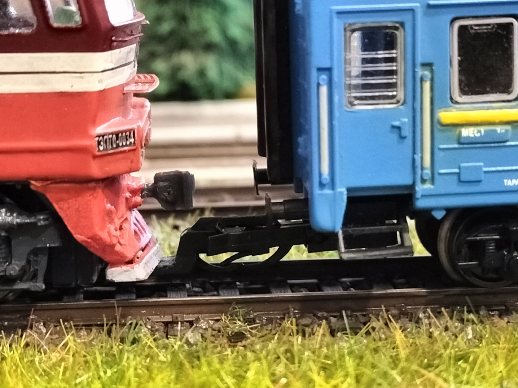 ТЕП70 від Юрія Гончаренка. Цікава модель і загалом мені подобається,хоча деякий покращеннь все ж потребувала. Що було зроблено - Більш надійно прикеїв мітельники та встановив імітації СА3 від Pit. Намагався звести до мінімуму щілину між мітельником і корпусом щоби не пробивалося світло від діодів - вийшло частково. Заміна жерстяних зчепок перевсетовського типу на знімні типу "сільодка", оскільки пасажирські вагони і мене них них через те, що проміжок між вагонами з ними менший. Робити проріз в мітельнику, як на ТЕП 10, не став, натомість поставив зчепки від тілліговського V180. Вона ідеально обходить мітельник. Дремелем випиляв з кришок візків незнімні пересветовські "кочерги", вклеїв вузли кріплення тілліговських зчепок (це не типові шахти NEM, а спеціальні, ішли в комплекті), обшпаклював та після висихання шпаклівки пропитав її суперклеєм. Працює, вагони тягає, те розчіпається. На модель наклеїв травльонку з комплекту та легко пообмазував фільтром.