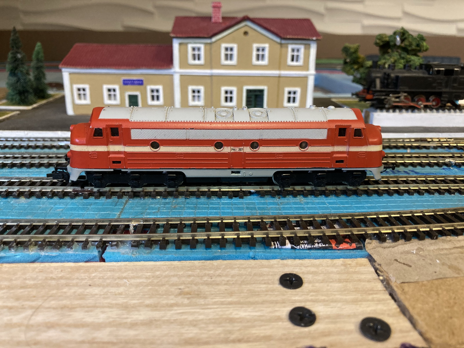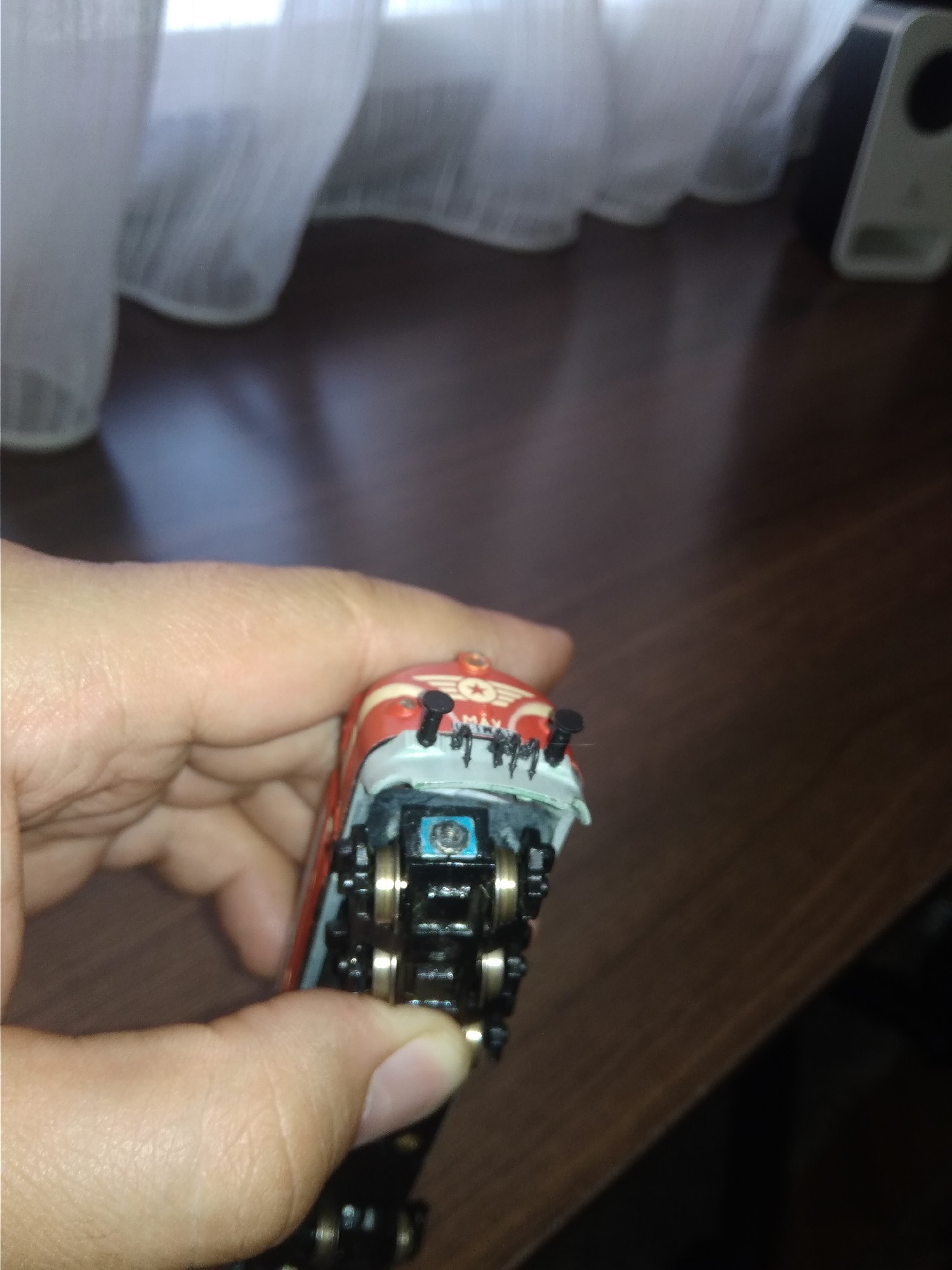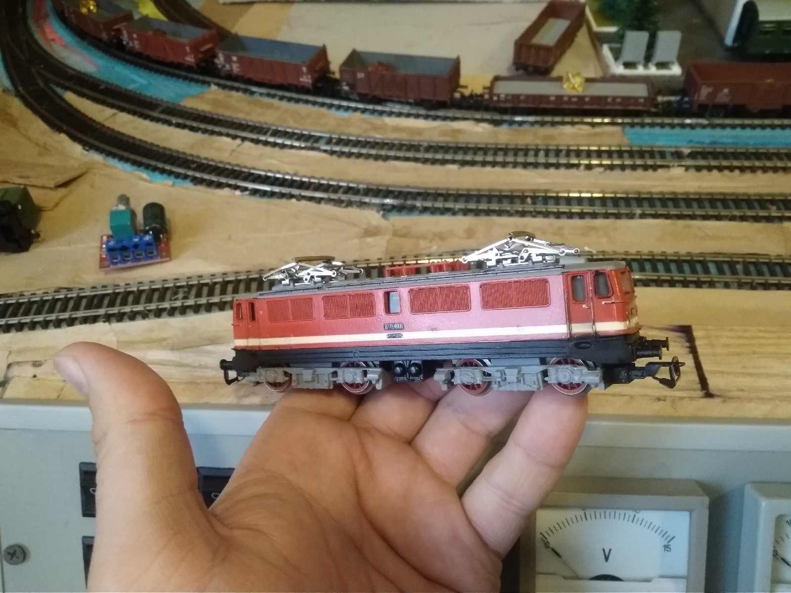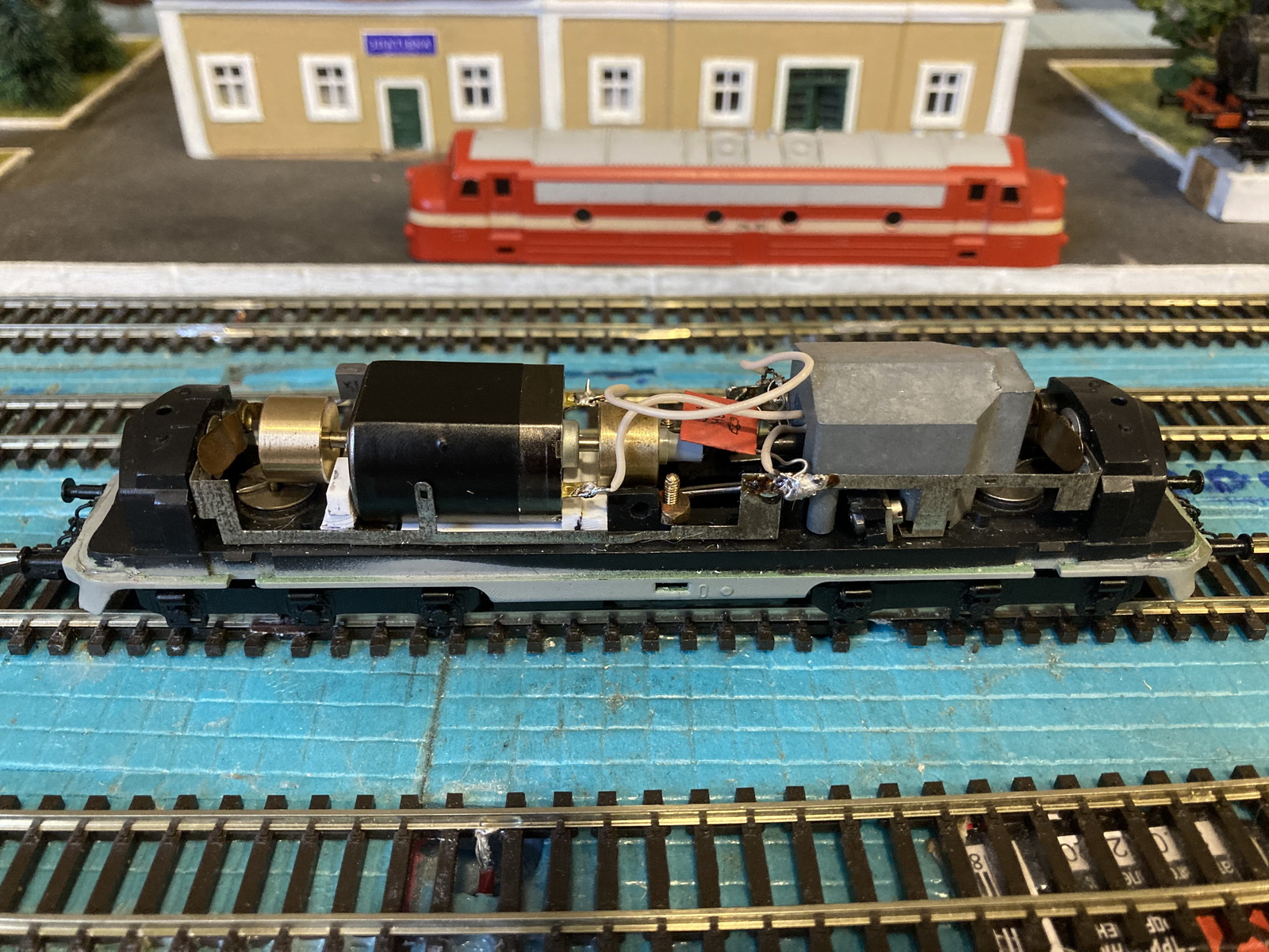 Щодо самих буферних брусів - був зрізаний мітельник майже до рівня буферів. Виробник зобразив модель ранніх серій, де мітельник був присутній, тоді як на пізніших та доживших до наших днів електровозах він відсутній. Сучасні виробники, Tillig та Kuehn також випускають модель цього лока без мітельника. Завдяки цьому стало можливим приклеїти на кришку візка з торця повноцінну шахту NEM та не городити колхоз як у М61. Нижню кромку брусів обклеїв смужками модельного пластику та зашкалював, також смужку наклеїв на торець щоби наростити довжину. На відміну від Нохаба, гальмівними шлангами вирішив поки не заморочуватися, поставив просто гак та буфери, висвердлив сходинки під дверима. Останні мені не дуже вийшли, як в принципі і рівність "скул", але там я згодом планую зробити драбинки у кабіну, тож вони трохи прикриють. Механіка та двигунастокові, тільки збірна солянка з різних донорів. Загалом агрегат шумний, ну як уже є.