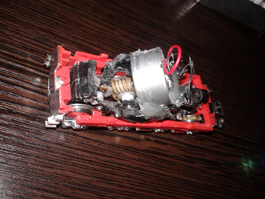Он едет быстро, бесшумно, присутствует инерция как с маховиком и тянет четыре вагона почти без падения в скорости. Был и ряд других проблем, а именно из за размеров шестерен, которых нашел, одна из осей при проседании тендера попадала в зубья. Решил проблему другим путем. Переставил на нее колеса которые были с резинками, а эти колеса поставил на шестерни через которые сделан привод и натянул на них резинки.