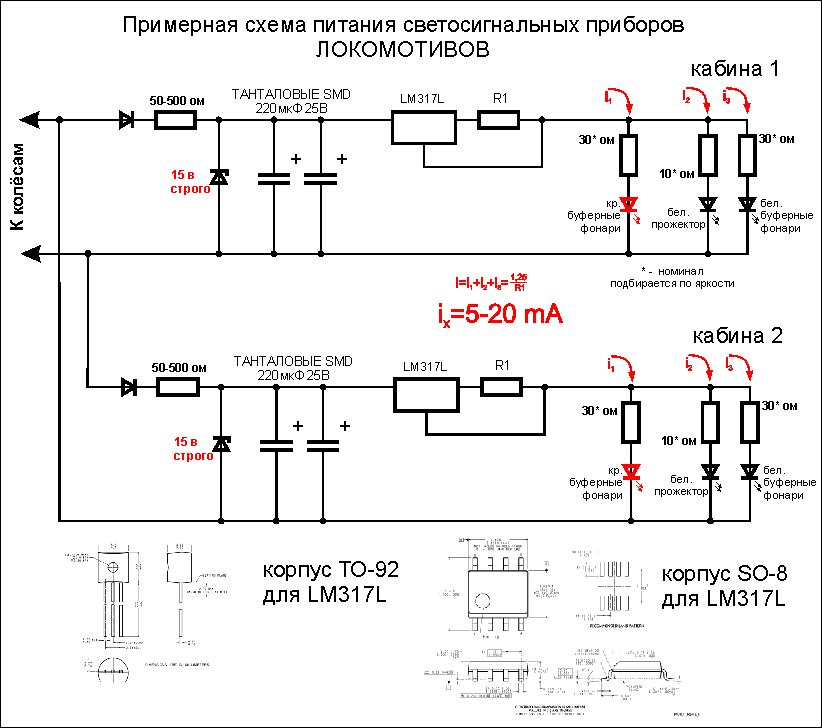 Свет выполнен на лампах, горят лампы ровным сетом по ходу движения на любом напряжении. Схема очень полезна для *паровозников* и новичков в этом деле