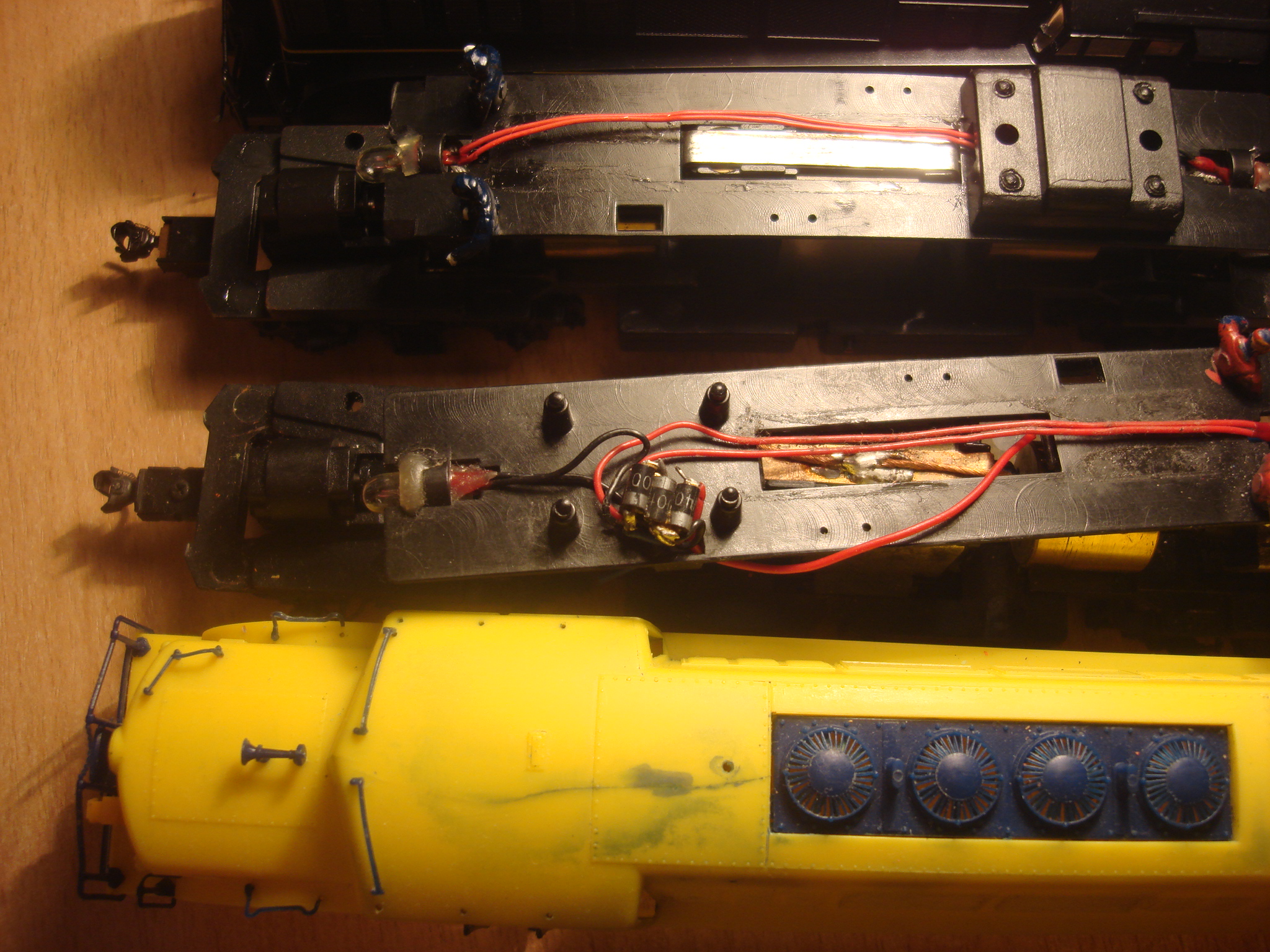 Олег уже ответил, это одна и та же схема. Различие в подключении светодиодов. Верхняя - размещение светодиодов в буферном брусе BR55, верхнего прожектора нет. Гораздо удобнее было вести проводку при последовательном подключении светодиодов.T-1000 писав:Я так понимаю, на втором рисунке схема сверху свет назад? Нижняя вперед?