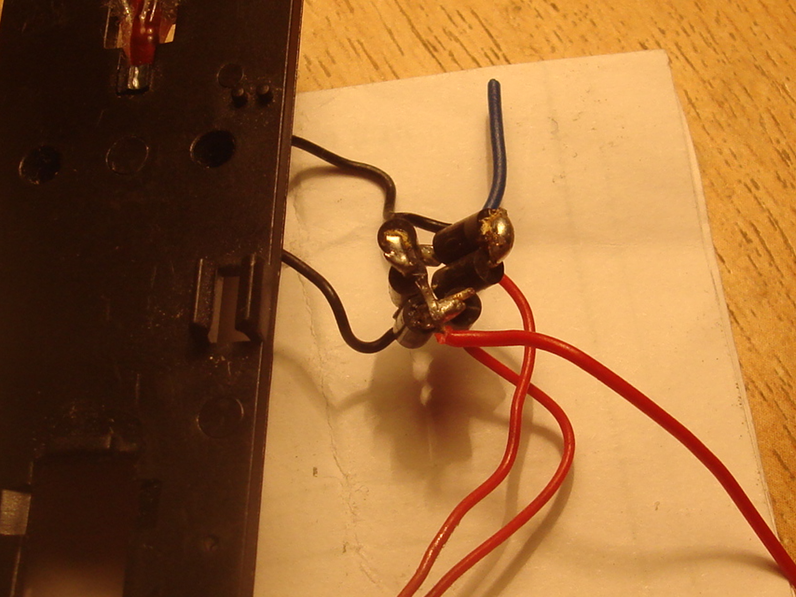 Нижняя - в BR80. Здесь подключил светодиоды параллельно, но каждый через свой резистор.Для освещения вперёд -назад спаиваются две одинаковые схемы.