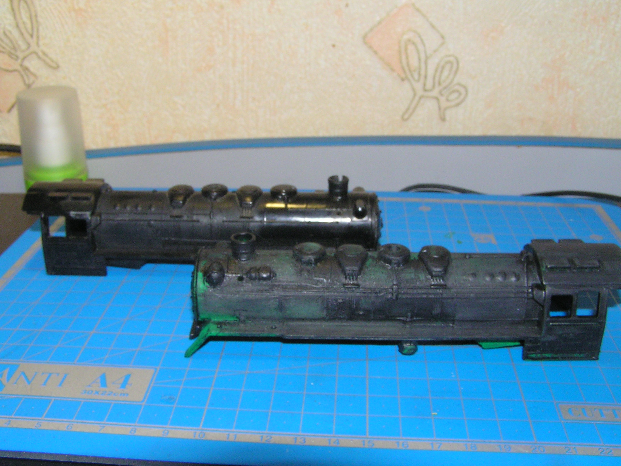 Алкидная краска съела часть рельефа. Красил с балончика легким тонким надувом с промежуточной сушкой. Не дождался аэрографа (будет только через неделю) ,такую пластмассу лучше красить акрилом . Кисточкой только подкраска мелких элементов, всю модель красить кисточкой не реально выходит топорно (3 раза смывал -учился). Кто знает как соединить поручни?