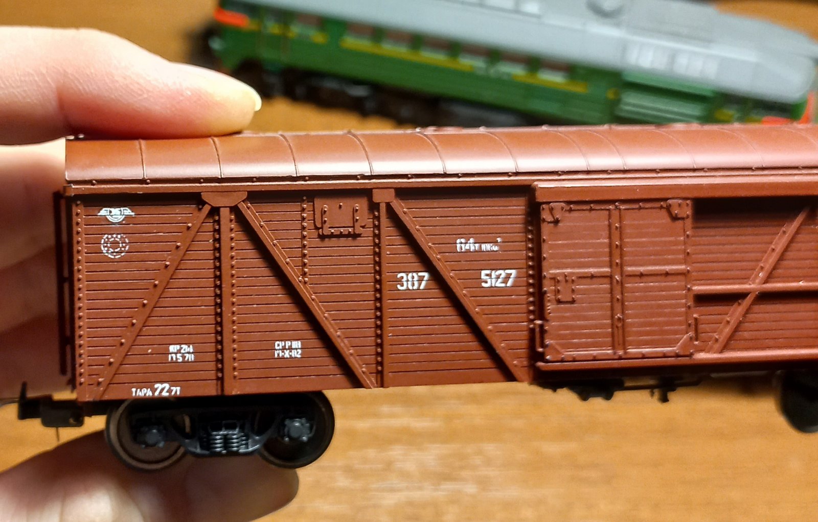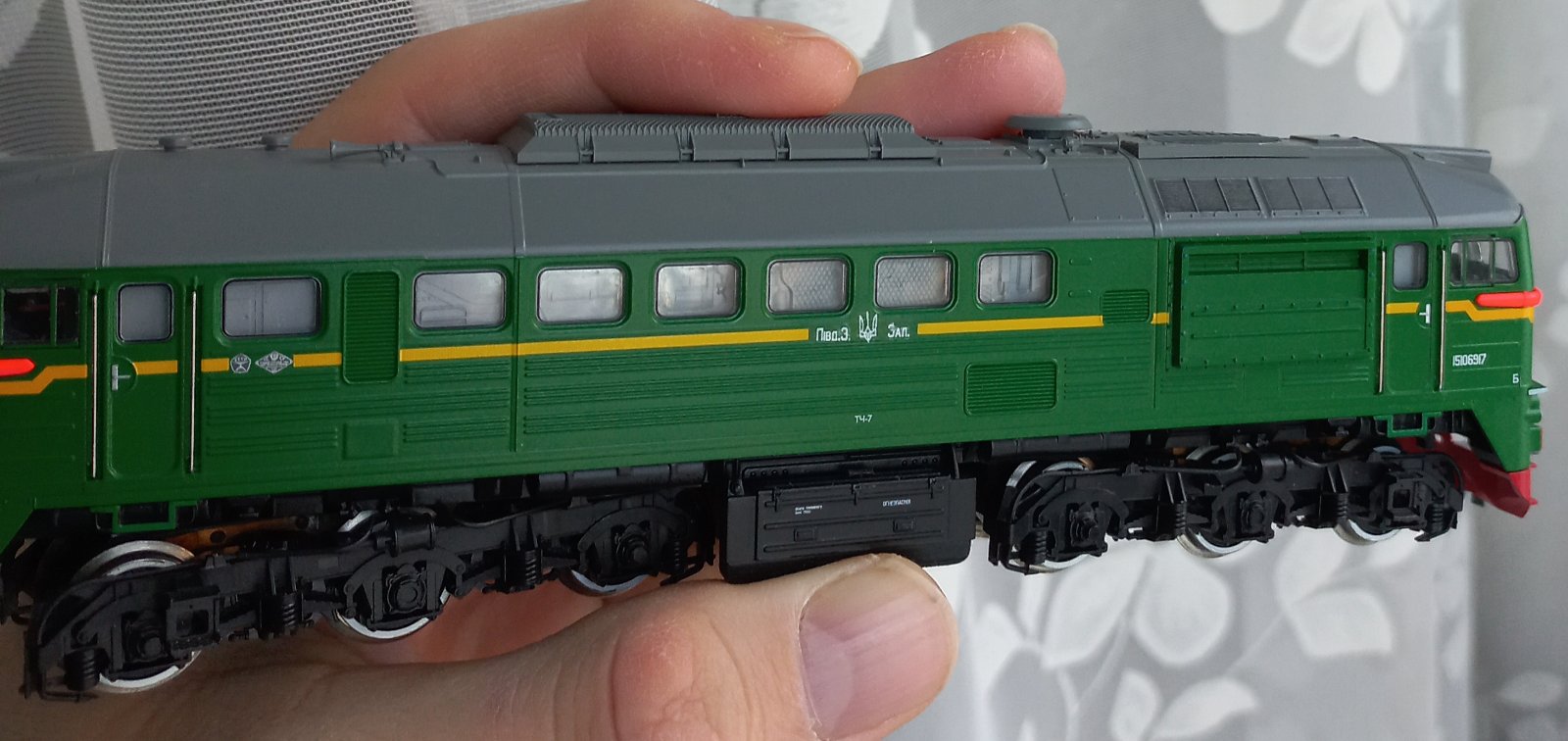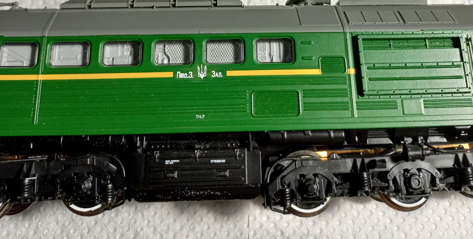Почав потроху робити те, що хотів давно. Змінити приписки вагонів та локів. Задачу трохи ускладнює те, що суто українських дек небагато. А ще це все треба робити на готових моделях, і бажано не вбити під повний перекрас. Найскладніша у цьому плані була М62, треба було знищити старі написи та нанести нові. Добре, що на багатьох тепловозах залишається розрив у жовтій лінії. Ось як тут: