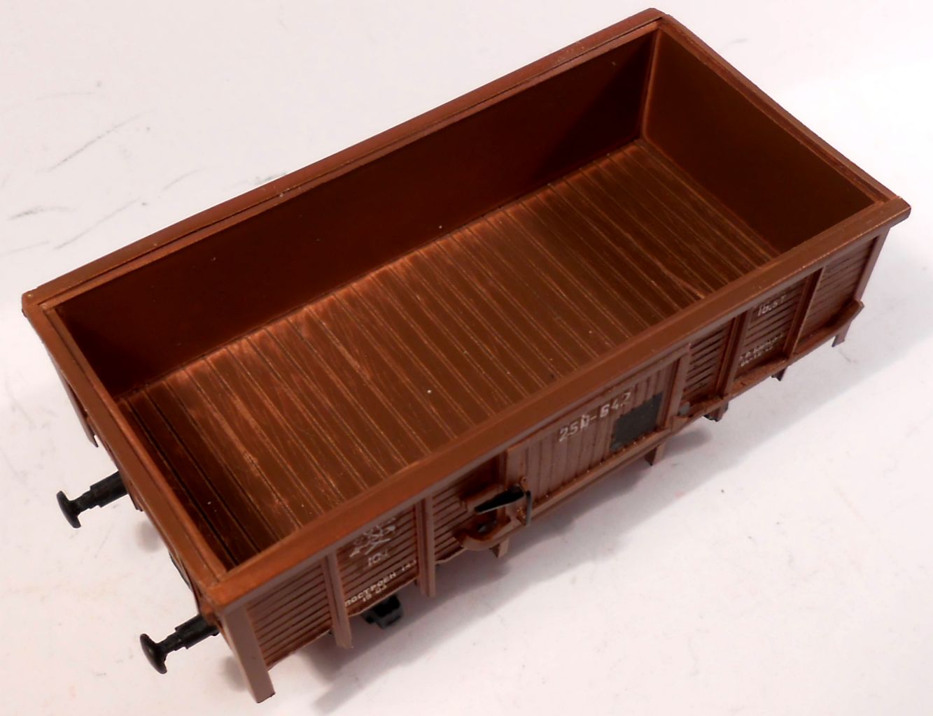 Я бы этот вагон изначально красил полностью в чёрный, а затем нарочито небрежно основным цветом. Оставшиеся просветы чёрного будут готовым везерингом и отлично подчеркнут швы.Stinky писав:Старение и груз пока не применял.