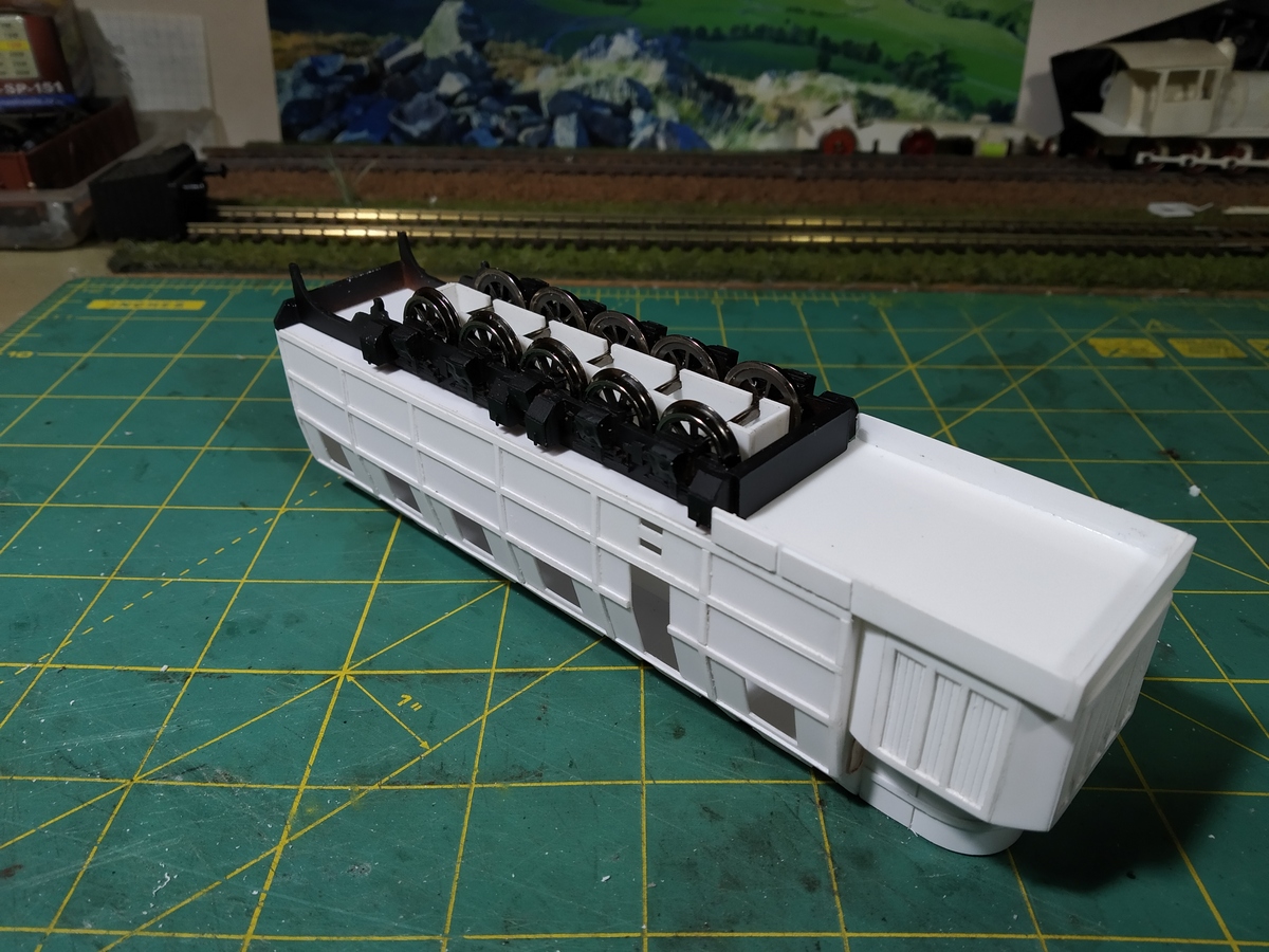 Думаю нужно сделать выносную раму, и зацепить ее с одного из краев, или на некотором расстоянии от центра, таким образом устранится вынос корпуса в повороте, таким образом и телегу будет проще сделать, возможно телегу прицепить к раме.