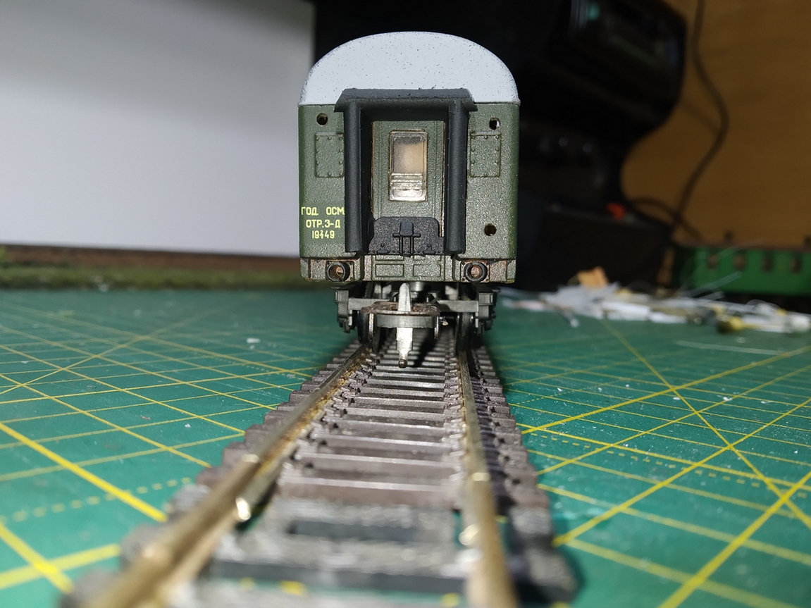 Донорский вагон укоротил на 19 мм, сделав длину под имеющиеся вагоны. Лишние проёмы заделал, добавил дефлекторов на крышу. Юбку обрезал, изготовил аккумуляторные ящики под вагоном.