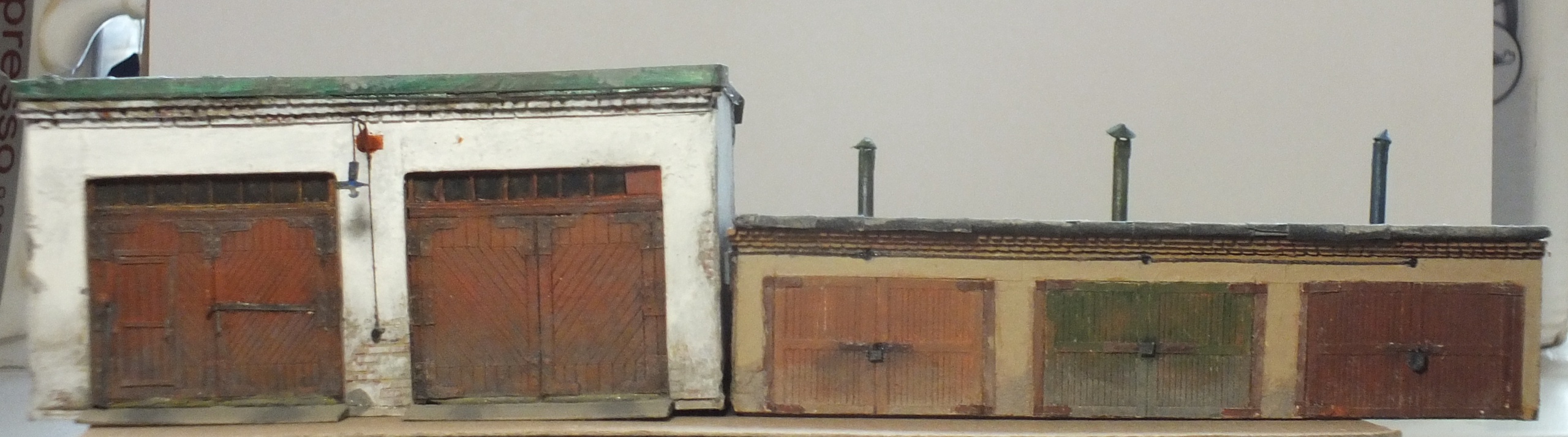Гаражи. Заказ , уехали ещё в январе. У большого кирпичи - врезка отливок из смолы в картон, у легкового - бока и задняя стена отливки. 1/87. Крашено - кисть, акрил.