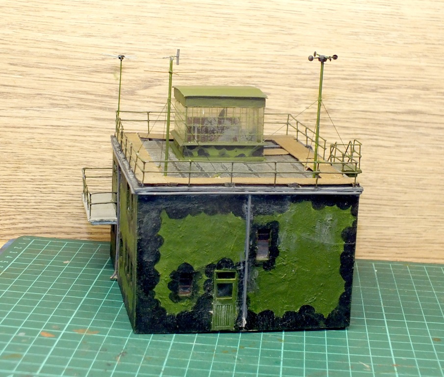 Ну поскольку ЮрСаныч весьма успешно развивает авиционную тему, я подумал - " А почему бы и нет?" и сделал "Авиационный Диспетчерский Пункт"или, более подходяще к прототипу - RAF Airfield control tower - Контрольная вышка аэродрома Королевских военно-воздушных сил Великобритании периода Второй Мировой войны.Почему вот её? - ну автожир Сиервы есть, а эти аппараты на первоначальном периоде войны использовали для настройки РЛС ПВО Великобритании, нужен аэродром. Начиналось всё как обычно - в сети давным - давно нашёл выкройки бумажной модели этого здания, лежали у меня в заначке, там же лежали старинные журналы "Стендмастер", издавались в 90-х годах Новосибирским клубом стендового моделизма, в одном из них была статья "Путешествие в страну RAF", метра Сибирского стенда Валерия Васильевича Сердюка. Это был рассказ о сборке ну о - о- о- очень древней пластиковой модели такой вышки от AIRFIX в хитром "английском " масштабе 1/76. (Кажется H0/00 ?) .Ну статью я изучил и предвкушал - "Щаз резаком раз - два, клеем три - четыре, краской... " Ну понятно, в общем... Так вот выкройки оказались полной копией этой пластмассы но, когда я их распечатал, учитывая масштаб, ни в куда это всё не попало....Да ещё в сеть полез посмотреть... Короче - моя модель - это полный самодел , сделанный по оригинальным чертежам проекта Министерства авиации Великобритании, спецификация 12799/41. Нарыто в сети. Модель моя и модель от AIRFIX - модели вышек построенных по разным проектам. На Аирфиксовскую я чертежей не нашёл, хотя фото таких вышек в сети есть.Основное внешнее отличие - у аирфиксовской балкон Г - образный, у моей П - образный. Теперь по модели - то что я сделал, в некоторых деталях компиляция, сделанная по фото из сети. Военных фото не так что бы густо, многие детали "крышевого" оборудования не понятны , кроме того была спецификация от 43 года и некоторые вышки перестраивались. Окраска - за основу взял широко применявшийся в начальный период войны как для техники так и для стационарных сооружений камуфляж типа "уши Майти Мауса"(!!!). Вполне официальное название , кстати... По конструкции - как там крыши крыли , чем, не нашёл, сделал по своему разумению, толем. Потому и мостки по периметру, чтоб не продавливать... "Оранжерея" на крыше - что там обычно размещалось - не нашёл, поверил реставраторам, хотя есть сомнения...Размеры, окраска и расчалки метео на крыше - примерно , толком ничего в сети нет. Антенна - такая есть на одном фото, но вот период появления-? Вообще толком по антеннам ничего не нашёл...