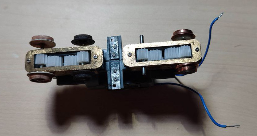 Собрал корпус редутора в тендер Эм. Двигатель пятиполюсный (по крайней мере так заявлено у китайцев). Несмотря на вроде относительно большой размер тендера, но привод вписать вышло с заметным трудом, так как двигатель довольно большой, а между тележками надо было сохранить просвет. Не люблю такой тип редуктора, так как он заметно вибрирует. Оказалось что значительную часть колебаний длинного вала можно погасить, подперев его пружиной и ходовая визжать перестала. Зато ездить он может очень медленно, чего хотелось добиться