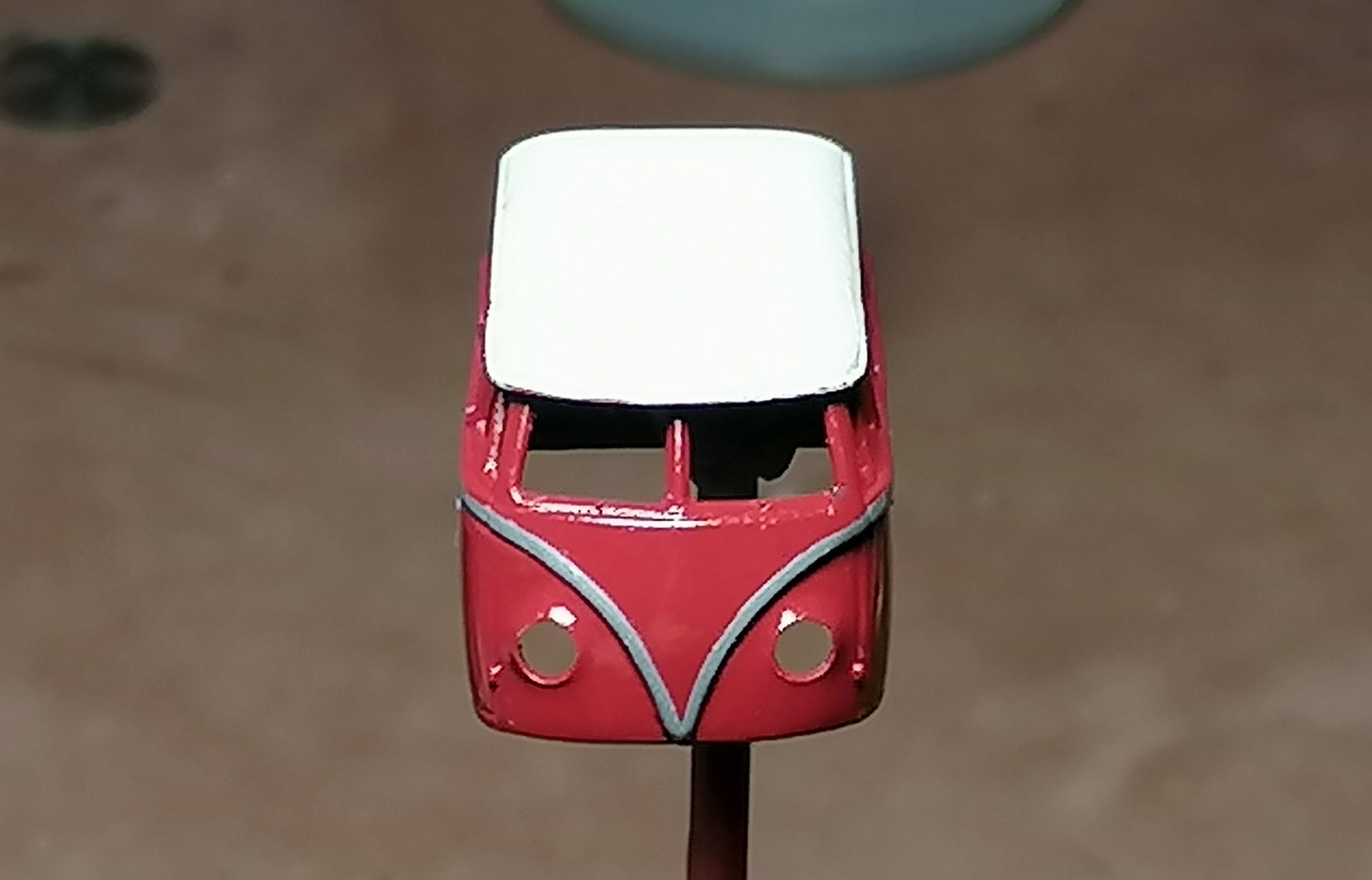 Зашкурил крышу, изменил форму выемки сзади (под номерной знак?). Покрасил и покрыл глянцевым лаком (молдинг - серебристая декаль). Высохнет - залью фары.