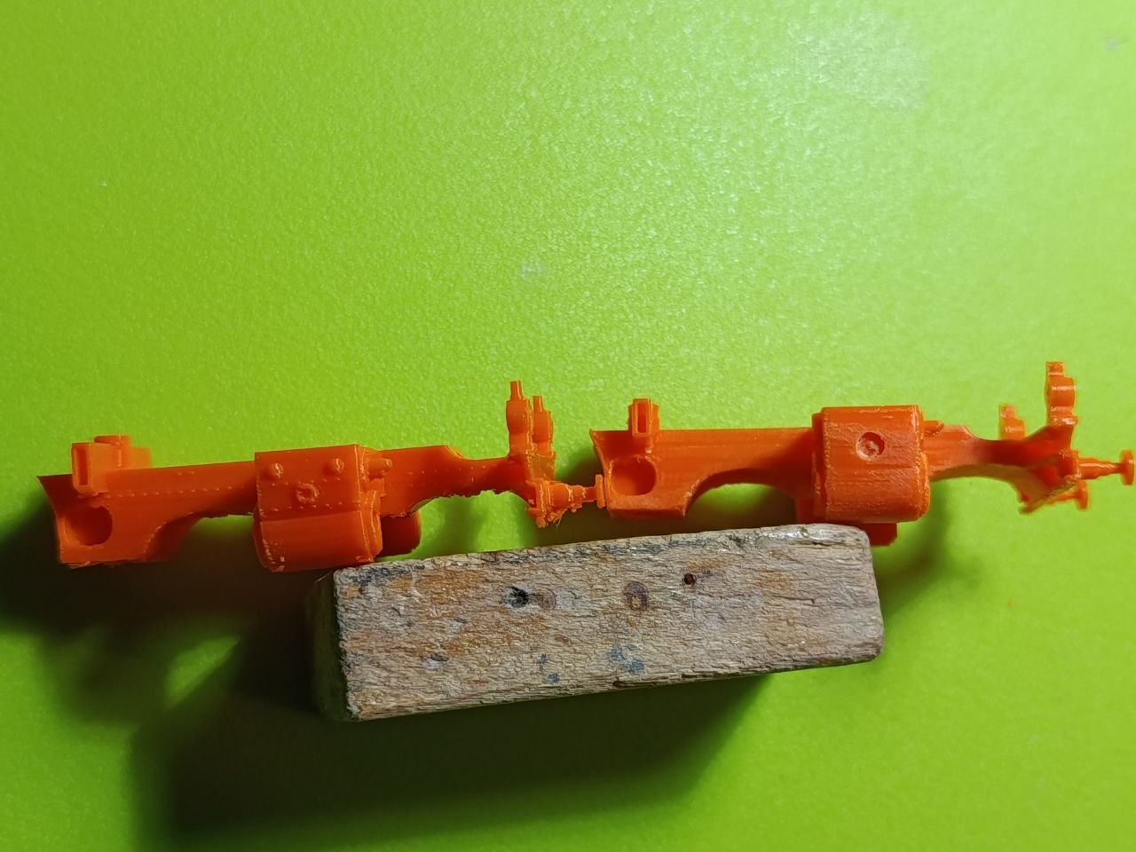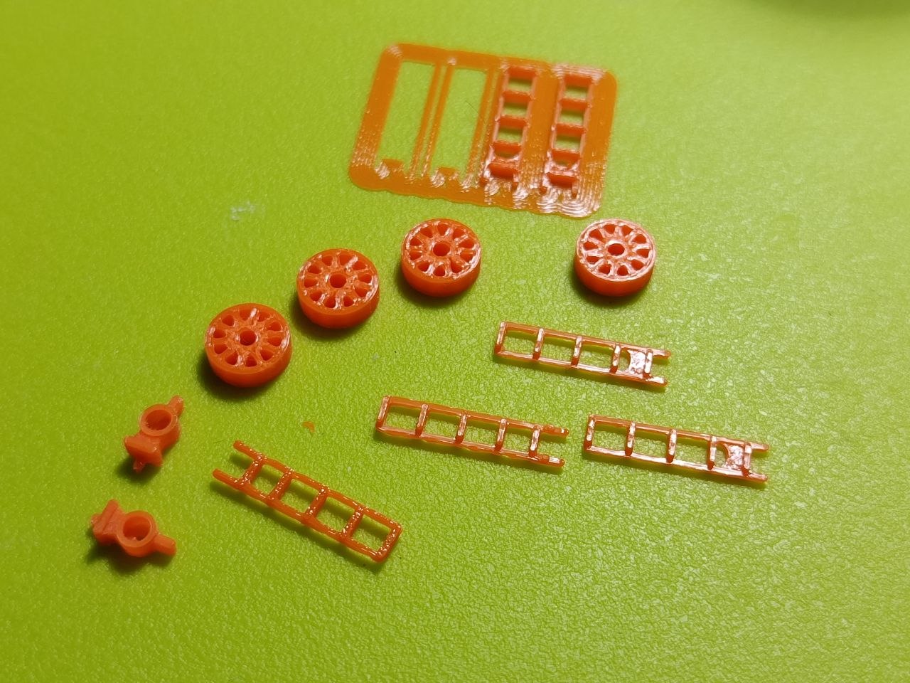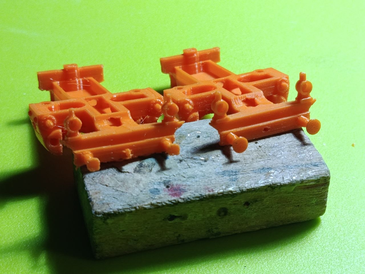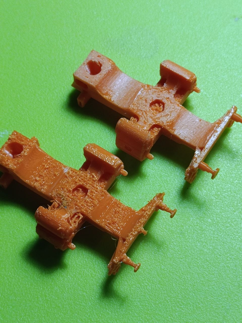 продолжаю знакомство с фдм принтером. Лесенки получились. Немного чуть менее ажурные, чем проволочные (там толщина порядка 0,5 мм), но гибкие и можно делать выступающие ступеньки. Еще 2 раза попробовал напечатать переднюю часть рамы Б одним куском (левая), и с отдельными буферами и фонарями (правая), что б оптимально расположить относительно слоев. С накладными деталями вышло гораздо лучше, правда ножка буферных тарелок хрупковатая и при ударе отвалится (буферы печатались вертикально и слои идут не вдоль, а поперек)