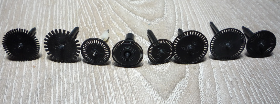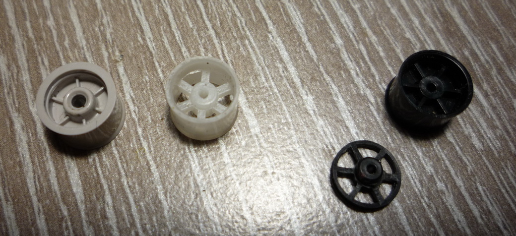 Итак, шкивы. Заготовки взяты из аудиокассет - ролики для плёнки. Бывают разного внешнего вида, цвета, с разным диаметром отверстия. Наружный диаметр один. Недостаток заготовок - малая толщина стенки, сделать глубокую проточку под трос невозможно.