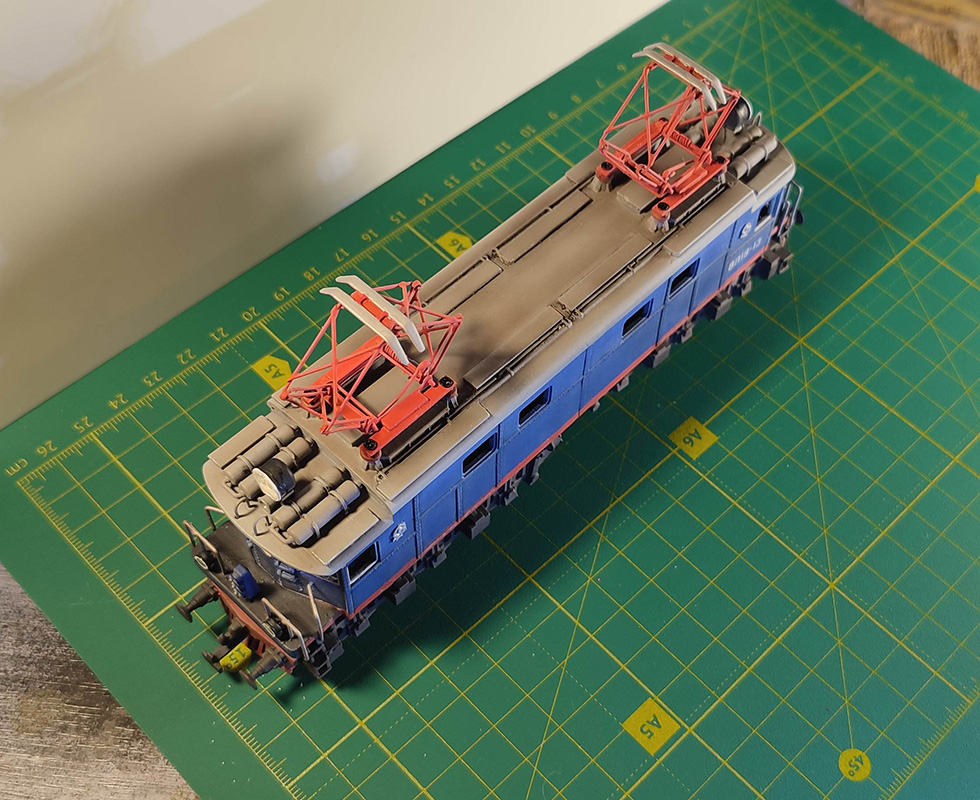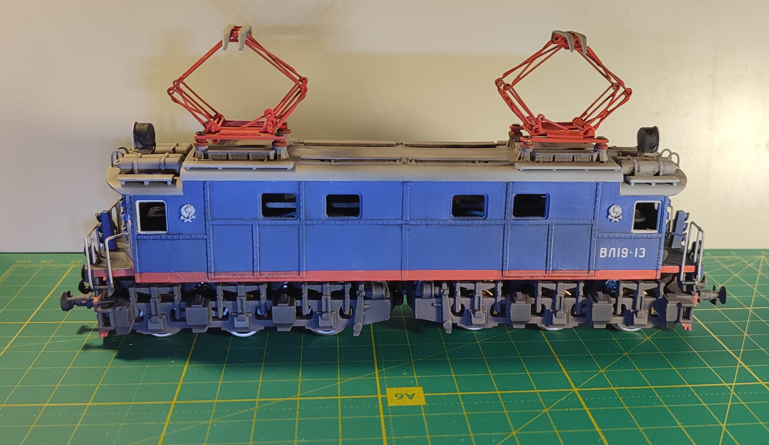 практически окончил ВЛ-19. Стекла позднее напечатаю и вставлю, когда прозрачную смолу куплю. Свет по ходу движения, заднего красного нет. Фотографии прототипа нет, если не ошибаюсь 13й был в том же депо, что и евротрейновский 14й. С окраской кузова вышел небольшой брак, лак вступил похоже в реакцию с остатками моющего средства в акварели на смывке, потому немного белых точек и разводов присутствует на синем.