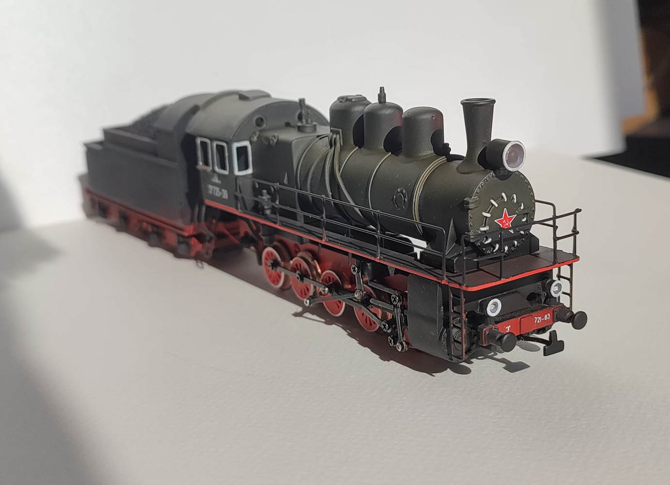 Доделал Эм. К сожалению при лакировке паровоза вышел брак и пришлось смывать краску с декалями. Так что на тендере и паровозе разные номера. Как будет настроение, то вклею стекла. Ток снимается со всех колпар тендера и 2х колпар паровоза. Можно было и больше, но усики заметно затрудняют движение и выбрал золотую середину между токосьемом и сопротивлением движению.