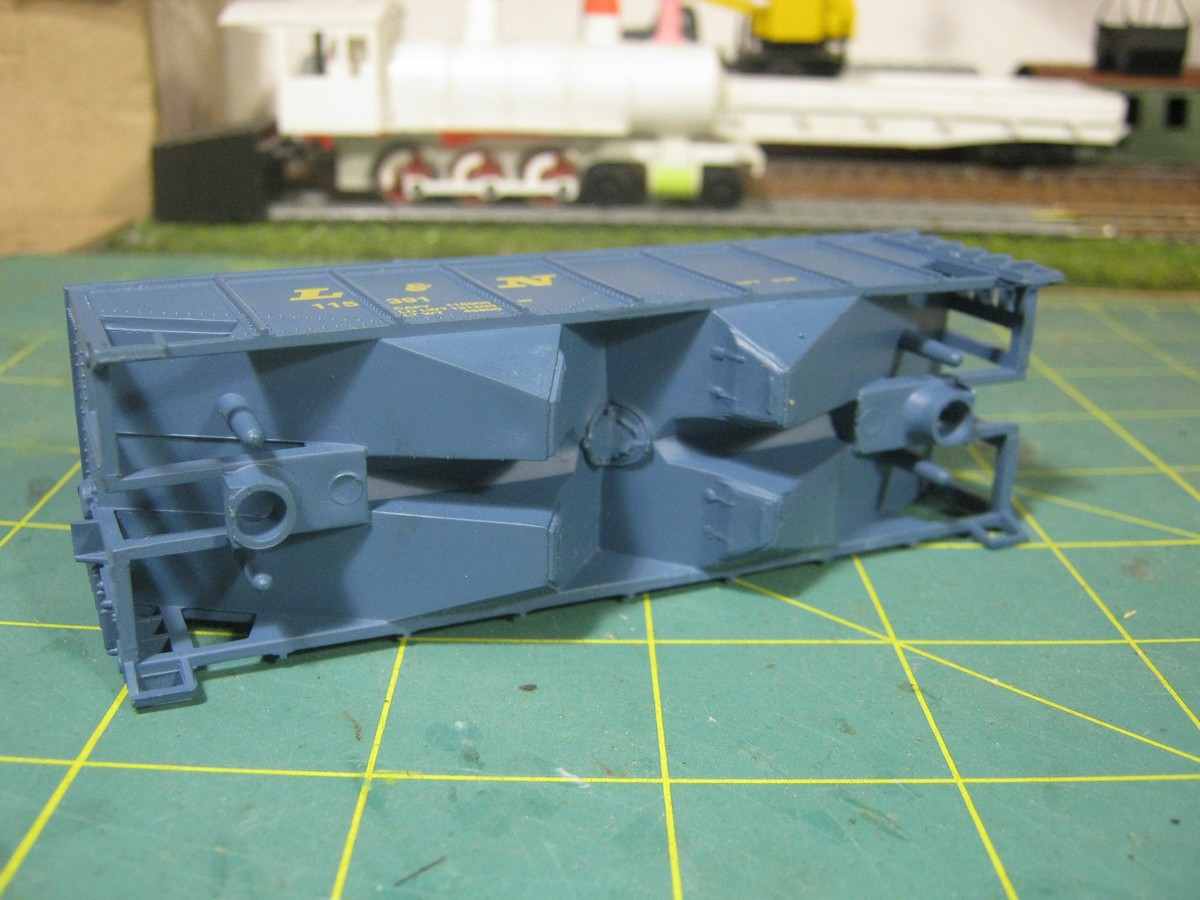 Жёлтые надписи смыл спиртом. Следует заметить, что краска смылась, но остались достаточно видимые объёмные контуры удалённых изображений и поверхность слегка подчищал мелкой шкуркой. Далее покраска, декали, матовый лак, изготовление хребтовой балки, установка тележек, подобранных в ящике с американским имуществом. Колпары пока пластиковые. Металлические у меня только европейские, оси немного короче и выпадают из американских тележек. Заменю со временем. Быть может... Декали Сергея Попова - justin.