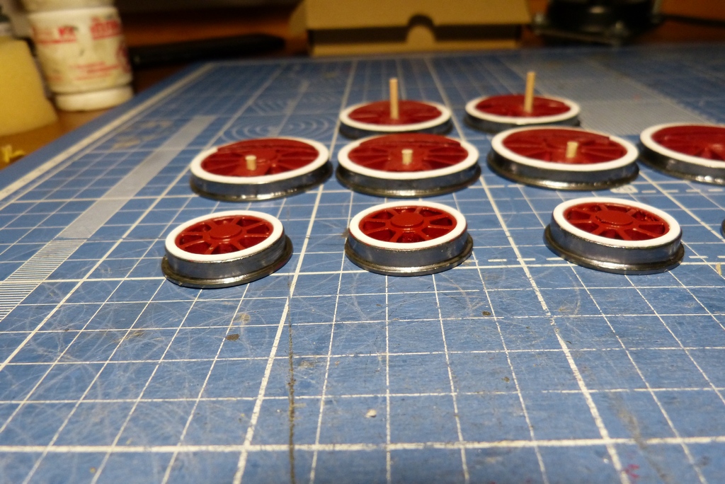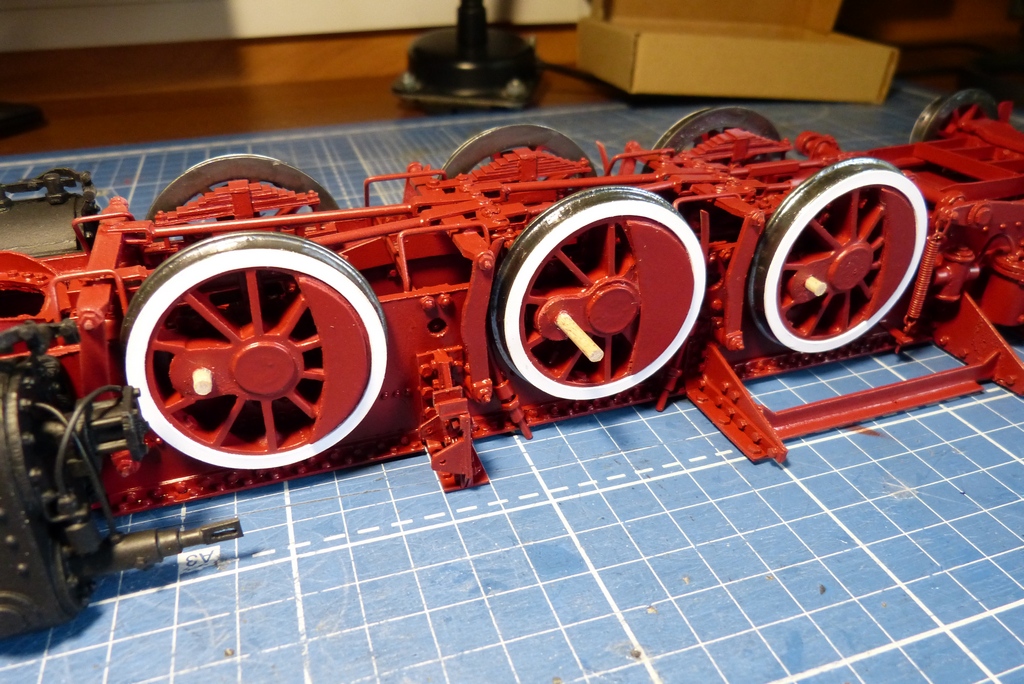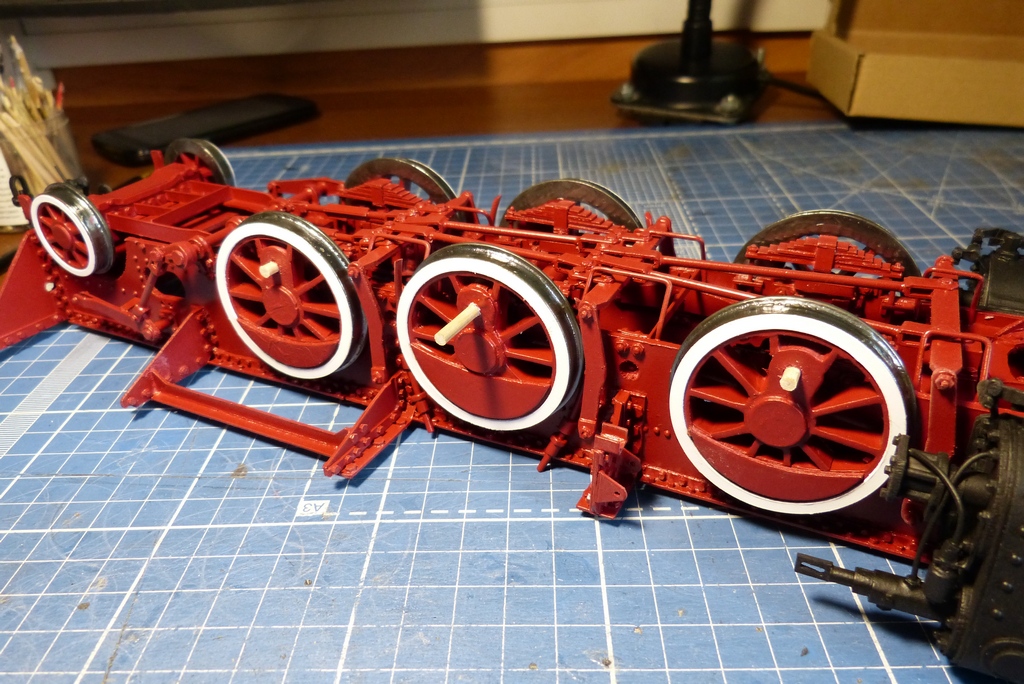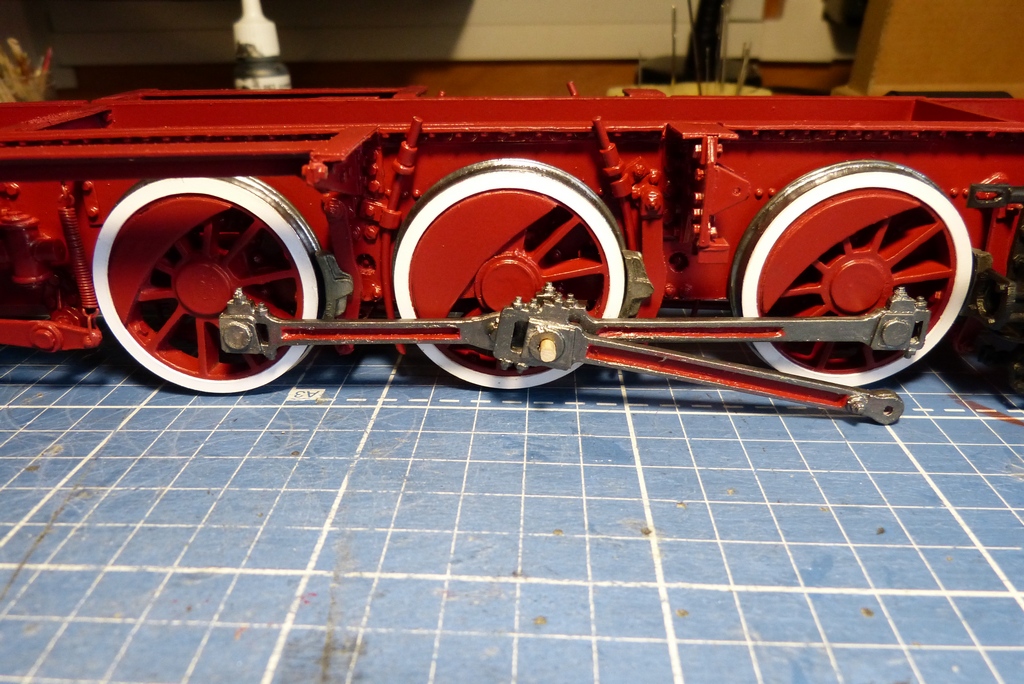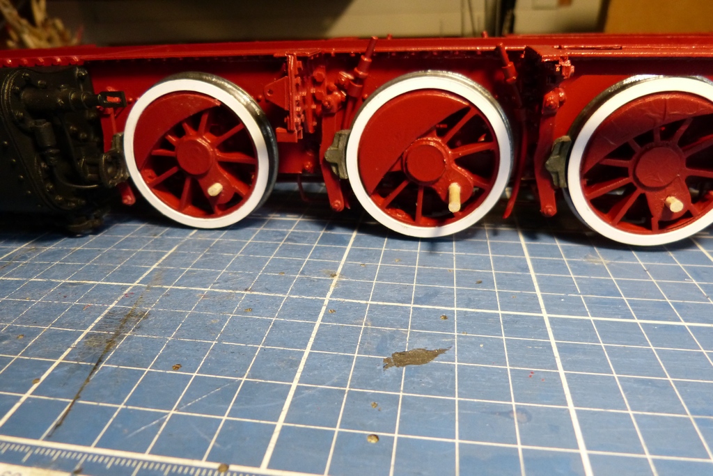 Бегунковая поверхность колес это тоже краска,делает Хумброль,краска специально разрабатывалась для таких элементов как накатанная сталь.