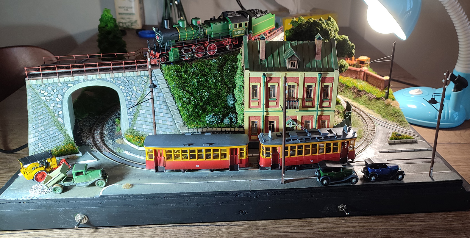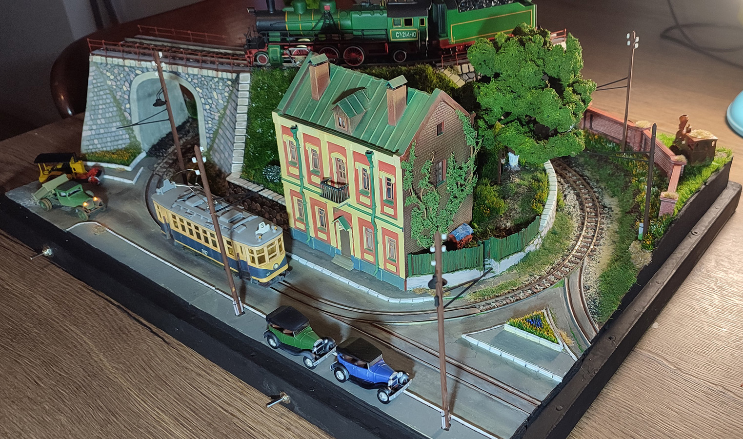 В общем доделал микромакет (надо будет человечков подобавлять и может в перспективе на рельсы ток подвести, что б свет в локомотиве был), выложу как есть. Размер 48х37 см. По ссылке видео на гугл диске