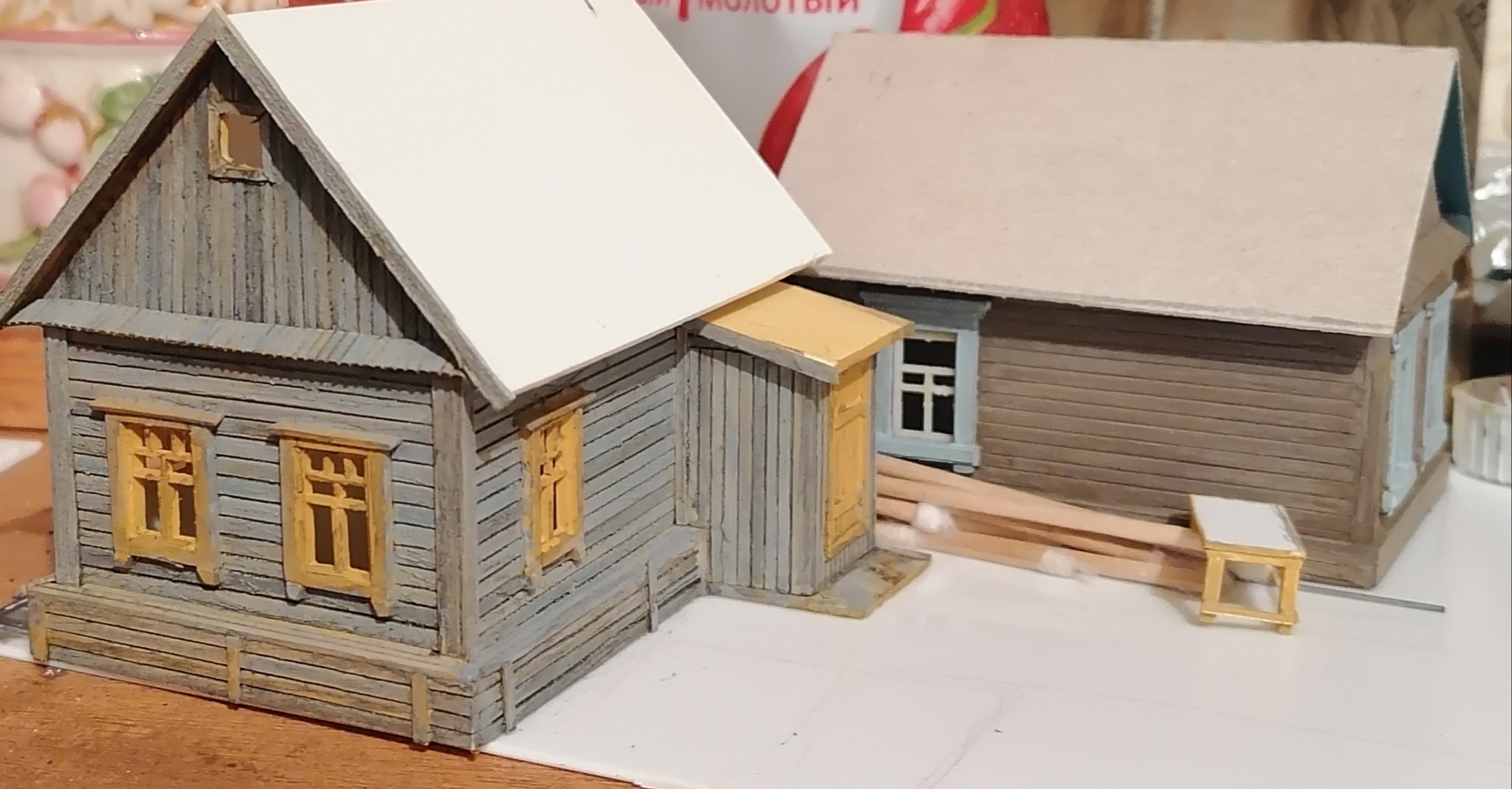 Денис, я от ностальгии и сделал. Стекла в лом было делать, да и шкафчик по быстренькому склепал. Нужен как груз в простую обозную телегу на которой еще будут восседать возчик спереди. А бабка с узлом поклажи сзади. Якобы переезд с обновами по деревенски. Домик полистерольный. Причем полистерол бюджетный в основной массе. Это доска для лепки 1 милиметри окантовка 0,5 эвергрин. Насчет фактуры дерева. Несложно! Сидишь кино смотришь ножичком фоново шмурыгаешь.А насчет ровности-я ЮрСаныча наставления переодически читаю по бюджетной стройке стремлюсь соответствовать. Хотя глаз порою косит.