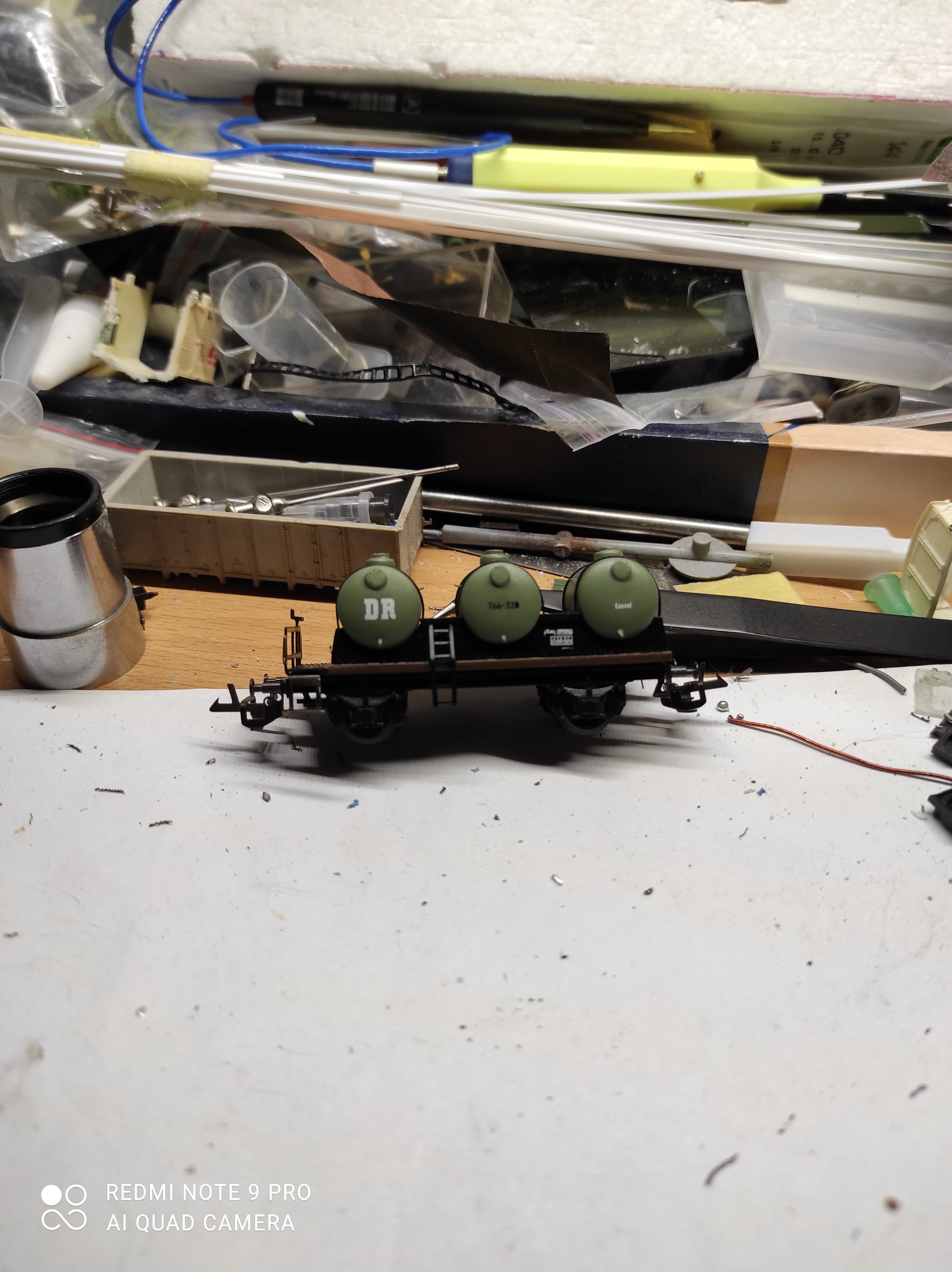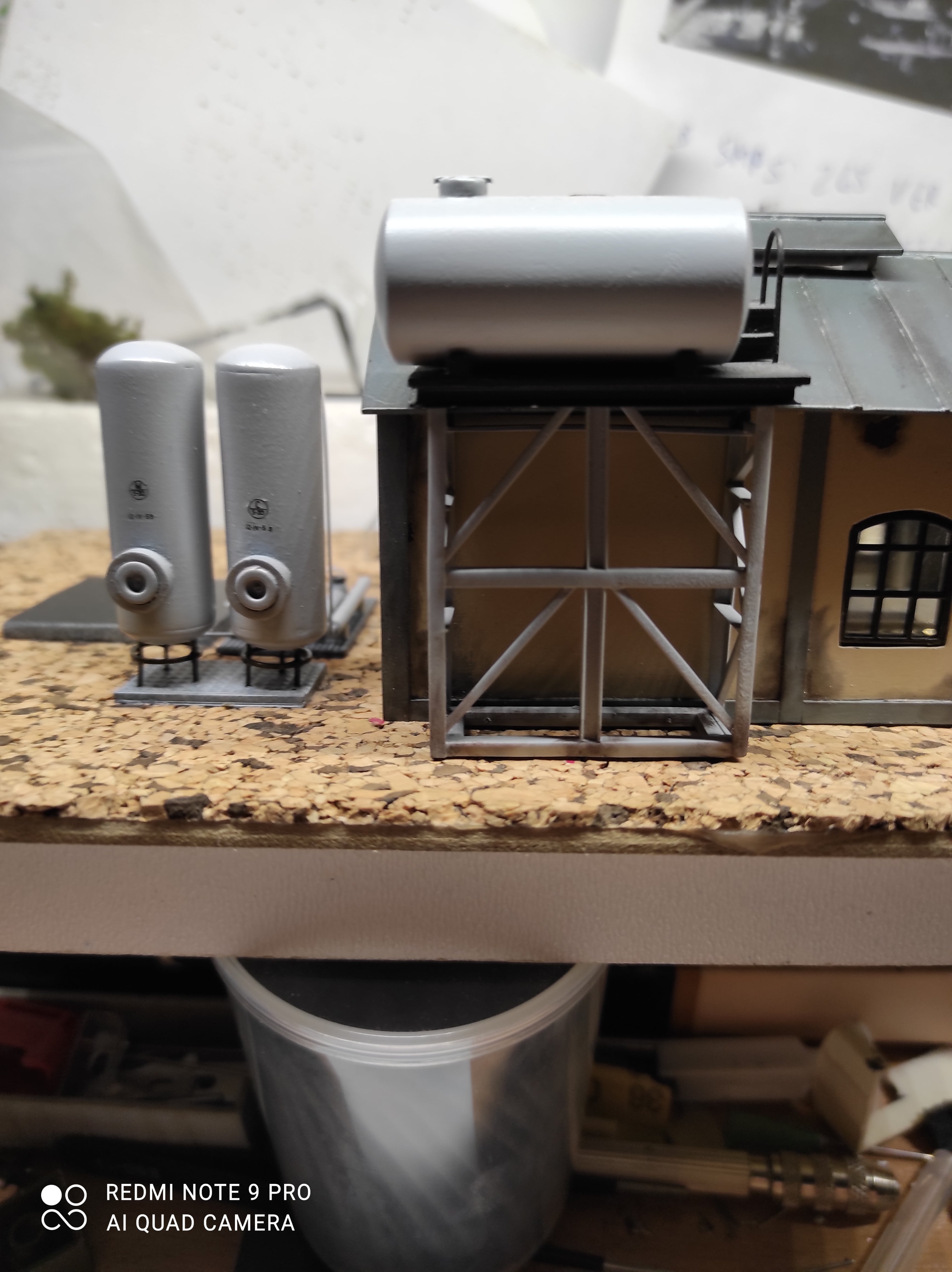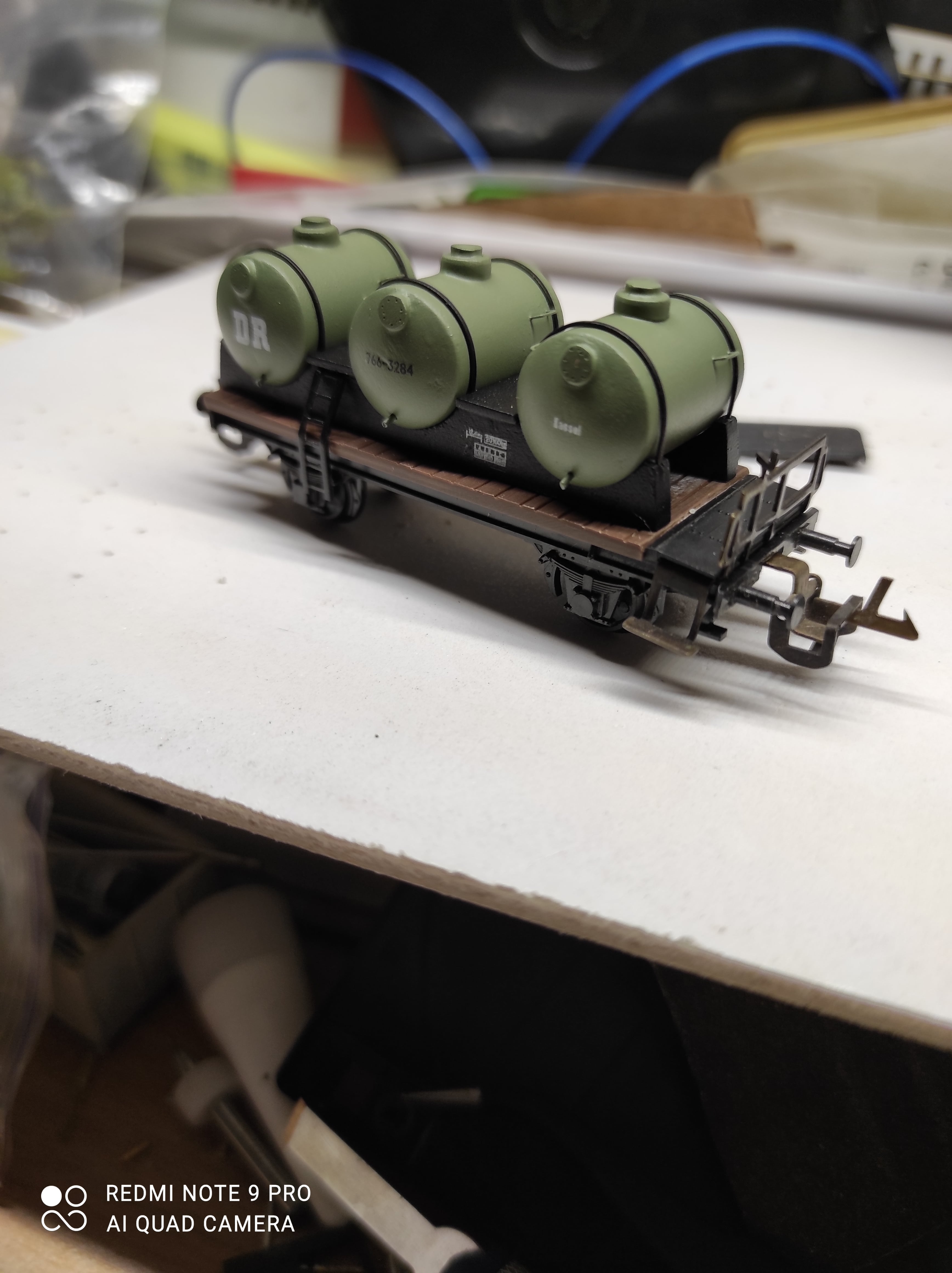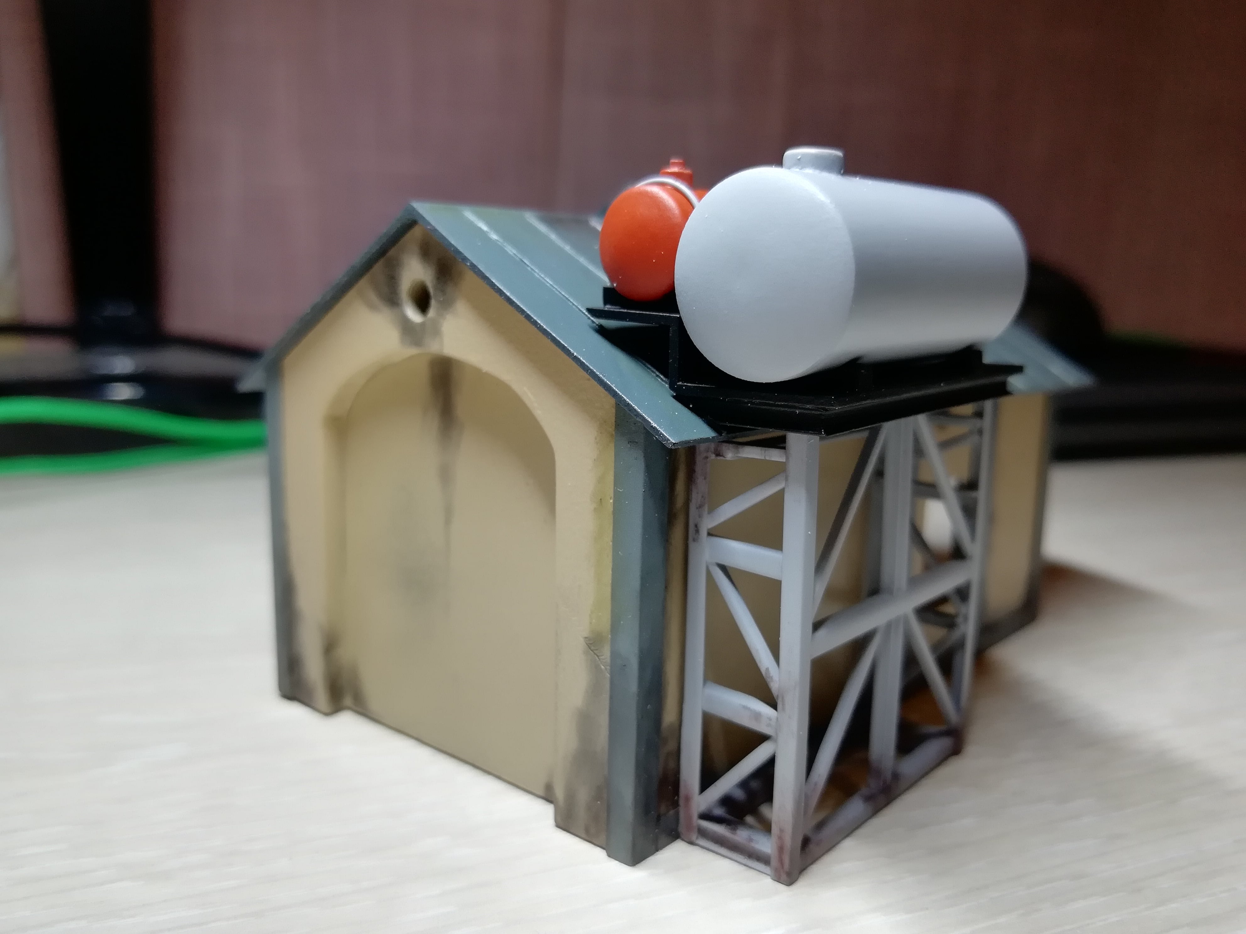 Пофарбував та обдекалив давно зроблені бочки. Притягнув їх металічними хомутиками до заготовлених раніш брусків.вклеїв трапи та драбинки. Болти на кришках горловин та бокових ревізіях на фото погано видно