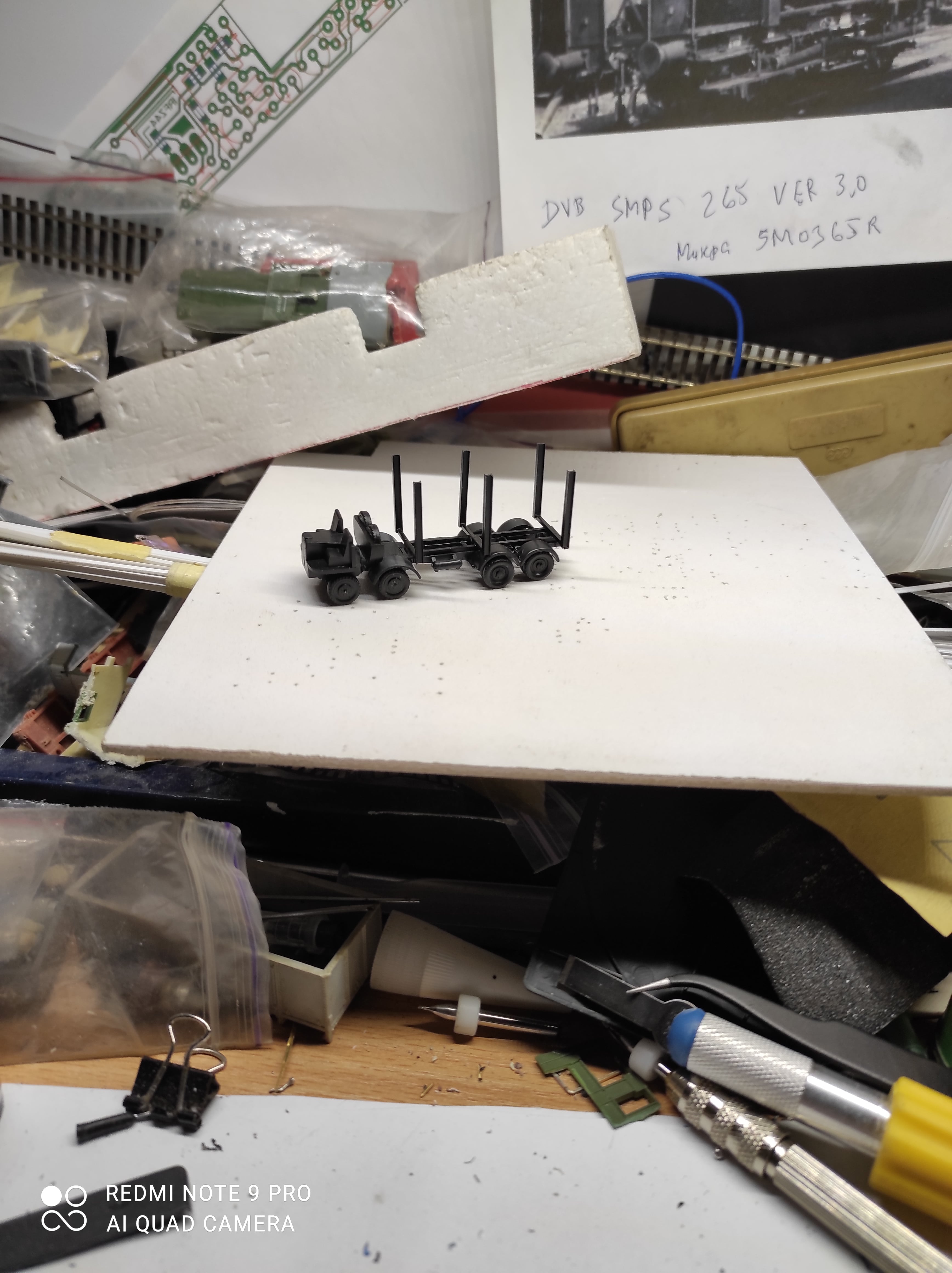 зафіга..ив дно зрамою для кузовка. Після сигаретки з чаем приклеїв до рами рессори такріплення зчіпок. Заліз знов в закрома(точно знаю що попадались на очі два 9мм бахмановських візка ) знайшов