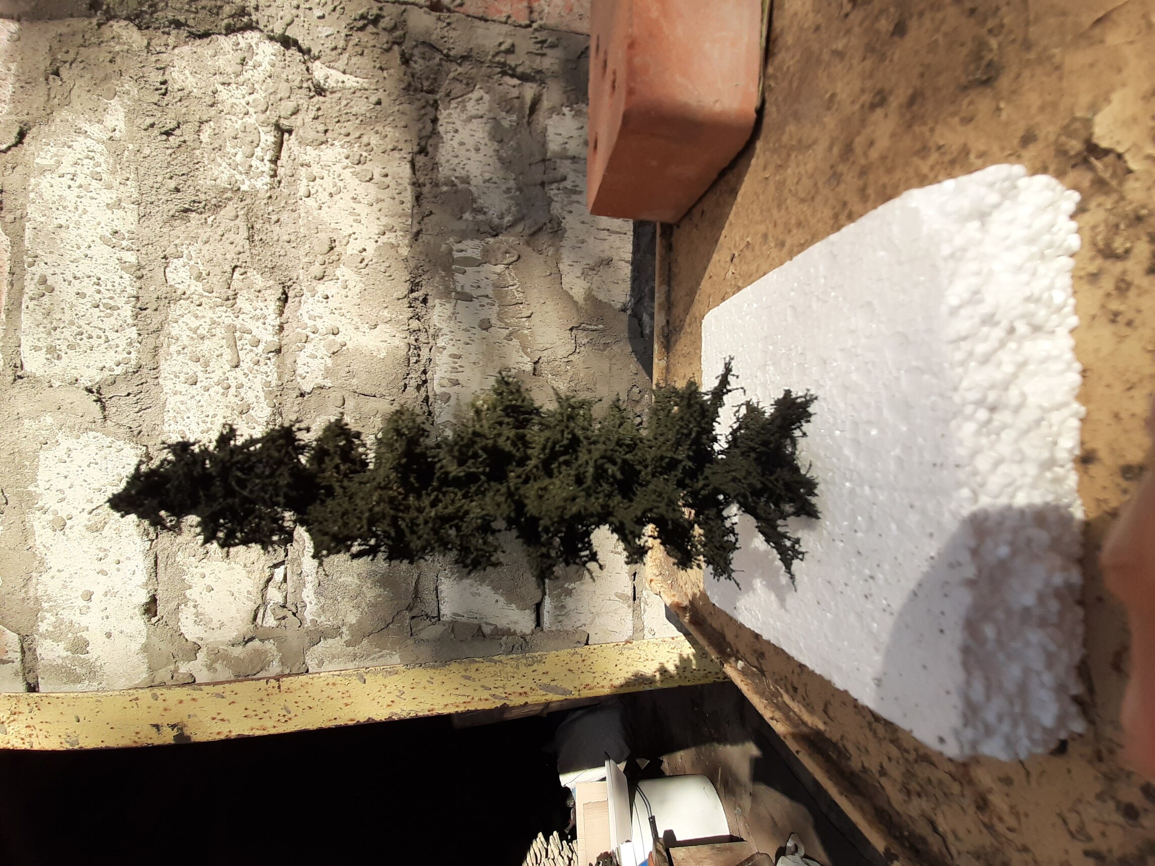 Вот попробовал сделать ёлочки по новой технологии. В последнем этапе обсыпки 2,5 мм флок заменил на обычные опилки и потом покрасил все темной зелёной краской из балончика. И ёлочки заиграли!