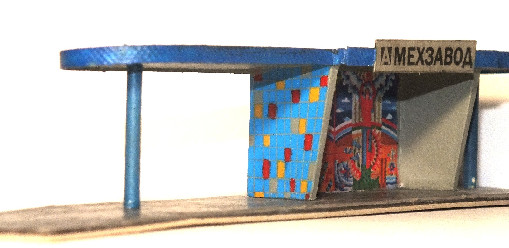И ещё из старого. Такое советское - советское... Конкретного прототипа нет, "по мотивам"...В основном картон , колонны - зубочистки, основа - смола по самодельной мастер-модели.Приклеил на картонную подкладку, - повело, начал обрезать с картона - сломал... Вот теперь ставлю на оргстекло. Задняя стена - "мозаика" - взята фотография из сети, распечатана,боковины - оклеены рекламной плёнкой, расчерчены иглой , швы и плитки - художественный акрил.