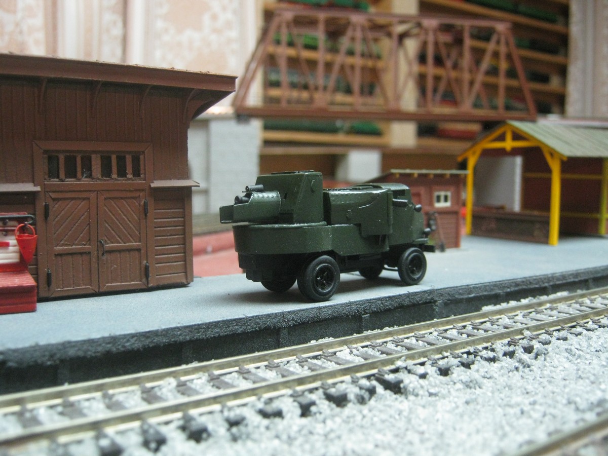 На ТЕХ фотографиях просматривается модель тяжёлой бронеплощадки ПТ-33 в окраске РККА. Прототип изготавливался на заводе "Красный Профинтерн" в 1933-34 годах. Всего было построено 12 шт.