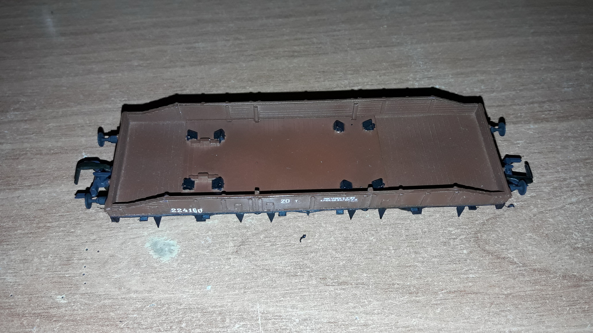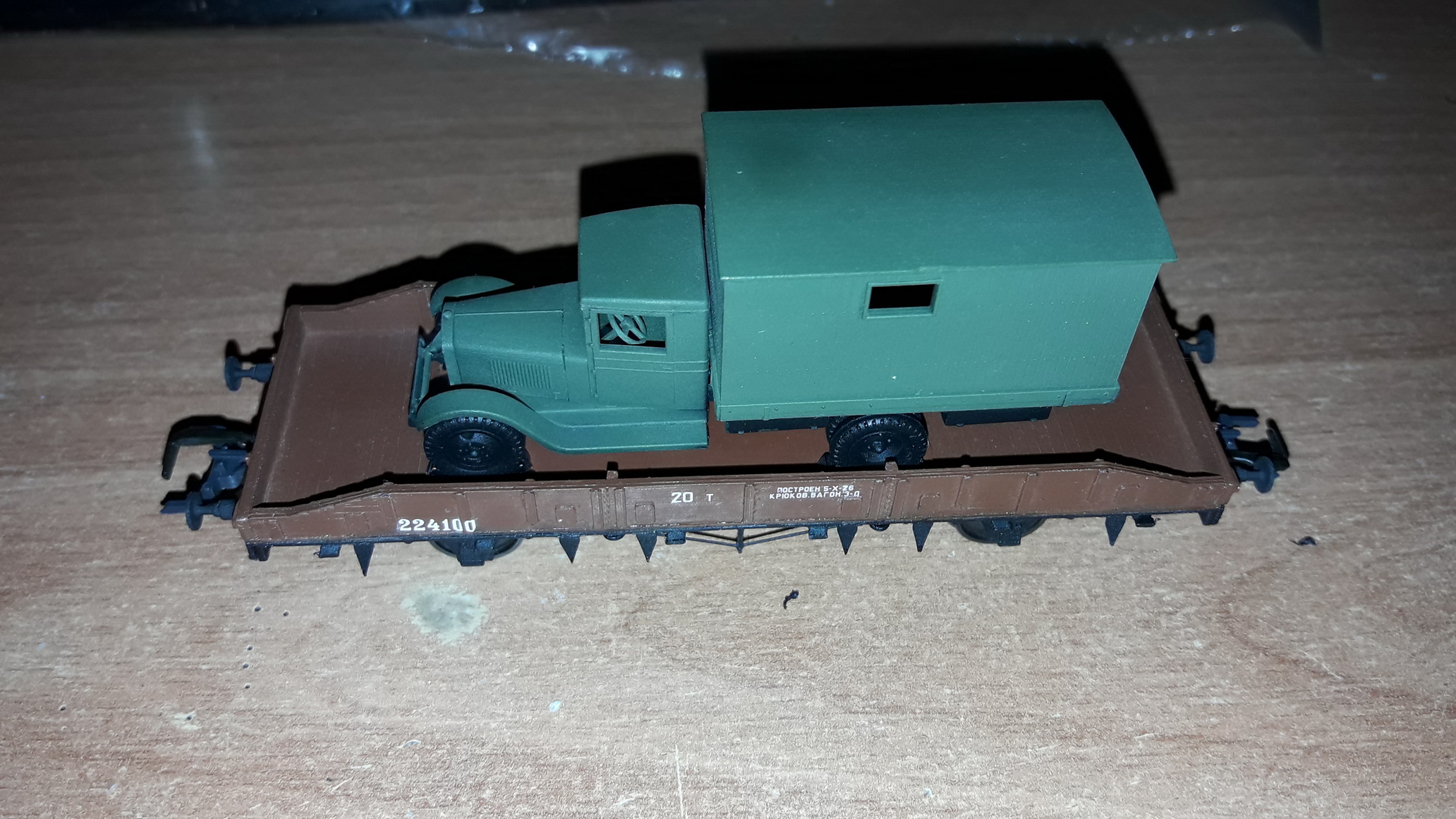 Платформа готова, не все декали только пока что. Что не портить клеем пол платформы, для установки груза (ЗиС-5) сделал обманку-имитацию пола, куда уже и наклеил башмаки для удержания авто.