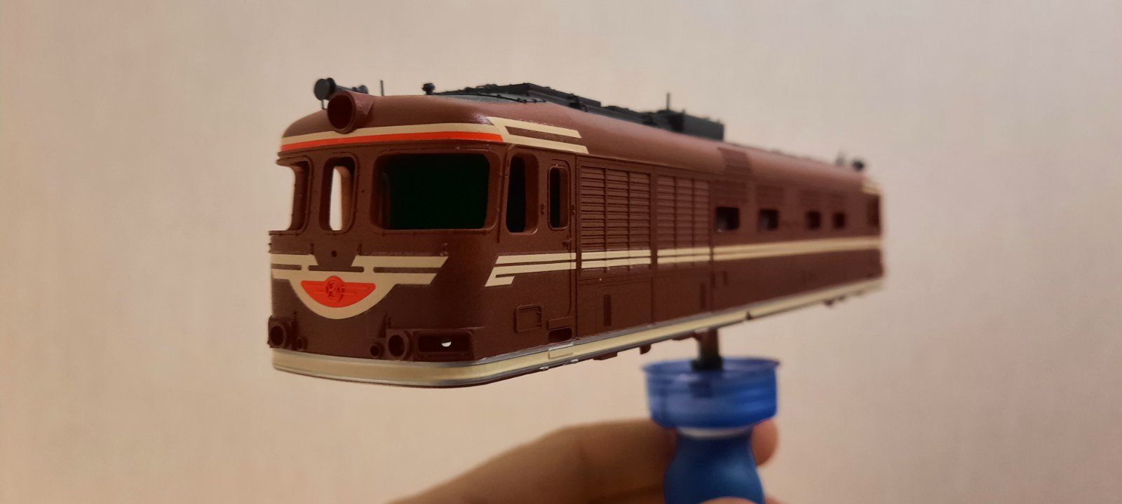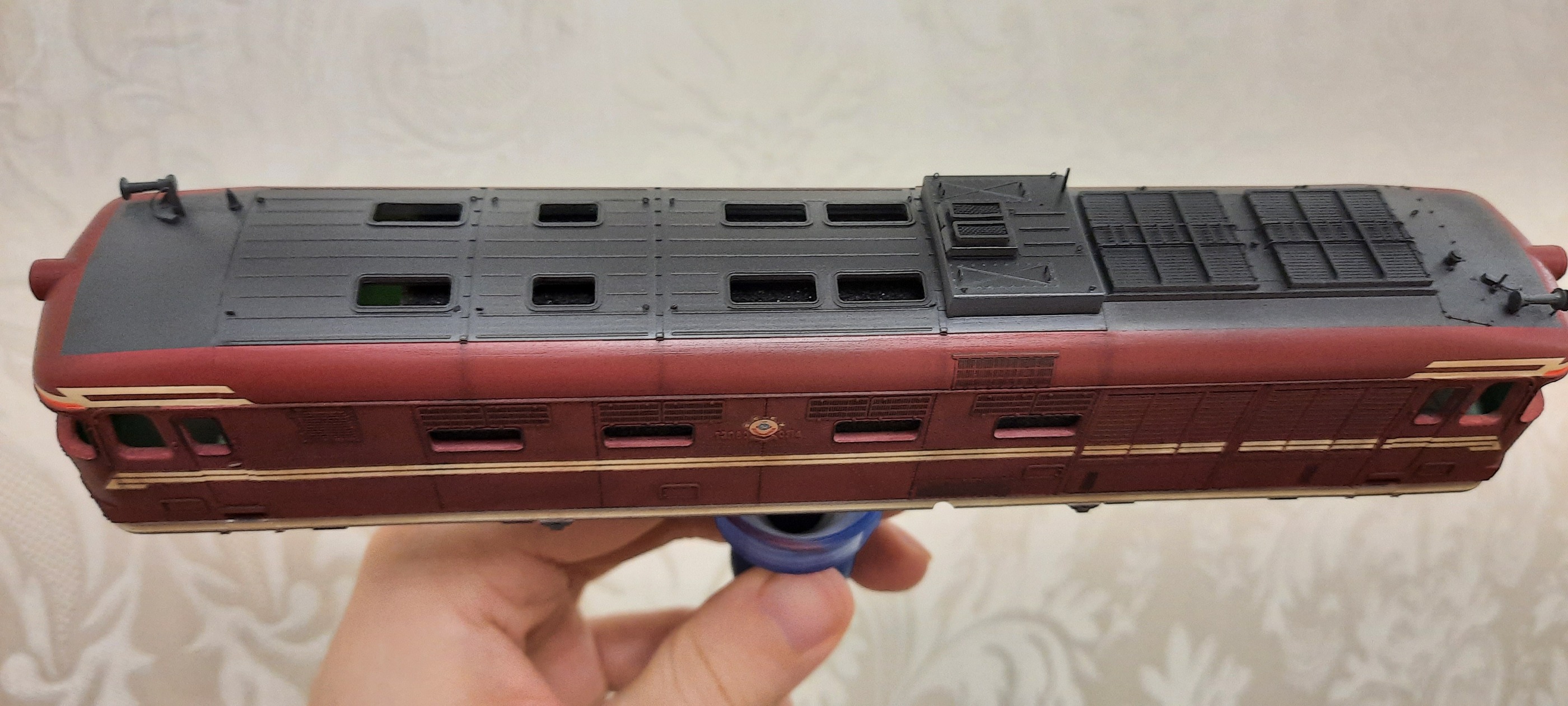 Декали на четвёртом кузове ТЭП60 уже наносятся увереннее, чем раньше, и я уже не боюсь, что можно запороть предыдущие процессы. Яркий настольный свет просто извращает цвет на фото.