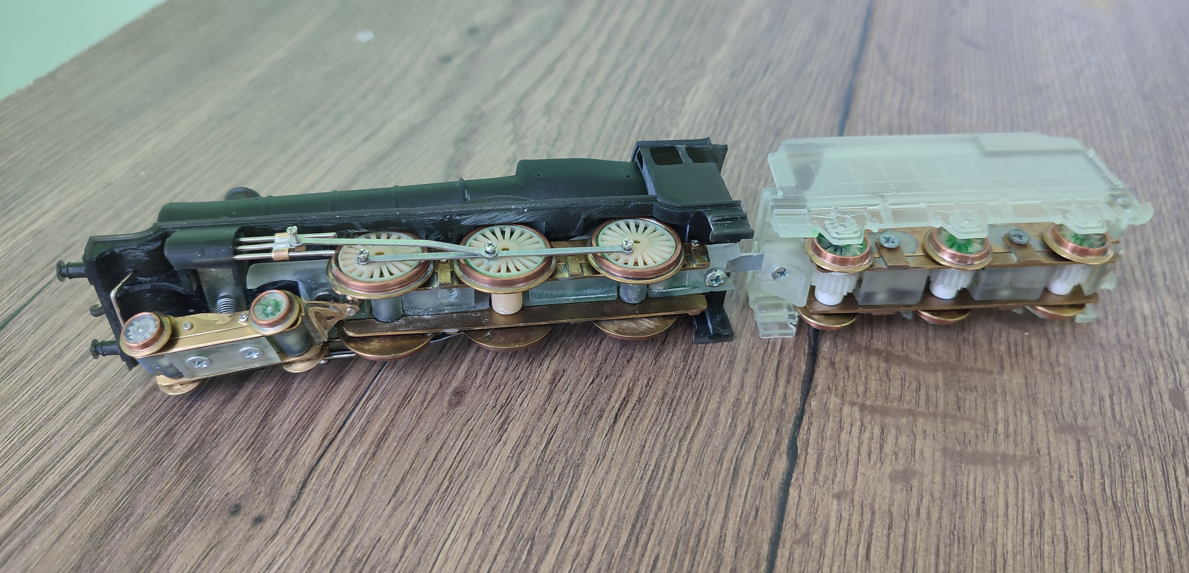 давно не обновлял тему. Пока выкладываю некоторый прогресс по паровозу GWR 4900. Доделала механическую часть тендера. В принципе по конструкции тоже самое, что делал в тендере Ов, только шестеренок больше в два с лишних раза и немного оптимизировал конструкцию, от привода на две колпары пришлось отказаться, так как то, чего хватало на увереную езду овечки, совершенно не хватало на более тяжелый паровоз, что вылилось в необходимость перепроектировать и делать наново ходовую. Осталось позачищать поддержки и сделать кое какую мелочевку перед грунтовкой и покраской. В процессе пришел к выводу, что Су буду точно делать с двигателем в тендере