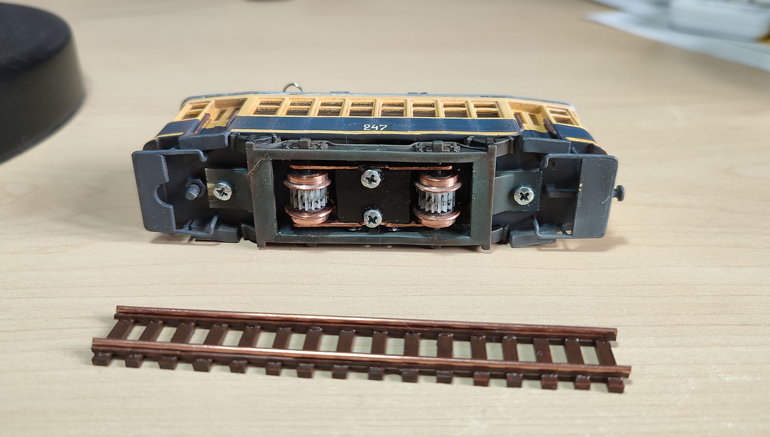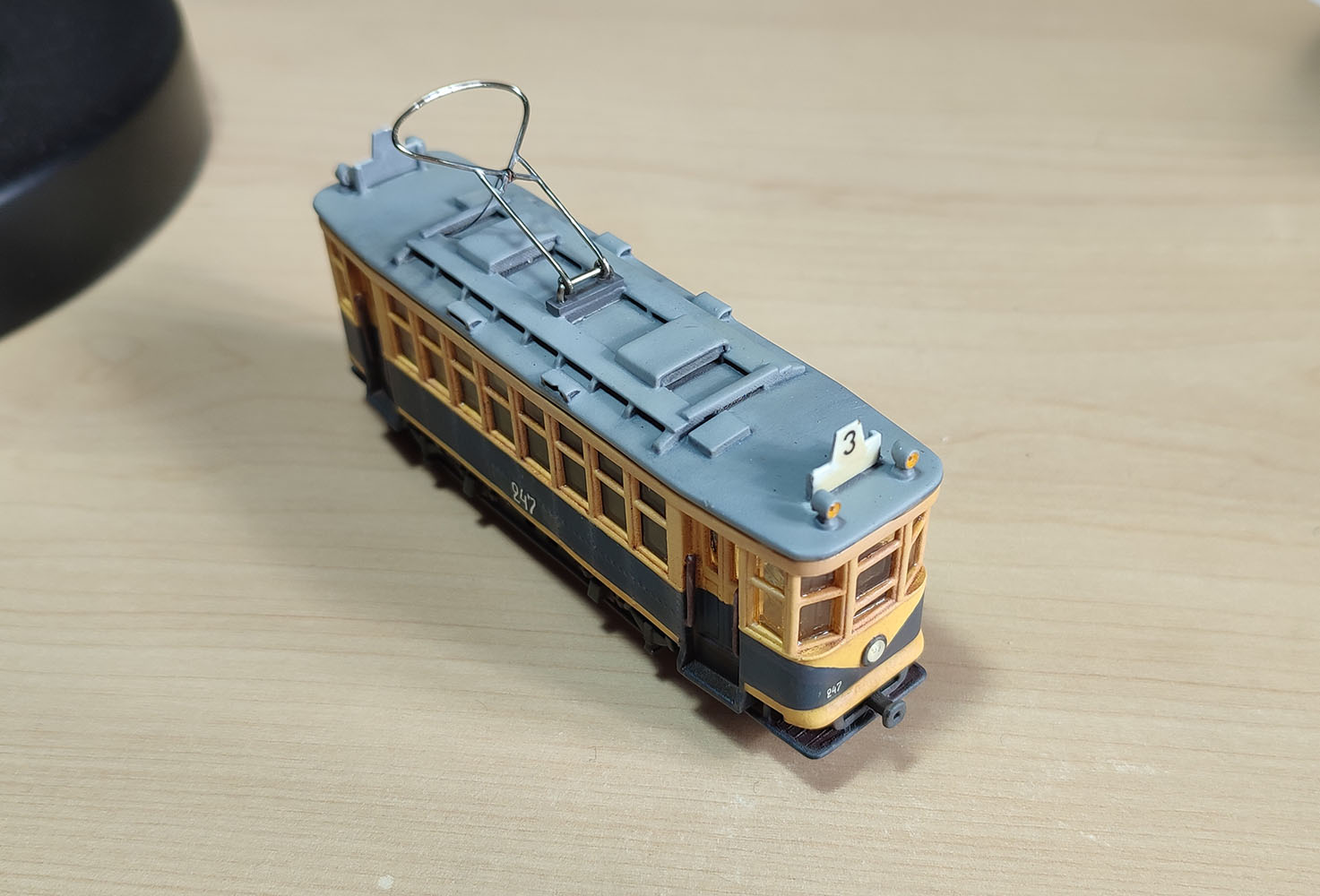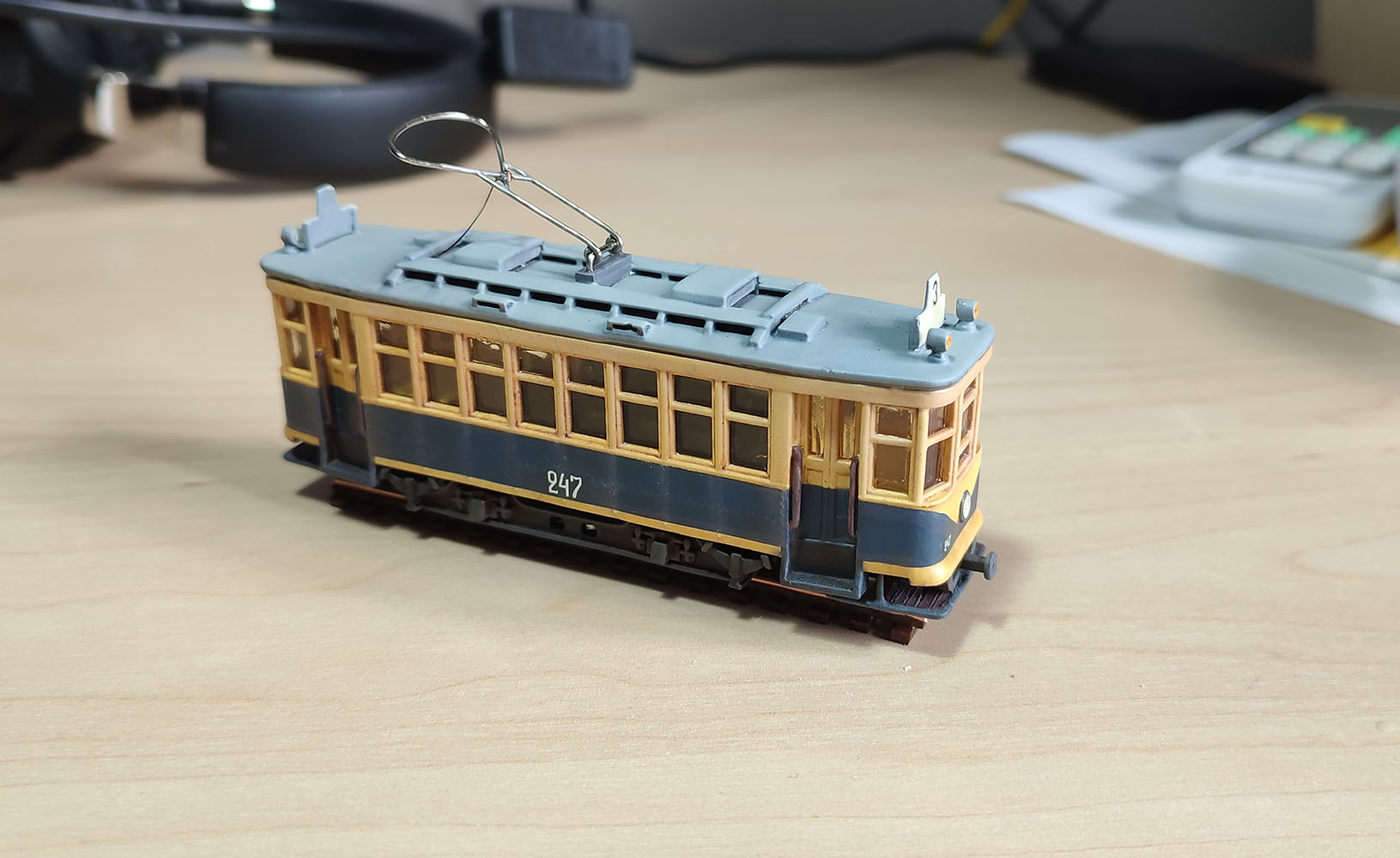 наконец добил долгострой в виде Х в харьковской окраске. Ездить он будет по настольному микромакету 55х55 см, поэтому у него колея 9 мм, что не достоверно. Из крупных косяков - плохая окраска и на некоторых впадинах легла шагренью, хотя везерингом я более менее доволен и он меньше похож на игрушку чем без него. Очень толстые поручни (на тот момент я не догадался сделать их их витой пары) и делал из скрепок. Ну и смолу на окнах в теории можно отполировать, но у меня это не получилось и покрыл толстым слоем лака что б прозрачность была приемлемая, что дало желтоватый оттенок и неоднородность.