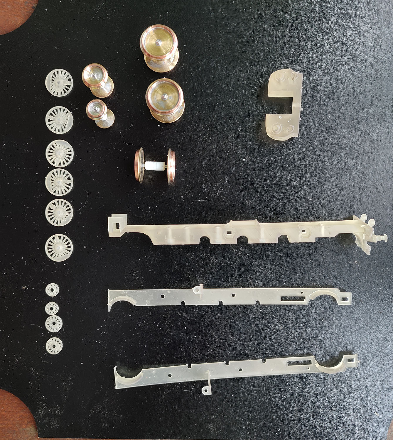 Ну и что б далеко не ходить, пока набита рука и не отложены далеко инструменты, то начал делать раму паровоза Су (колеса уже давно выточил). Тут как обычно, напечатаная из смолы середина, куда на вклеенные внутрь гайки закручиваются на винта латунные боковины. Надо придумать как сделать подпружиненый по вертикали поводок для бегунка и поддерживающего колеса