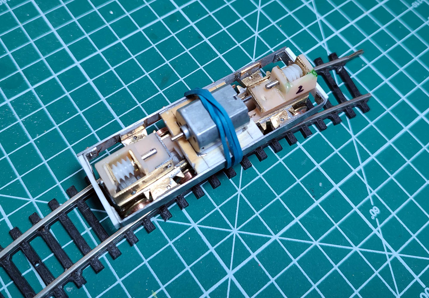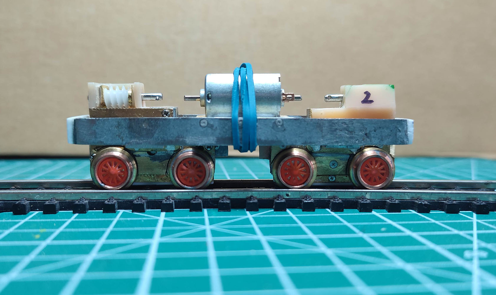 собрал раму. Из нескольких вариантов передачи вращения, лучший результат показала пружина из проволоки 0.1 (только она слишком мягкая и не держит форму). Поэтому заказал на Али прожины из 0.2 и 0.3 мм. Изоляция от тонких проводов оказалась слишком жесткой и на кривой двигатель с трудом вращал обе тележки. Так как боковины рамы изолированы, то ток планирую брать прямо с них. Для разборки выкручиваются винты сбоку (на фото это с другой стороны), боковина снимается и тележки вываливаются