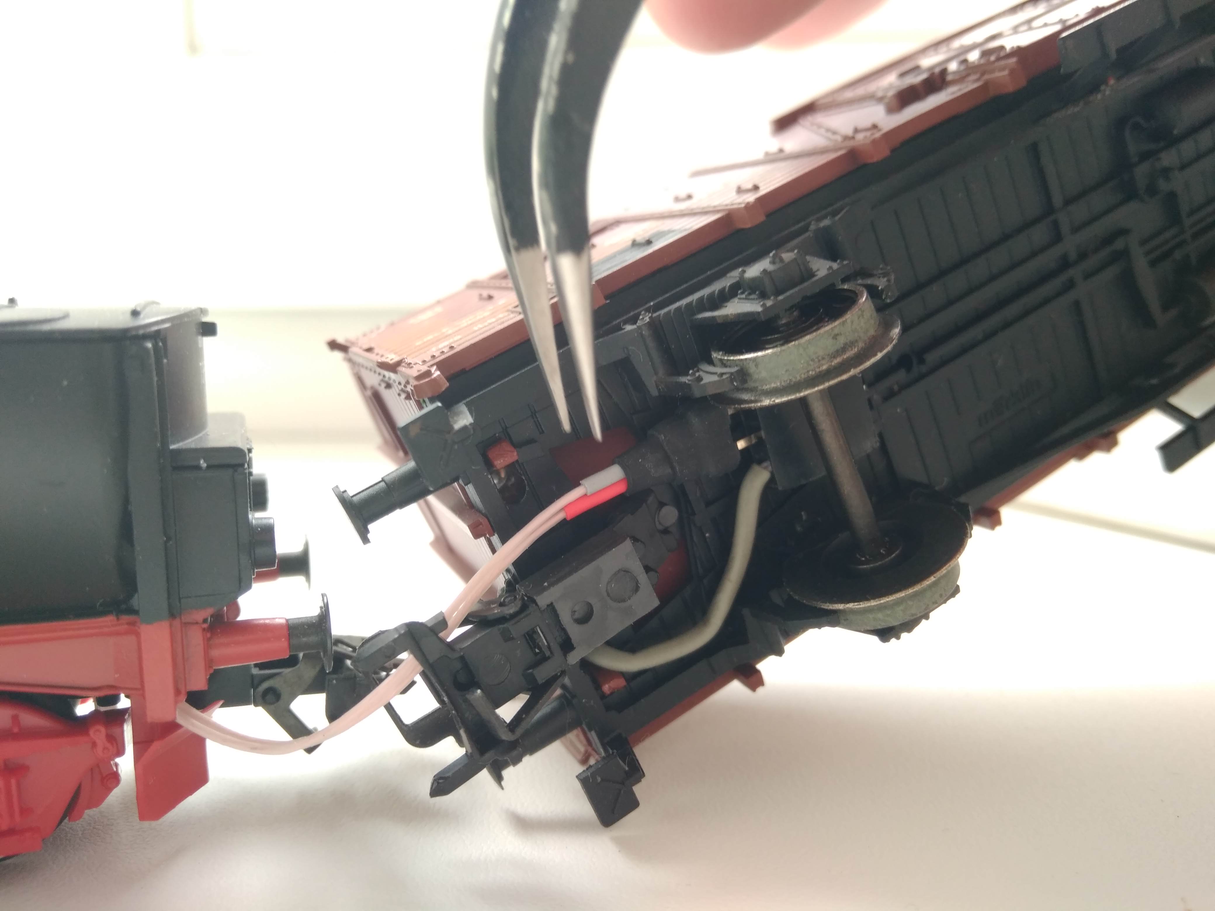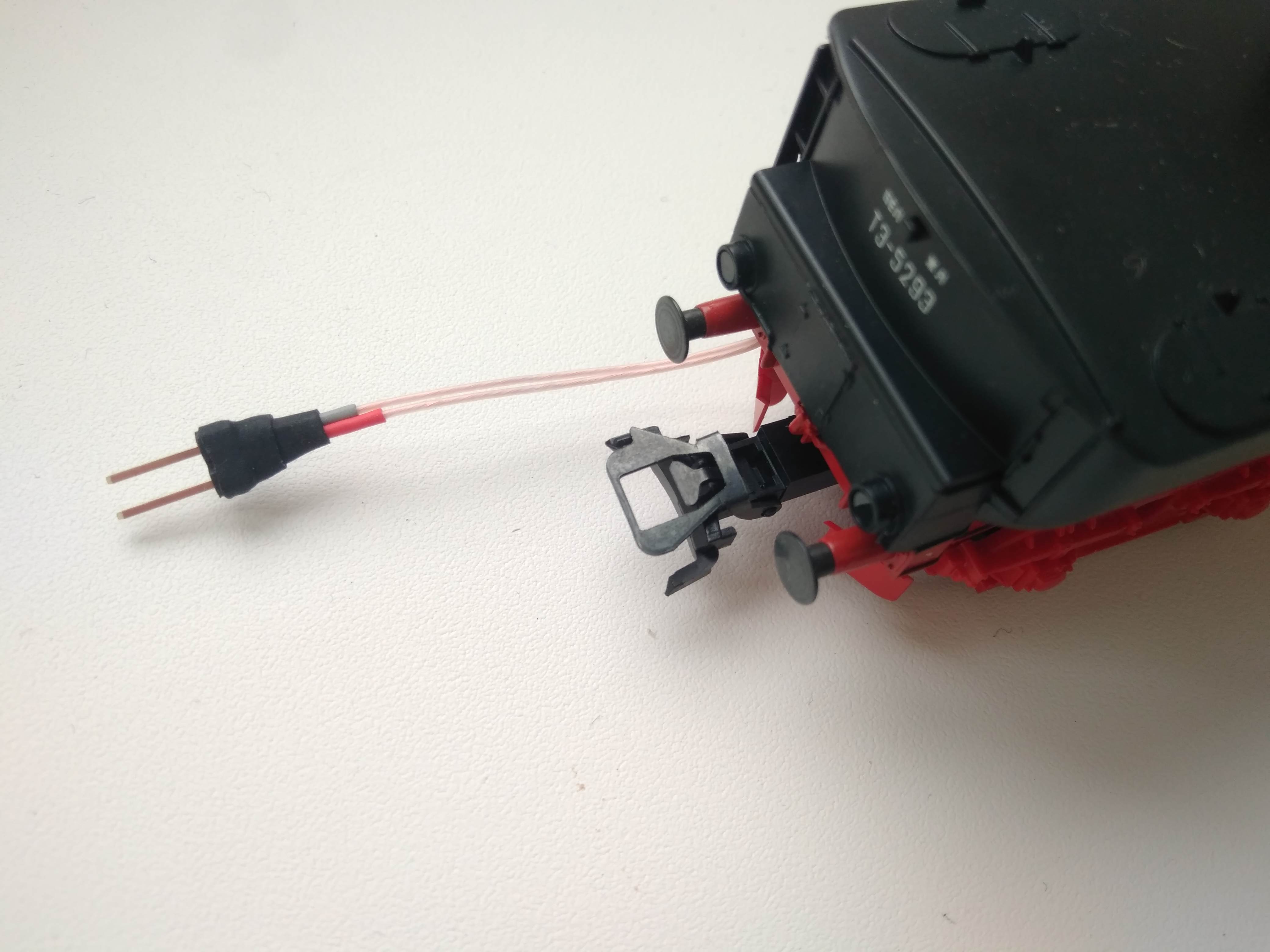 Вспомнил про маленькую не доделку тогдашнюю, питающие провода из вагона в тендер... и решил её исправить... сделал микроразъём.. Вилку на тендере, и розетку скрытую на вагоне... ..провода чёрным подкрашу... сейчас просто нечем это сделать