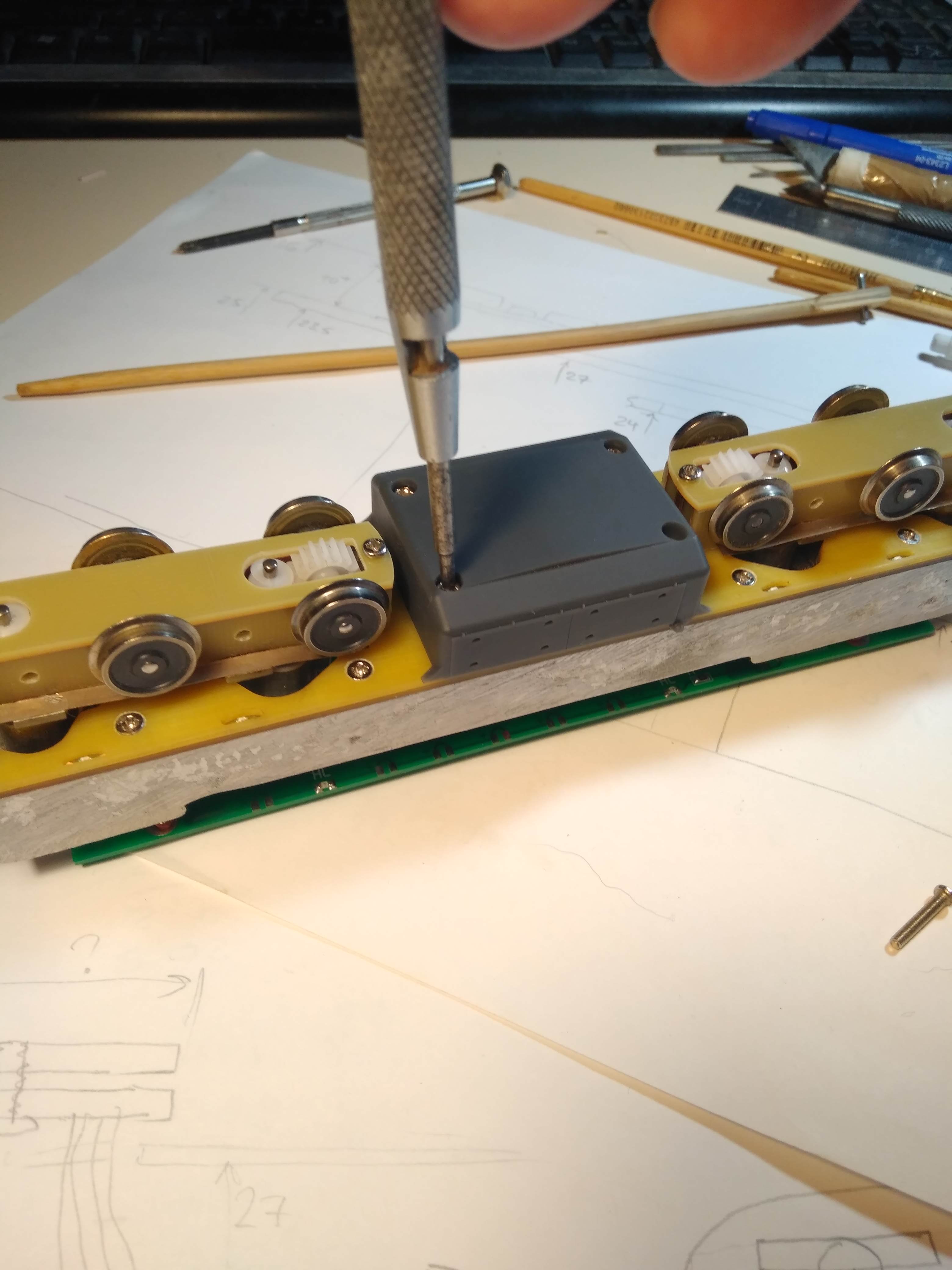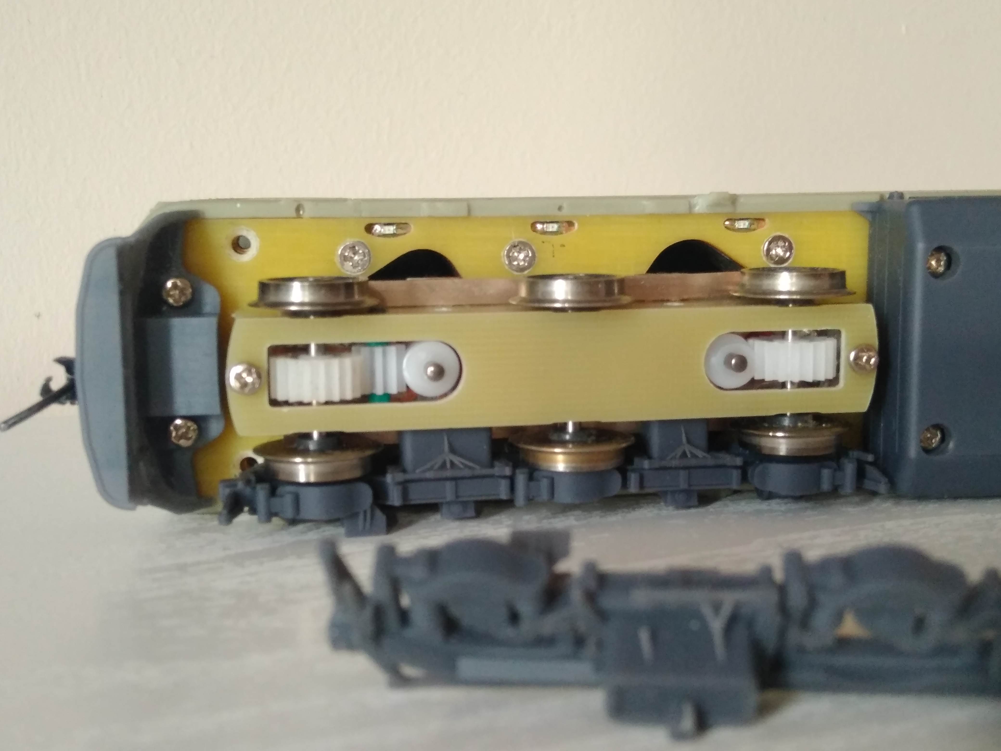 Тележка с о всеми интересными внутренностями... и видны светодиодики подсветки экипажки... крепление метельника к раме на винтах...