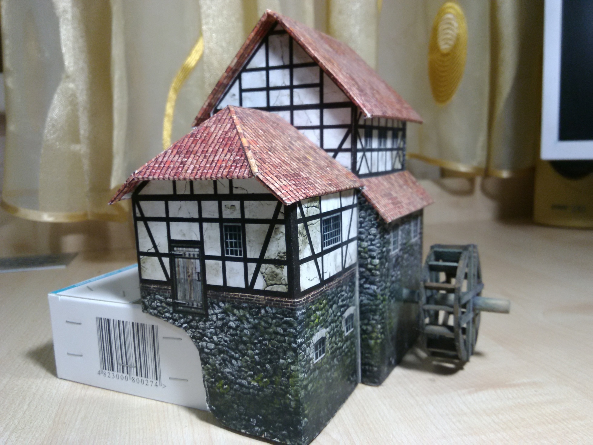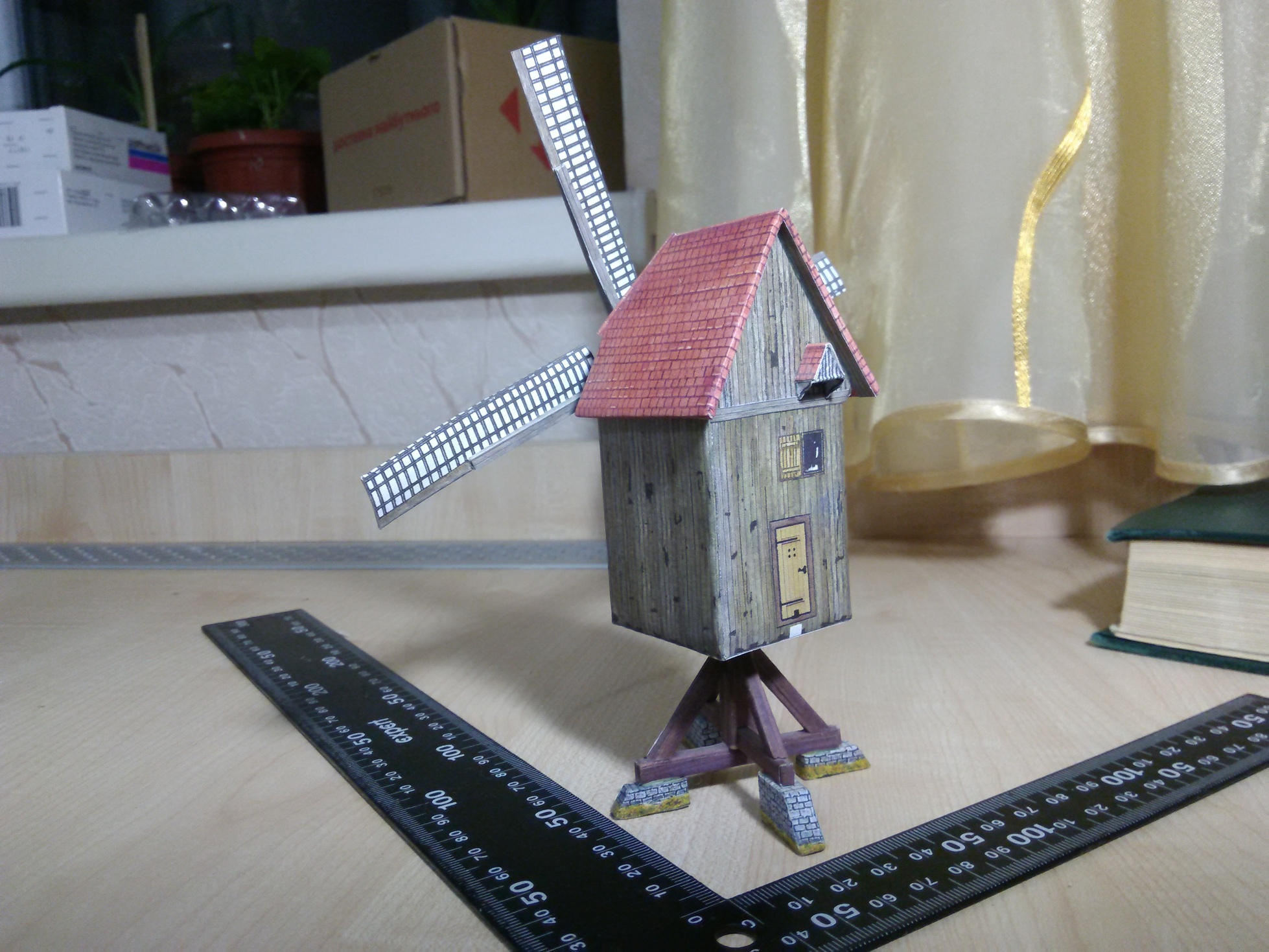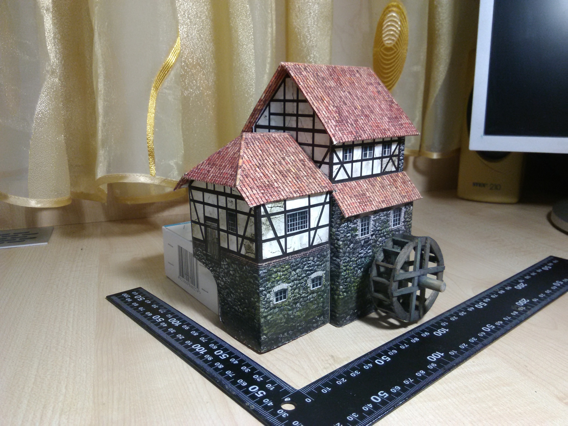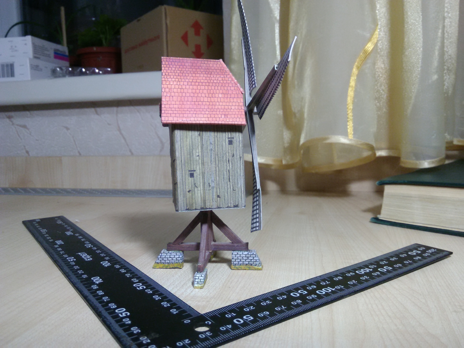 По времени - да бог его знает сколько ушло. Но не много - 2-3 дня на каждое изделие. Много времени отнимает поиск по сети всяких текстур, окон, дверей и т.п. А также изучение материалов - по тем же фахверковым домам. Просмотрел кучу материалов по конструкции, кучу фоток, чтобы посмотреть какие окна делали, ставни, крыши, как располагали балки ну и т.п., чтобы потом дом был хоть немного похож на свои прототипы. Нашел на бумажноделательных сайтах готовые модели, тоже их смотрел. Например вдохновение по мельнице черпал здесь: