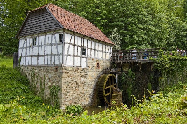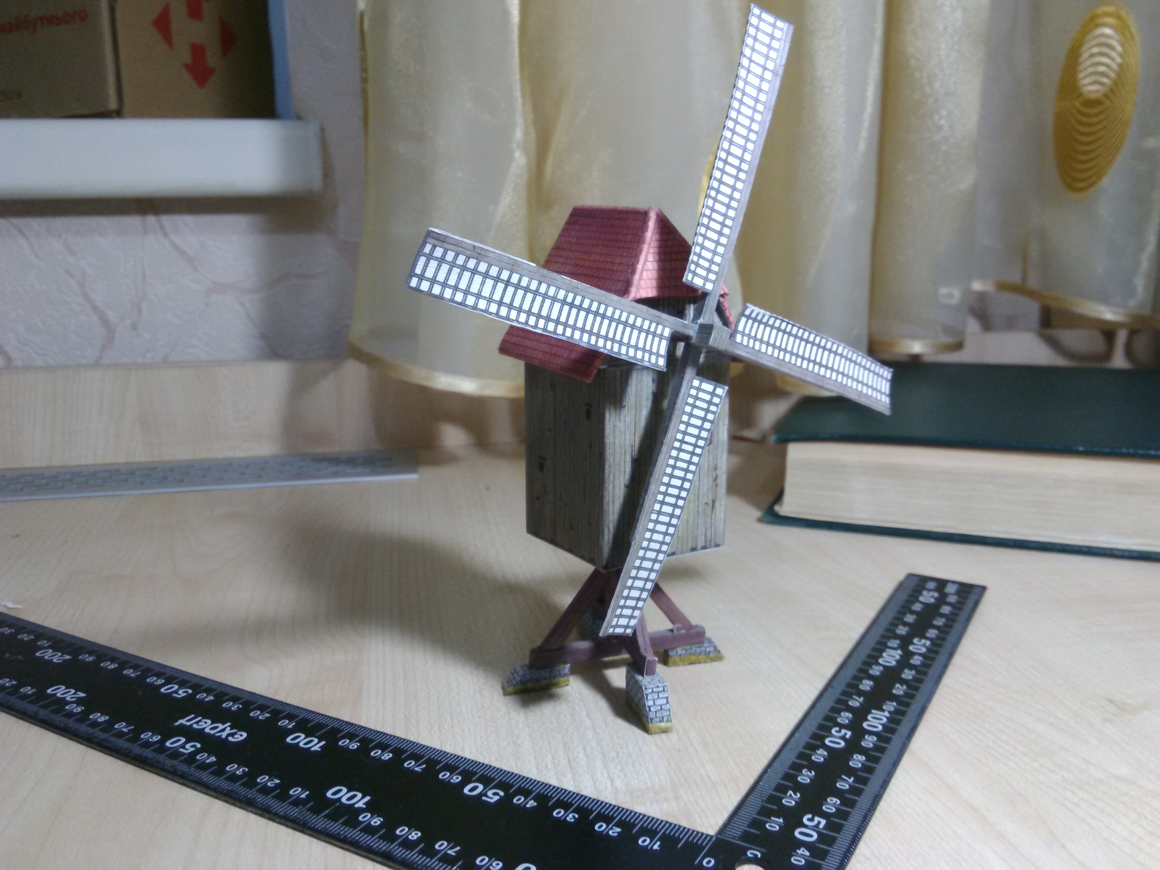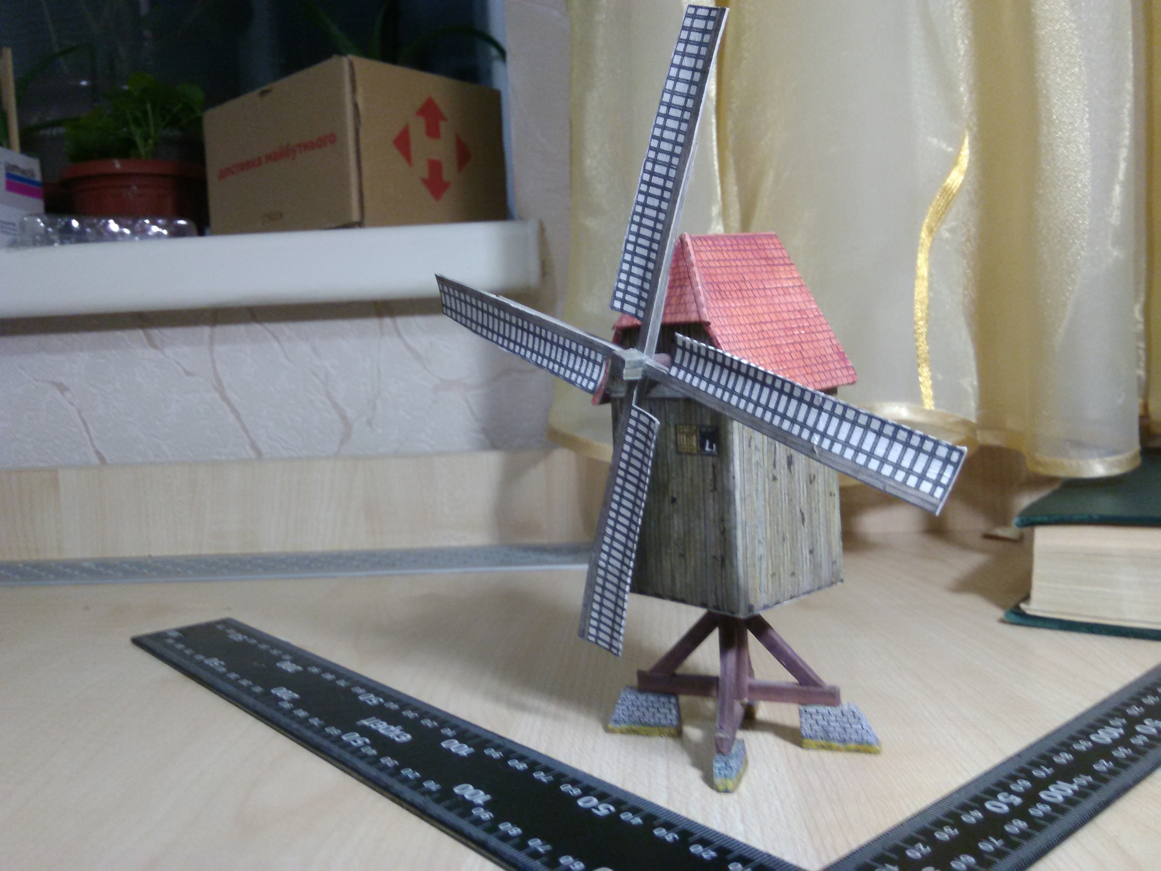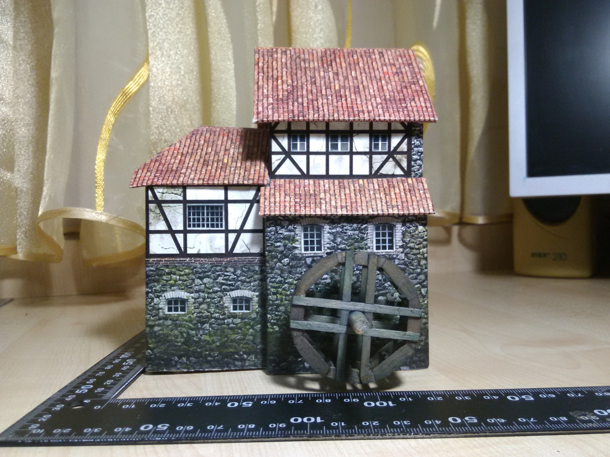По времени - да бог его знает сколько ушло. Но не много - 2-3 дня на каждое изделие. Много времени отнимает поиск по сети всяких текстур, окон, дверей и т.п. А также изучение материалов - по тем же фахверковым домам. Просмотрел кучу материалов по конструкции, кучу фоток, чтобы посмотреть какие окна делали, ставни, крыши, как располагали балки ну и т.п., чтобы потом дом был хоть немного похож на свои прототипы. Нашел на бумажноделательных сайтах готовые модели, тоже их смотрел. Например вдохновение по мельнице черпал здесь: