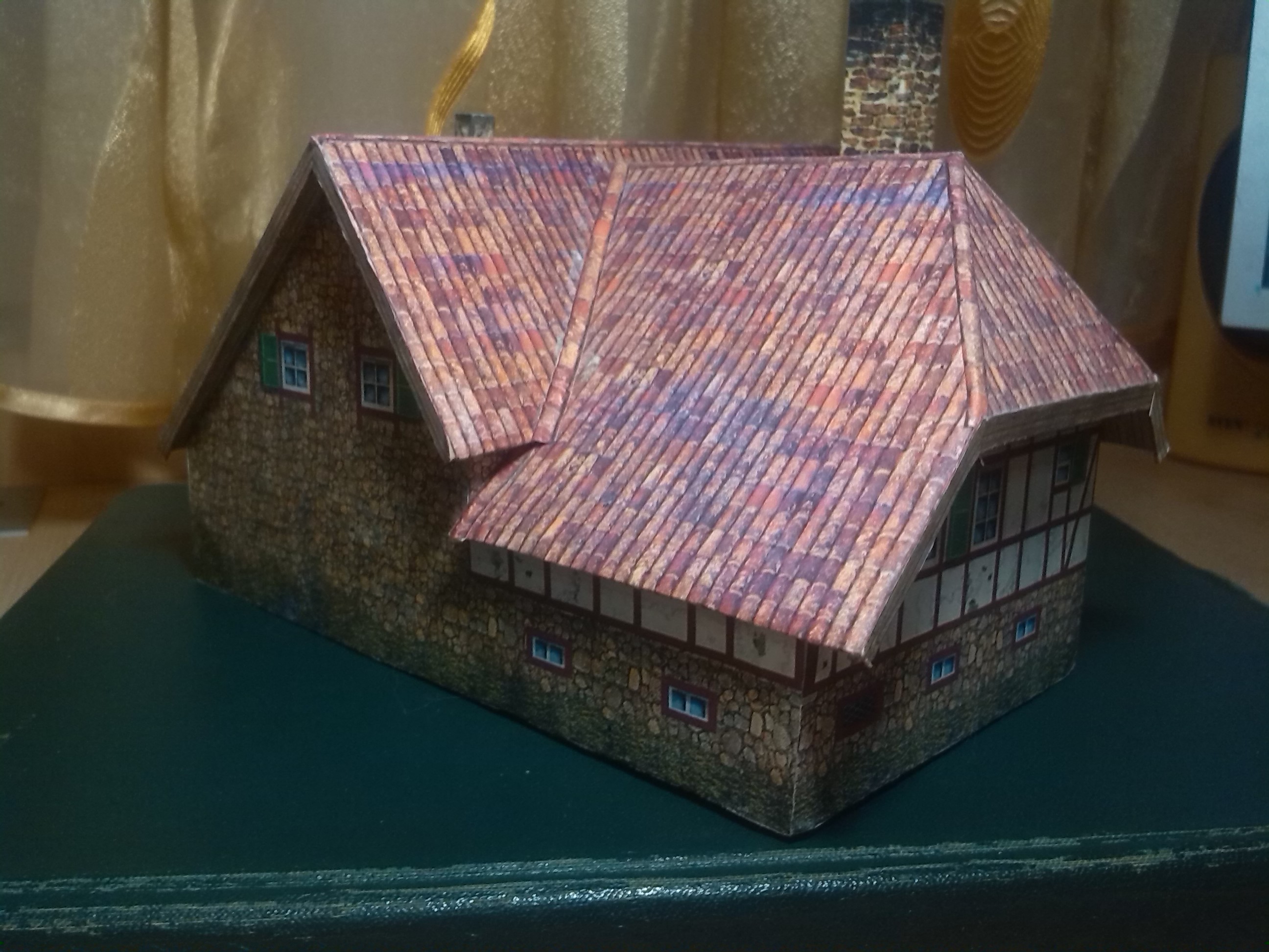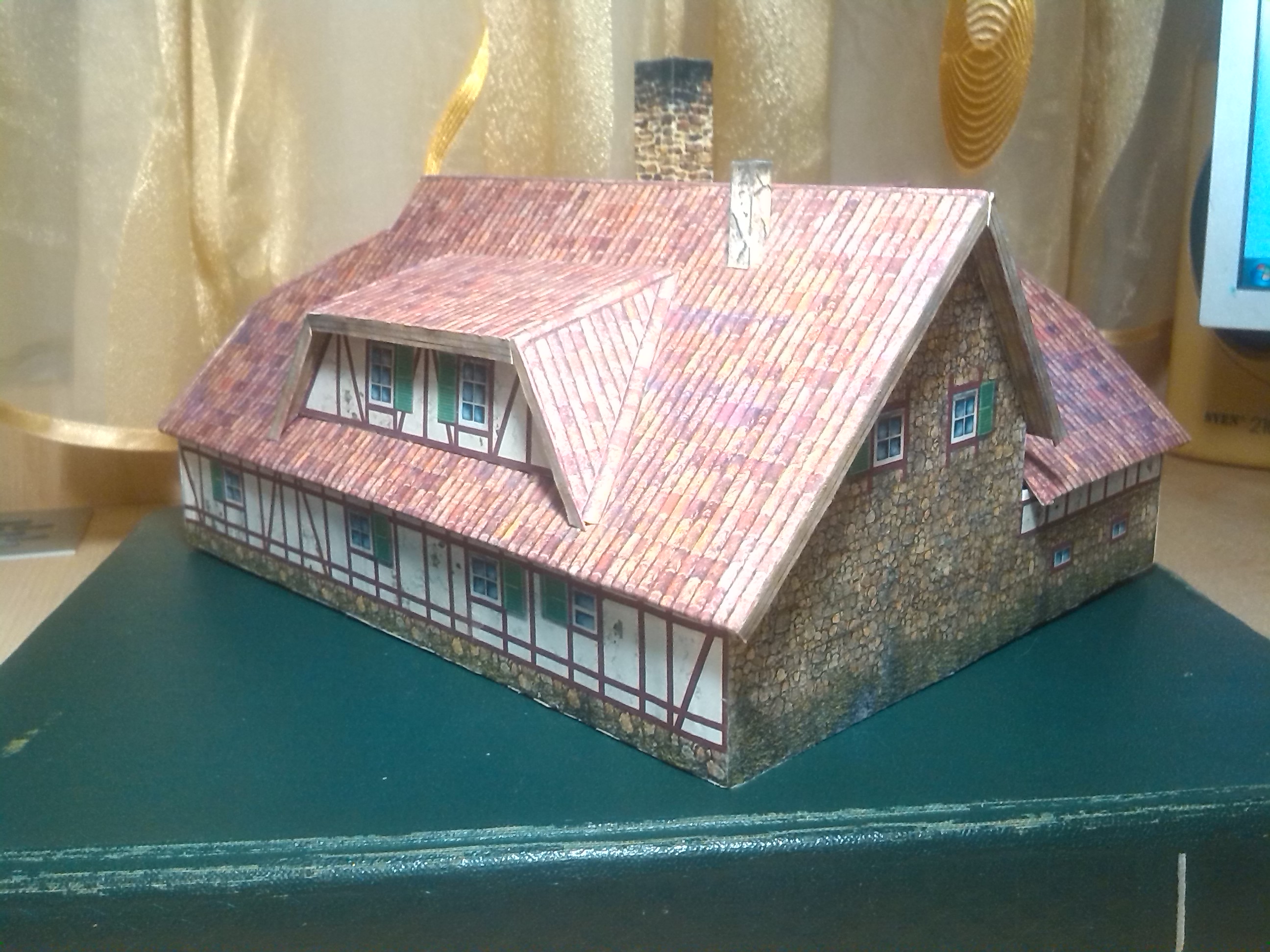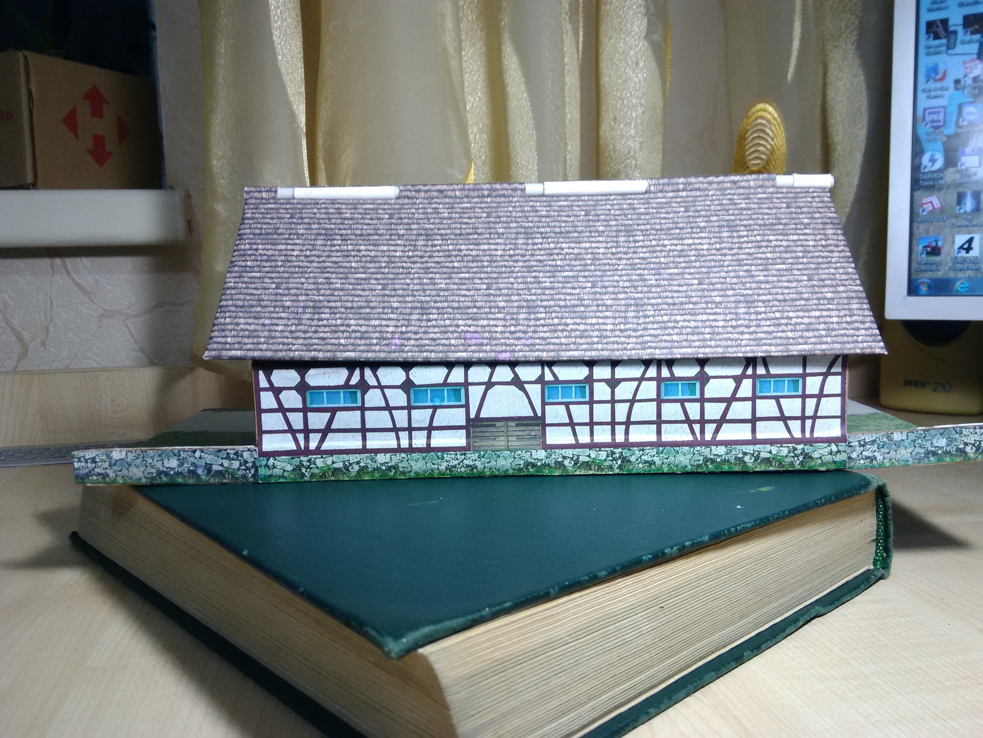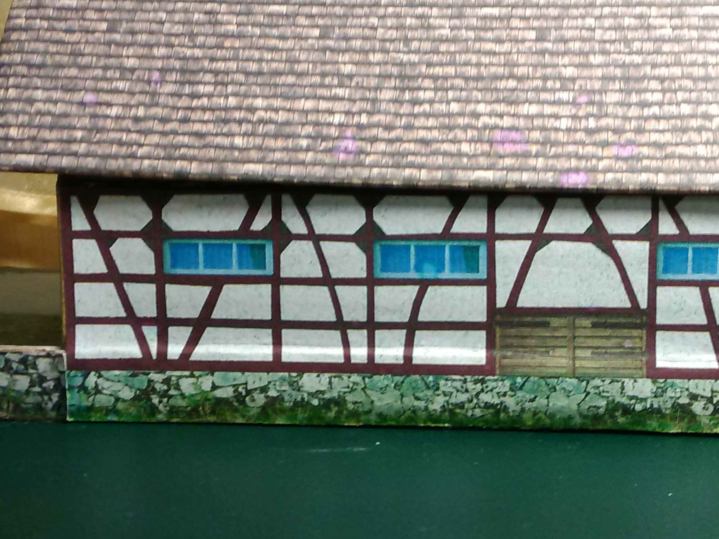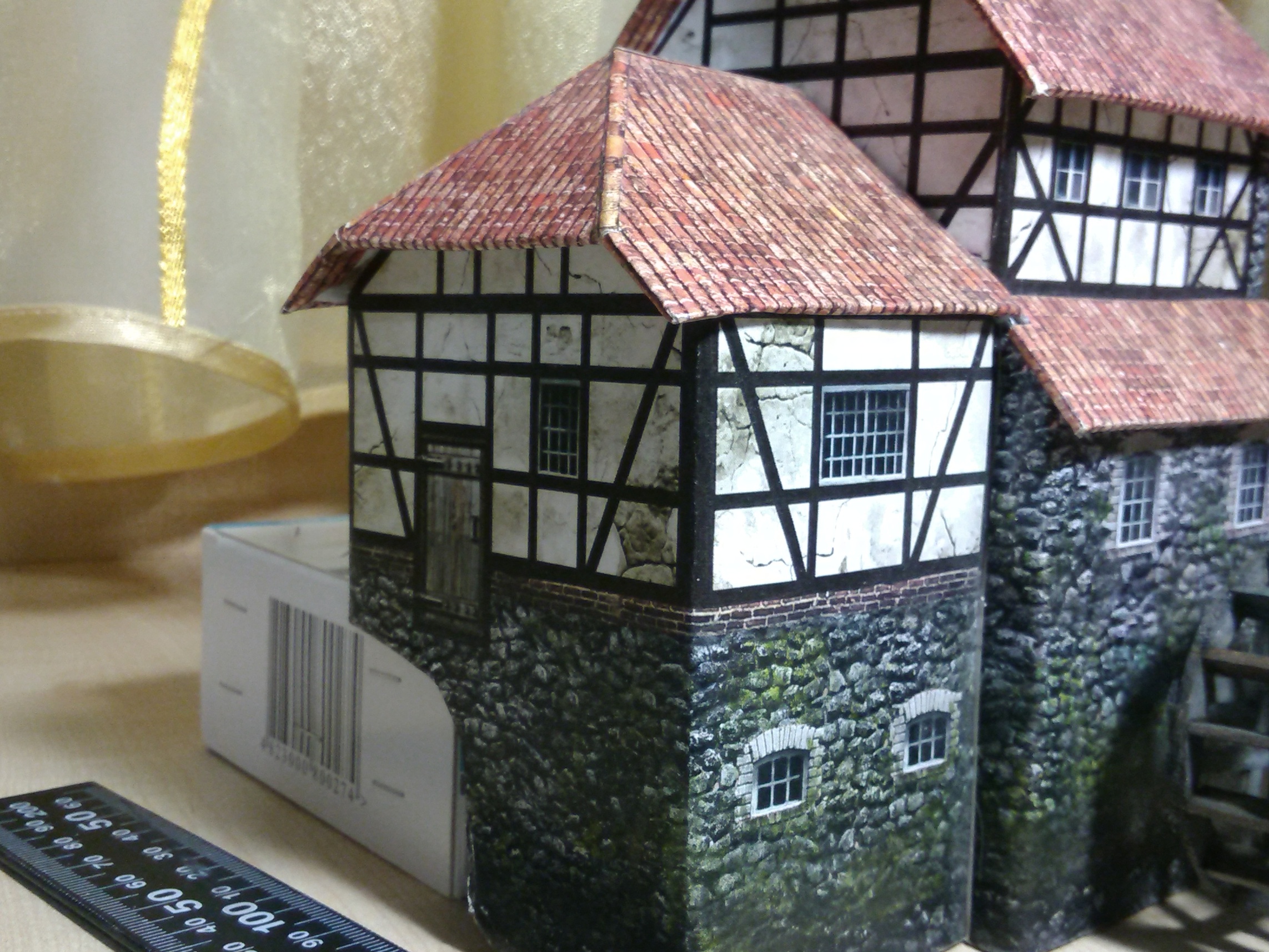 Дальше пошел процесс изготовления в Фотошопе цветной развертки по уже имеющимся размерам. Тут все сделано с нуля из головы с использованием фотоматериалов по немецким фахверковым домам. Окна, ставни, двери, текстуры каменной кладки, штукатурки ну т.д. - все из сети. Эффект обрастания стен мхом - на текстуру готовой стены нанесено несколько слоев зеленого разных оттенков, кое-где добавлено тени, в общем поигрался цветами. Тени в окнах, под ставнями, под крышей тоже прорисовал. Распечатал и обклеил. Все. К сожалению сам процесс не документировался, но с другой стороны все вроде понятно. Если что - спрашивайте.