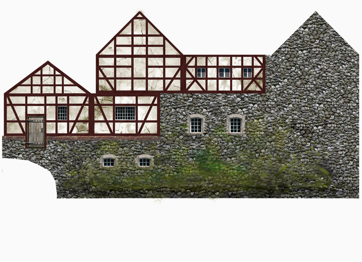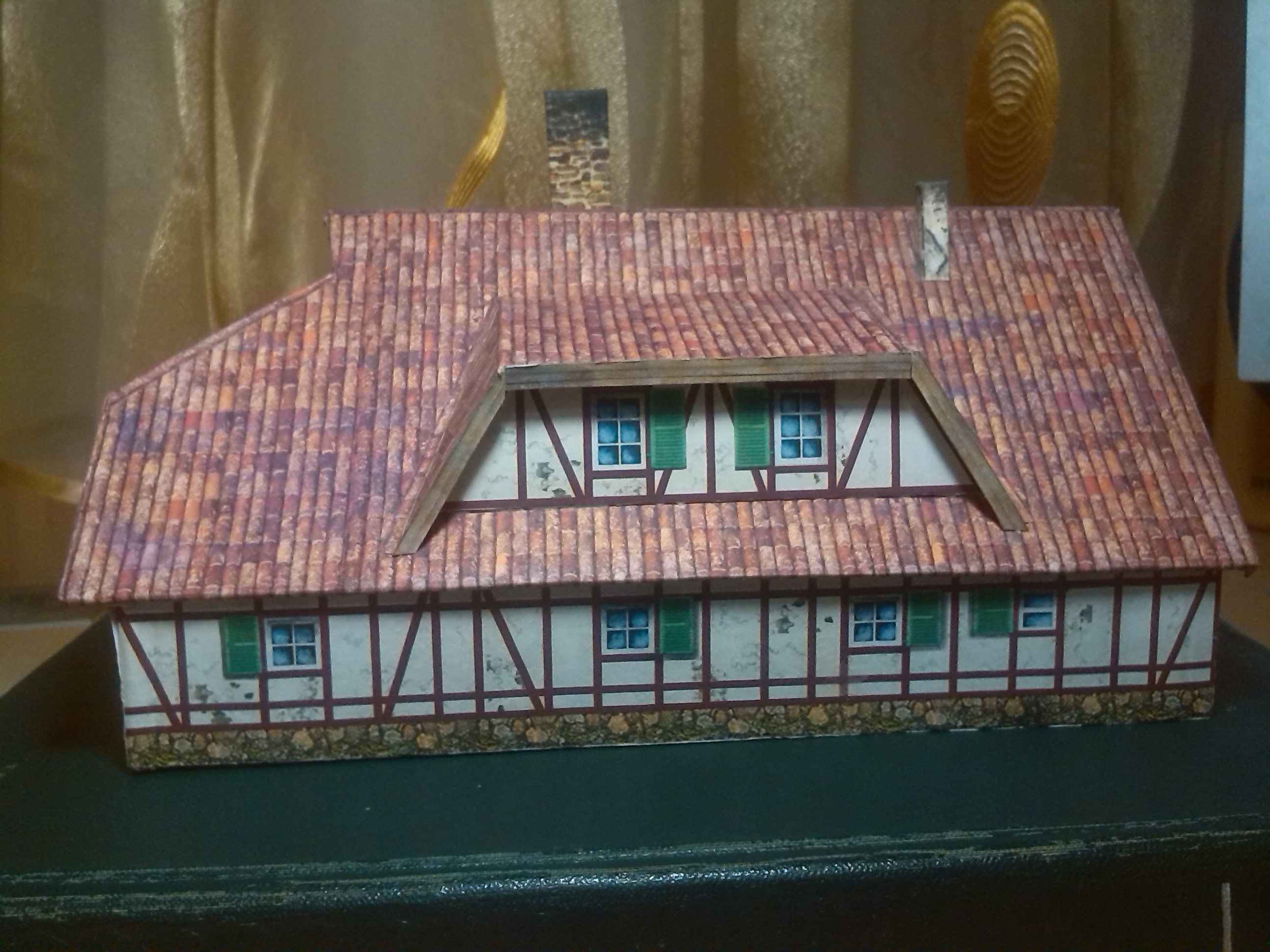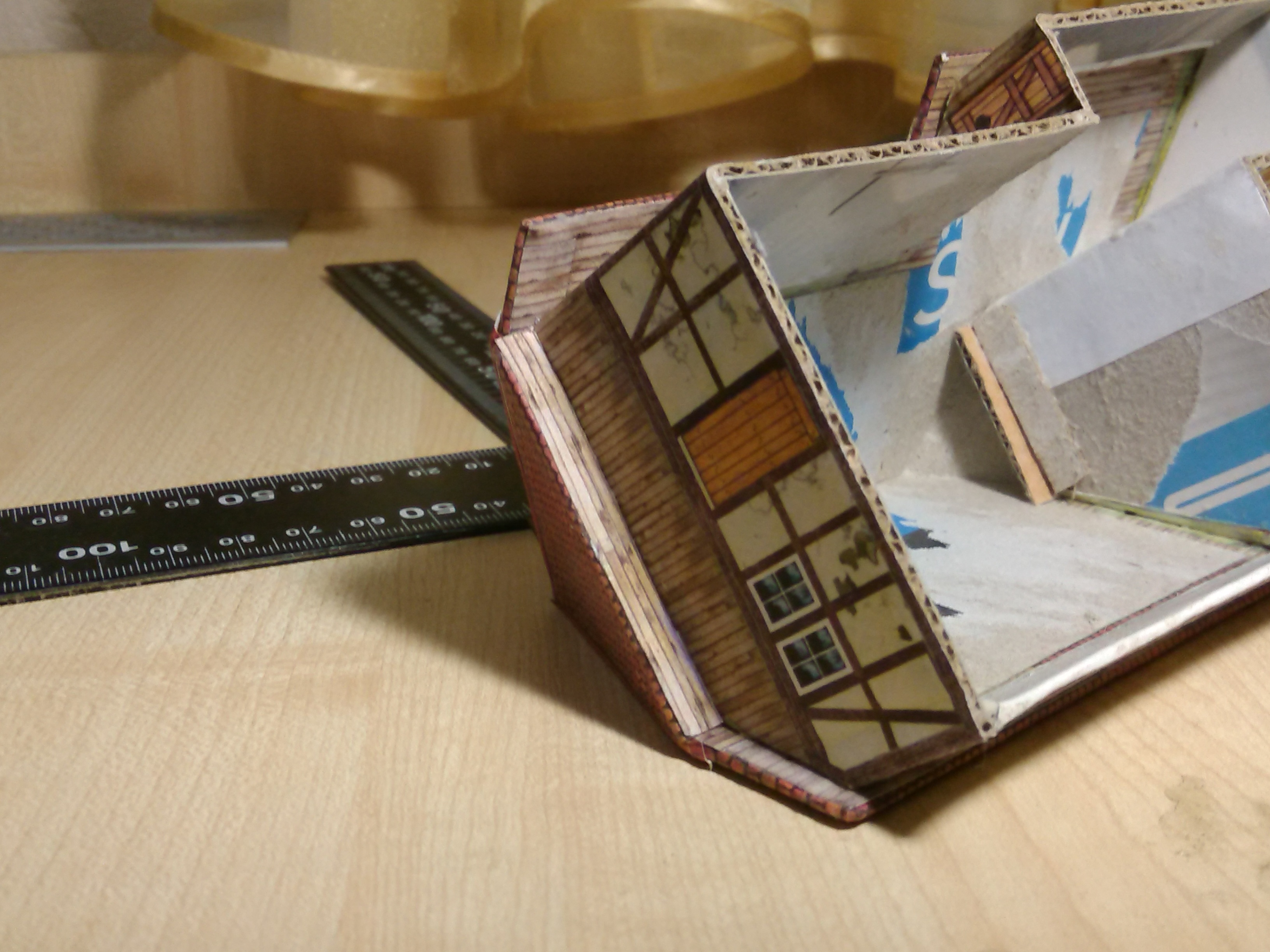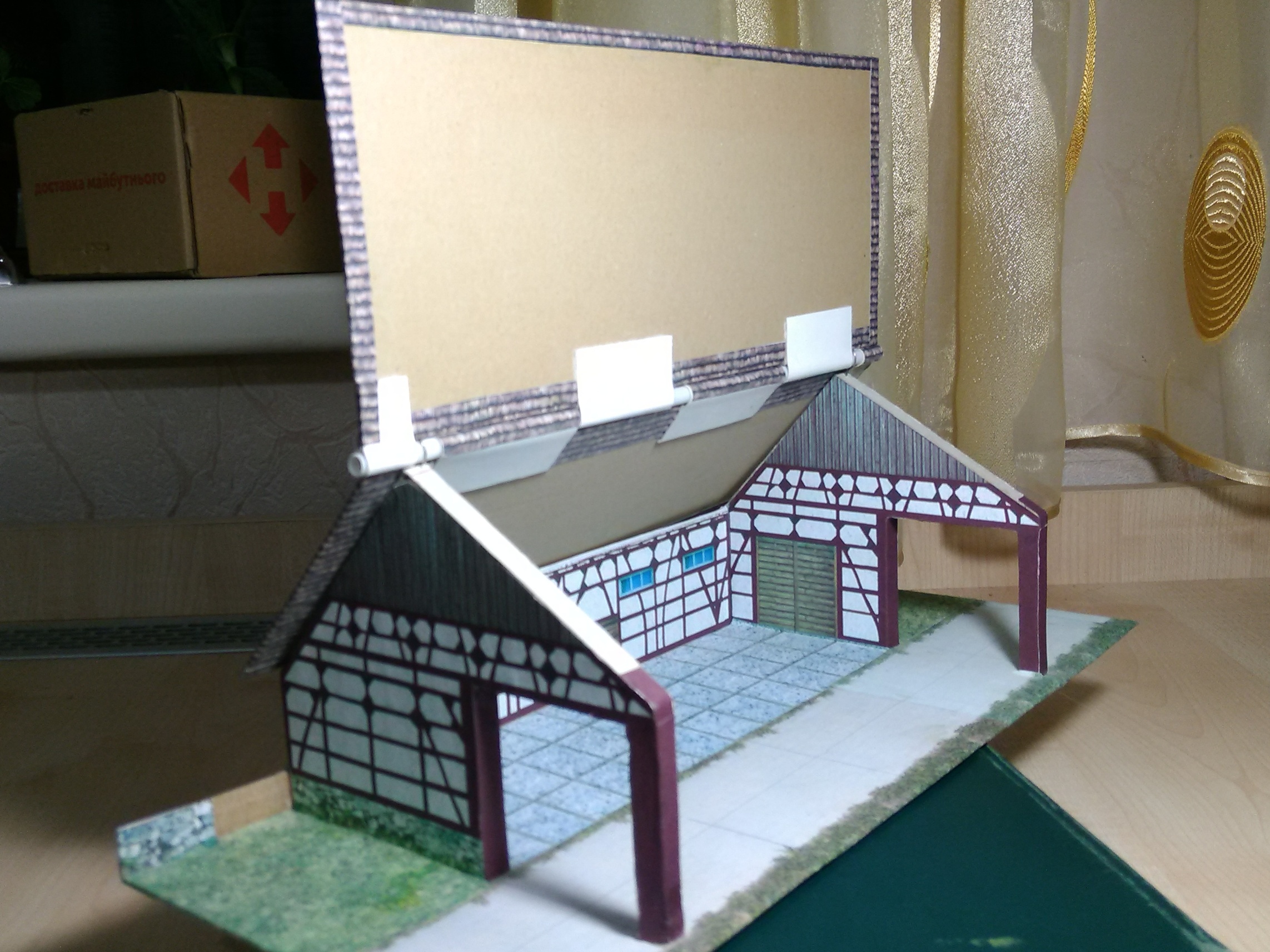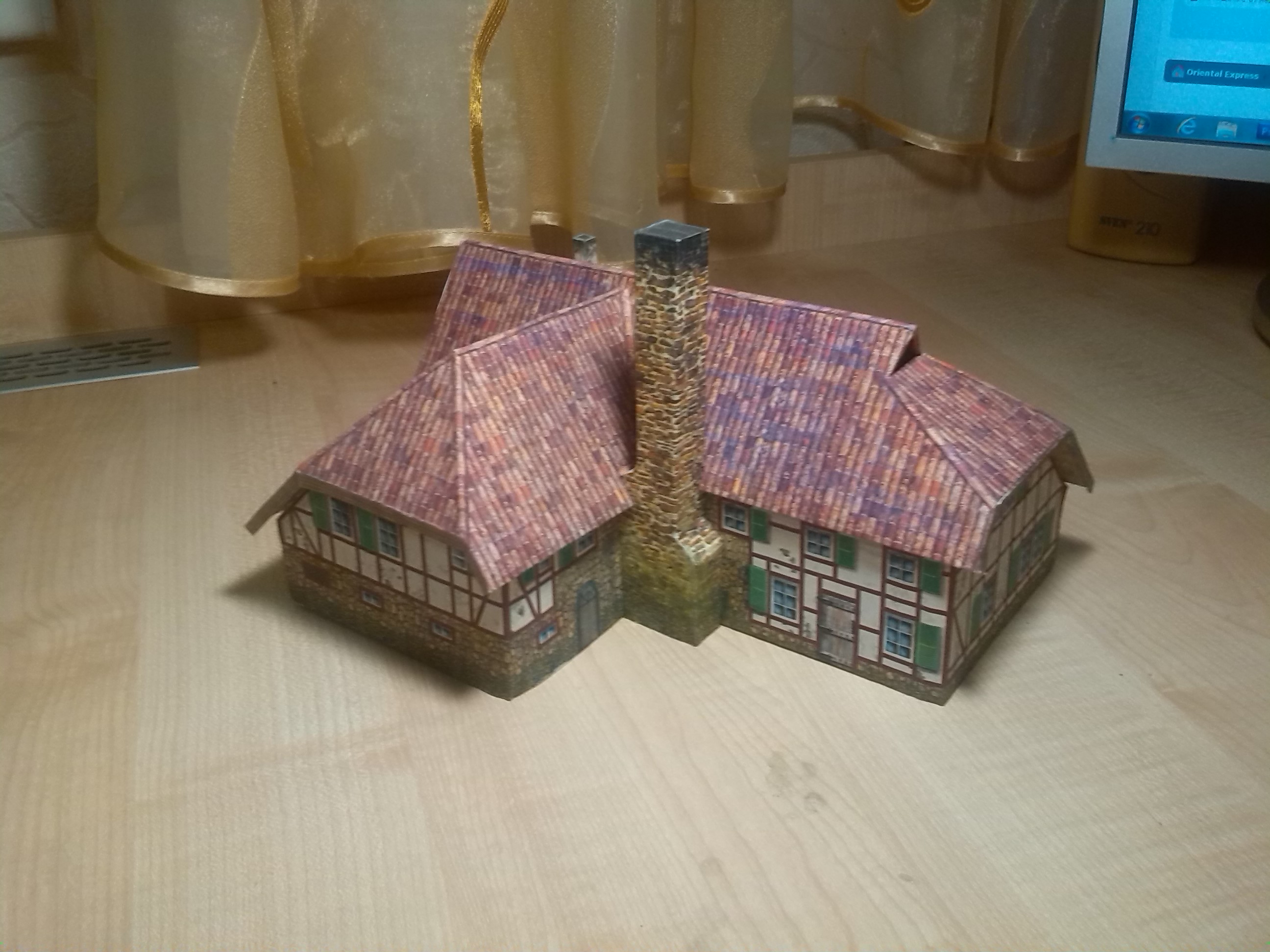 Дальше пошел процесс изготовления в Фотошопе цветной развертки по уже имеющимся размерам. Тут все сделано с нуля из головы с использованием фотоматериалов по немецким фахверковым домам. Окна, ставни, двери, текстуры каменной кладки, штукатурки ну т.д. - все из сети. Эффект обрастания стен мхом - на текстуру готовой стены нанесено несколько слоев зеленого разных оттенков, кое-где добавлено тени, в общем поигрался цветами. Тени в окнах, под ставнями, под крышей тоже прорисовал. Распечатал и обклеил. Все. К сожалению сам процесс не документировался, но с другой стороны все вроде понятно. Если что - спрашивайте.