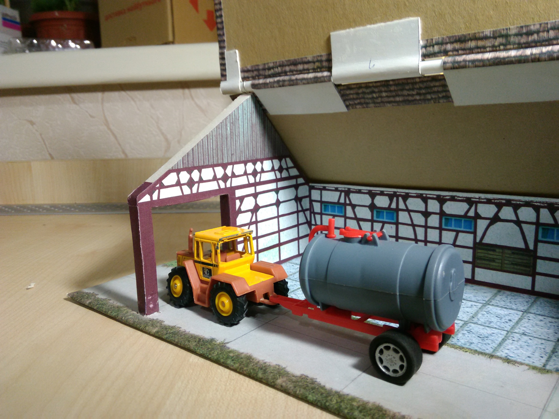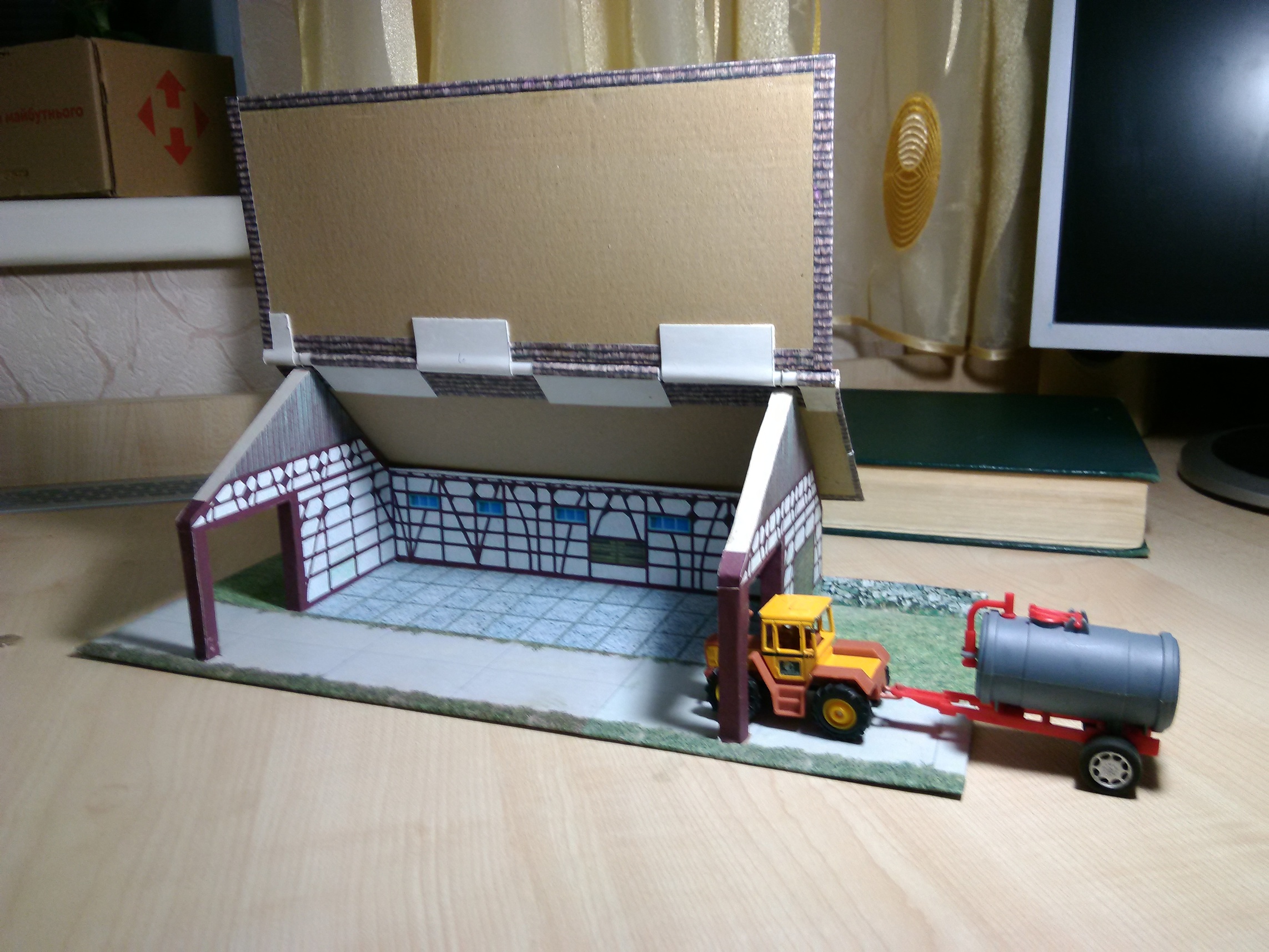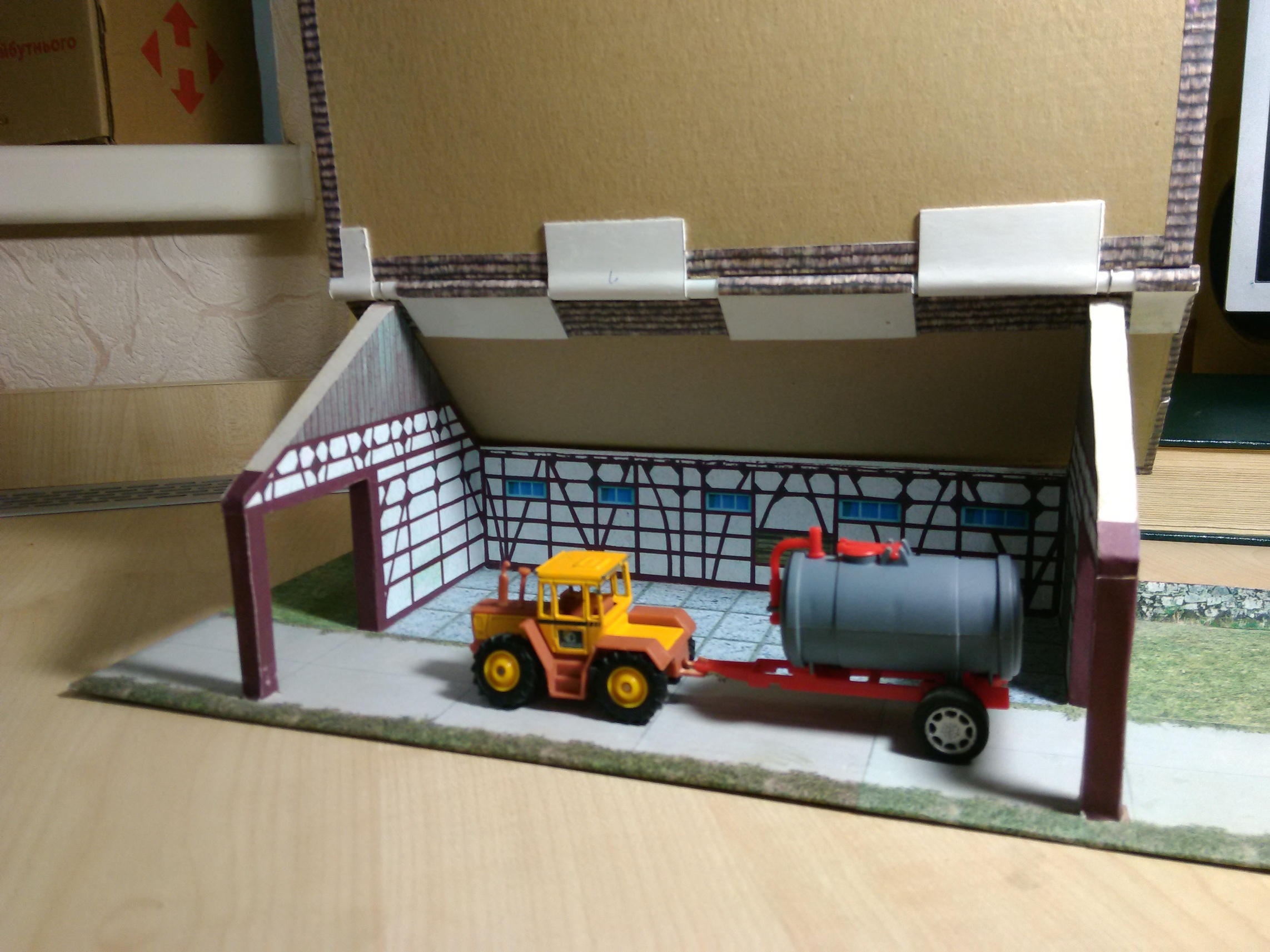 Здравствуйте все. Решил тоже поделиться с народом своими постройками из картона. Скажу сразу делались домики не как модели, а делались для игры. У нас накопилось большое количество всяких тракторов в масштабе 1/87 (фирма Siku и др.) и сыну срочно потребовалась ферма. Ну вот и для этого и были сделаны несколько домиков.