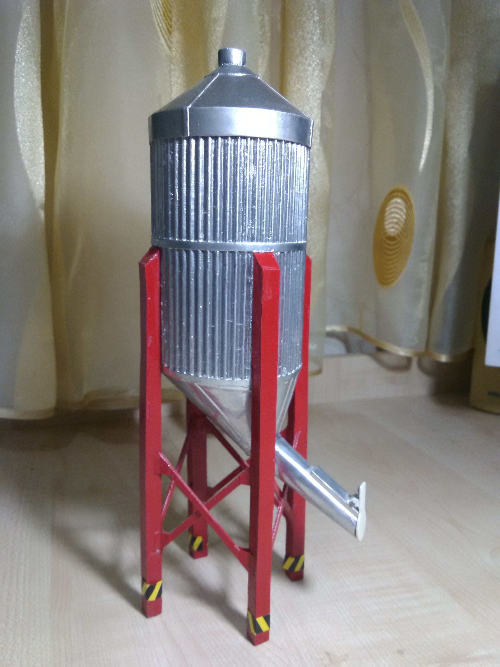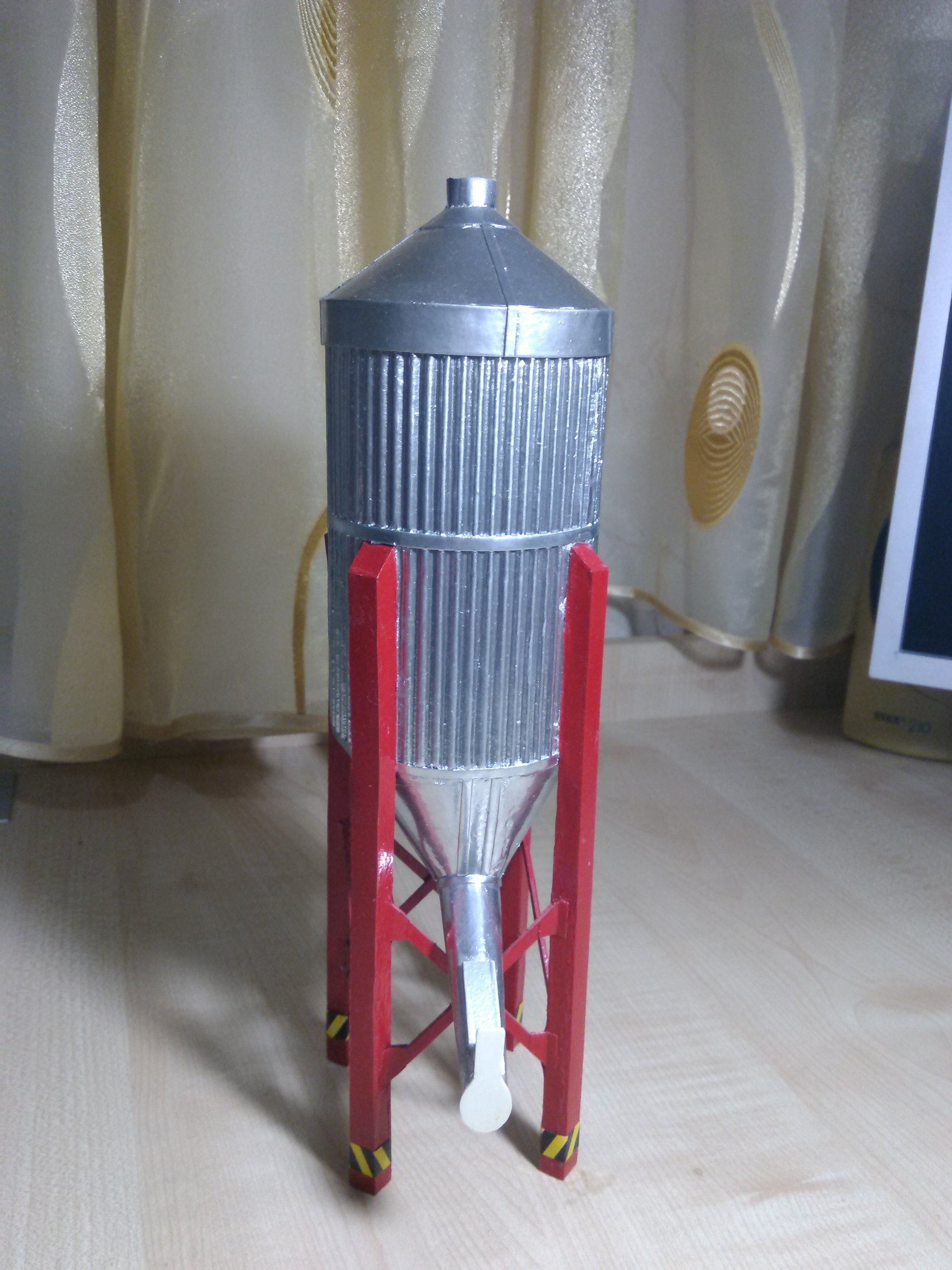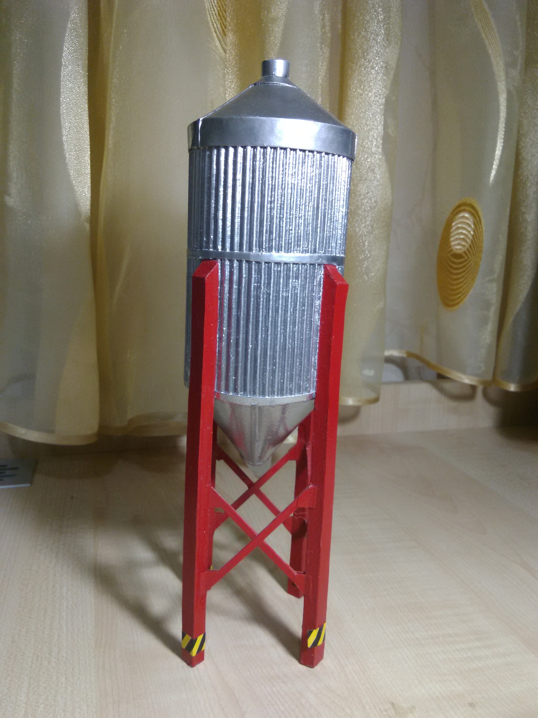 Зернохранилище сделано из картонной коробки от конструктора типа Лего. Там тоненький такой гофрокартон около 3-х мм. Для получения профиля надо одну сторону несильно намочить губкой. Буквально через несколько минут бумага отойдет от гофрированного слоя - получаем готовую заготовку. ЕЕ можно использовать для имитации шифера на домах, а если взять гофрокартон от обычной коробки, то гофру можно использовать для имитации вспаханного поля- покрасить, присыпать - классные такие борозды получаются. Из полученной гофры склеил корпус хранилища. Верхняя крышка и нижний конус - из плотного картона. После прогрунтовал несколько раз. И дальше самый ответственный момент - чтобы было похоже на металл надо обрезать ворсинки, которые после грунтования хорошо счищаются лезвием. Дело муторное, но того стоит. После обрезки я еще прогрунтовал пару раз и подрезал то что еще вылезло. Потом покрасил краской из баллона "Хром" в несколько слоев. Это надо для того чтобы краска заполнила поры в бумаге, все неровности и т.п. чтобы выглядело как метал - гладенько. В дальнейшем можно как-нибудь состарить, добавить ржавчины или еще что. Опоры сделаны тоже из гофрокартона, обклеены бумагой, прогрунтованы и покрашены. За суперкачеством не гнался - делалось для игры. Для макета сделал бы их из пластика.