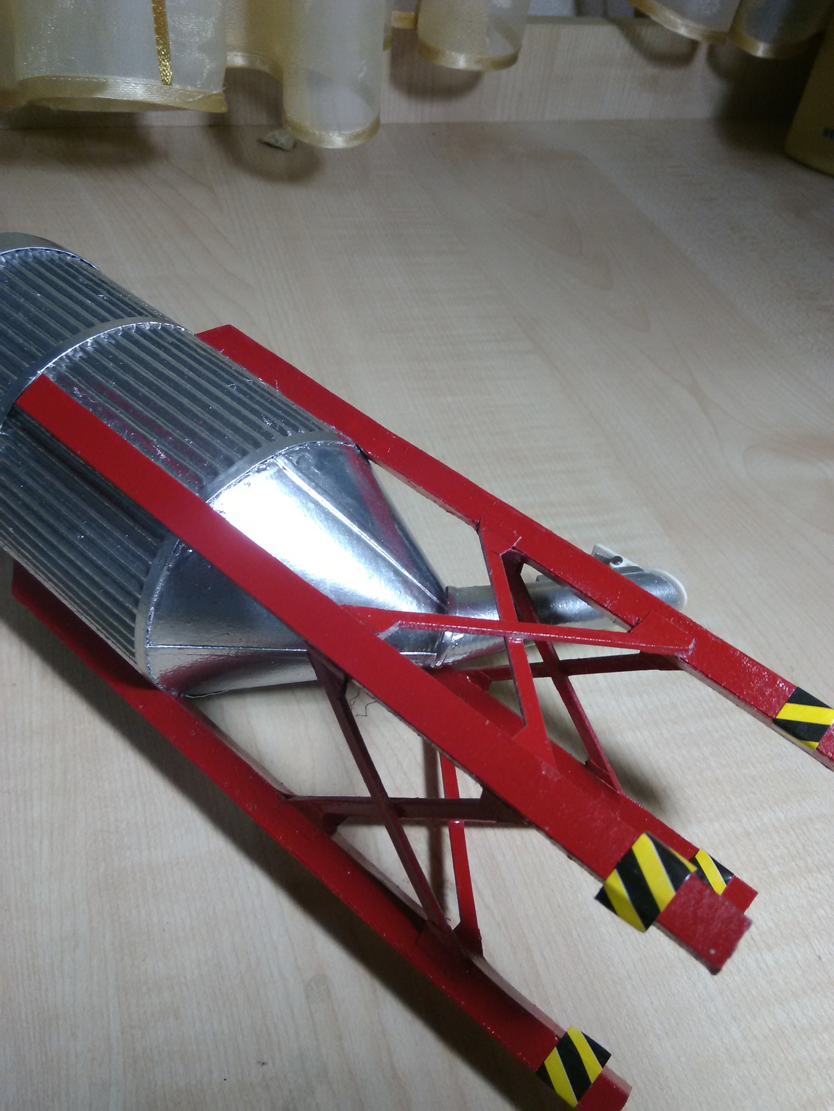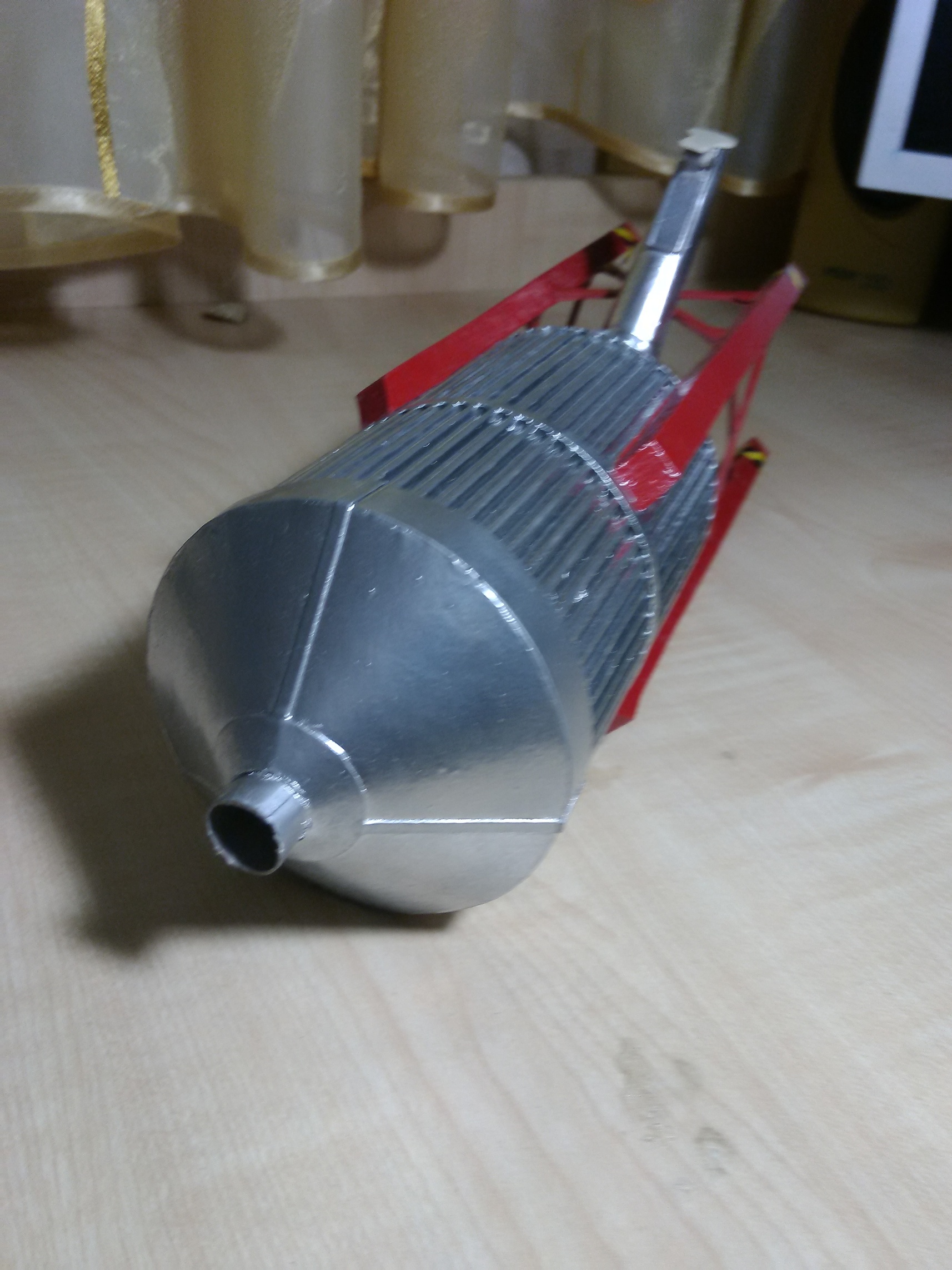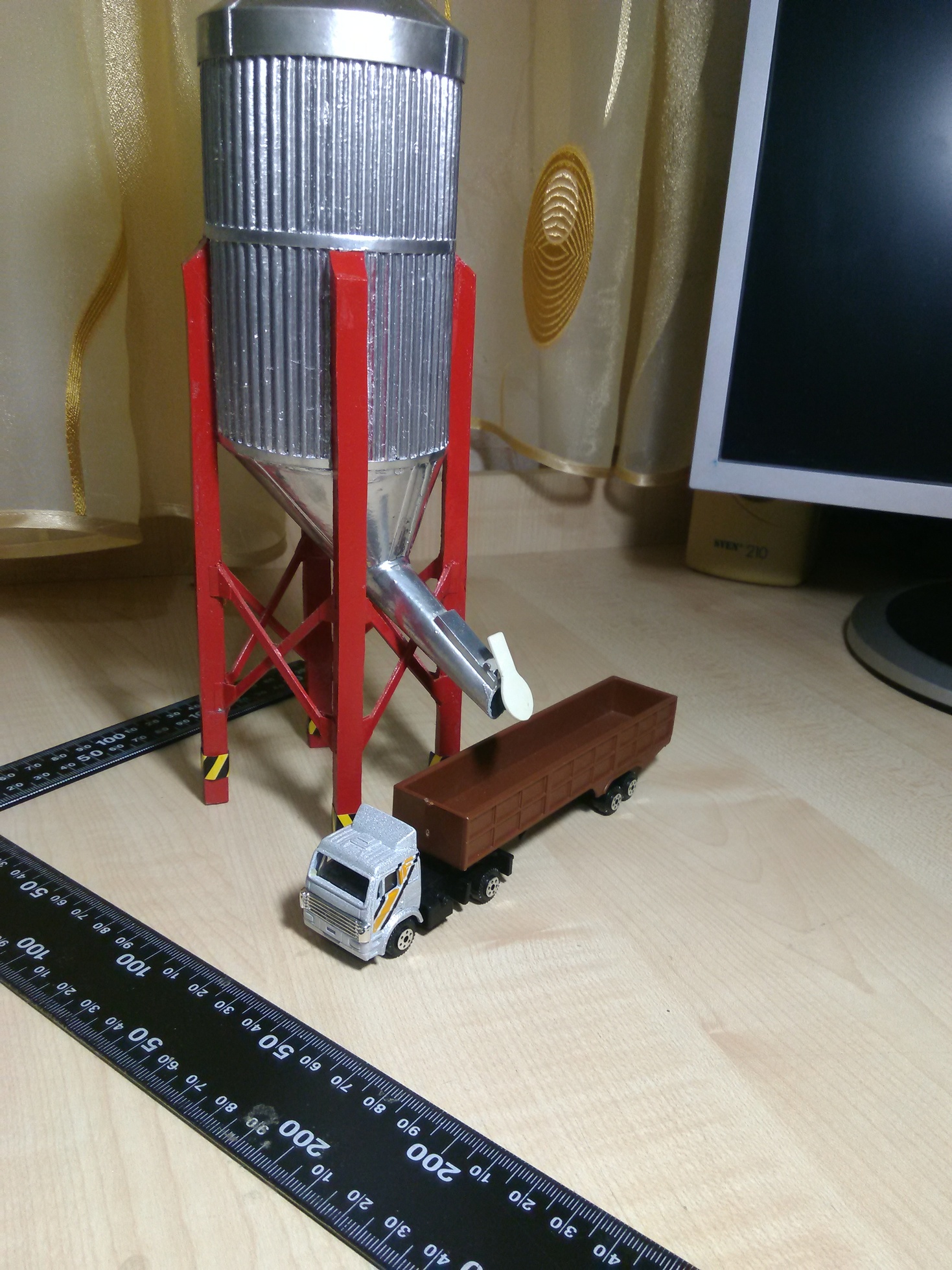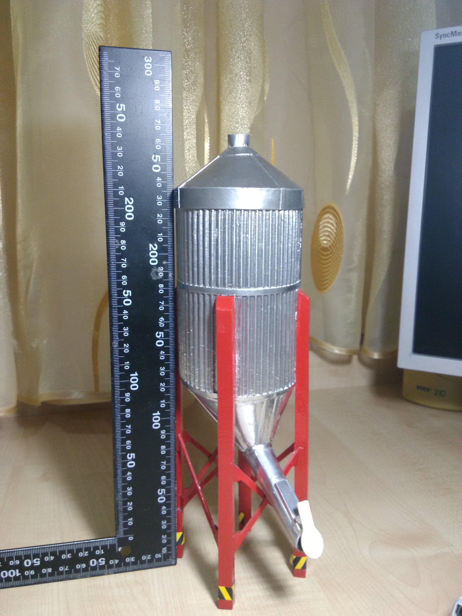 Зернохранилище сделано из картонной коробки от конструктора типа Лего. Там тоненький такой гофрокартон около 3-х мм. Для получения профиля надо одну сторону несильно намочить губкой. Буквально через несколько минут бумага отойдет от гофрированного слоя - получаем готовую заготовку. ЕЕ можно использовать для имитации шифера на домах, а если взять гофрокартон от обычной коробки, то гофру можно использовать для имитации вспаханного поля- покрасить, присыпать - классные такие борозды получаются. Из полученной гофры склеил корпус хранилища. Верхняя крышка и нижний конус - из плотного картона. После прогрунтовал несколько раз. И дальше самый ответственный момент - чтобы было похоже на металл надо обрезать ворсинки, которые после грунтования хорошо счищаются лезвием. Дело муторное, но того стоит. После обрезки я еще прогрунтовал пару раз и подрезал то что еще вылезло. Потом покрасил краской из баллона "Хром" в несколько слоев. Это надо для того чтобы краска заполнила поры в бумаге, все неровности и т.п. чтобы выглядело как метал - гладенько. В дальнейшем можно как-нибудь состарить, добавить ржавчины или еще что. Опоры сделаны тоже из гофрокартона, обклеены бумагой, прогрунтованы и покрашены. За суперкачеством не гнался - делалось для игры. Для макета сделал бы их из пластика.